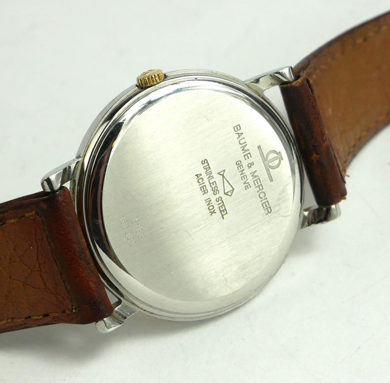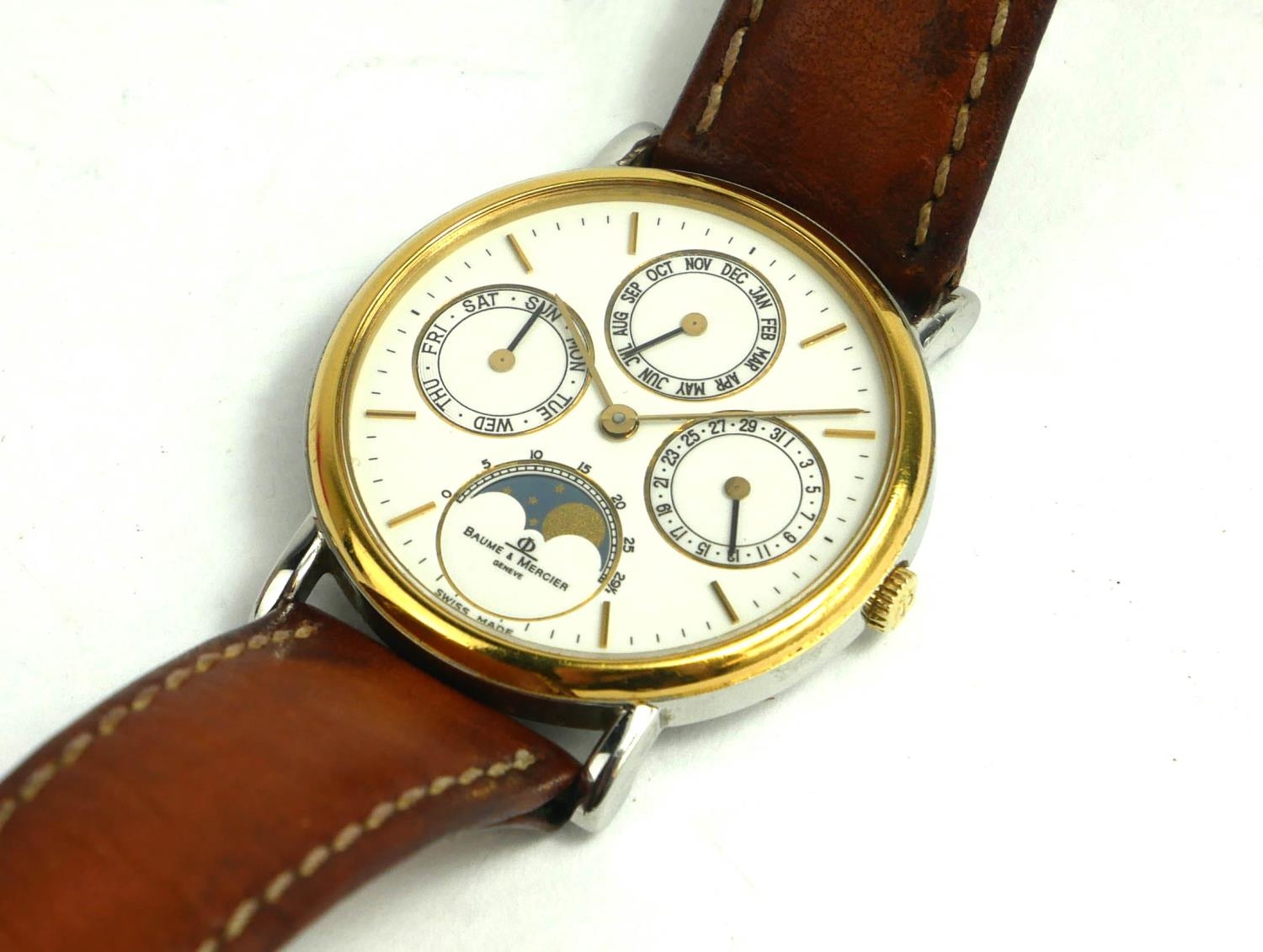 BAUME AND MERCIER, AN 18CT GOLD PLATE AND STAINLESS STEEL TRIPLE CALENDAR MOONPHASE GENT’S WRISTWATCH