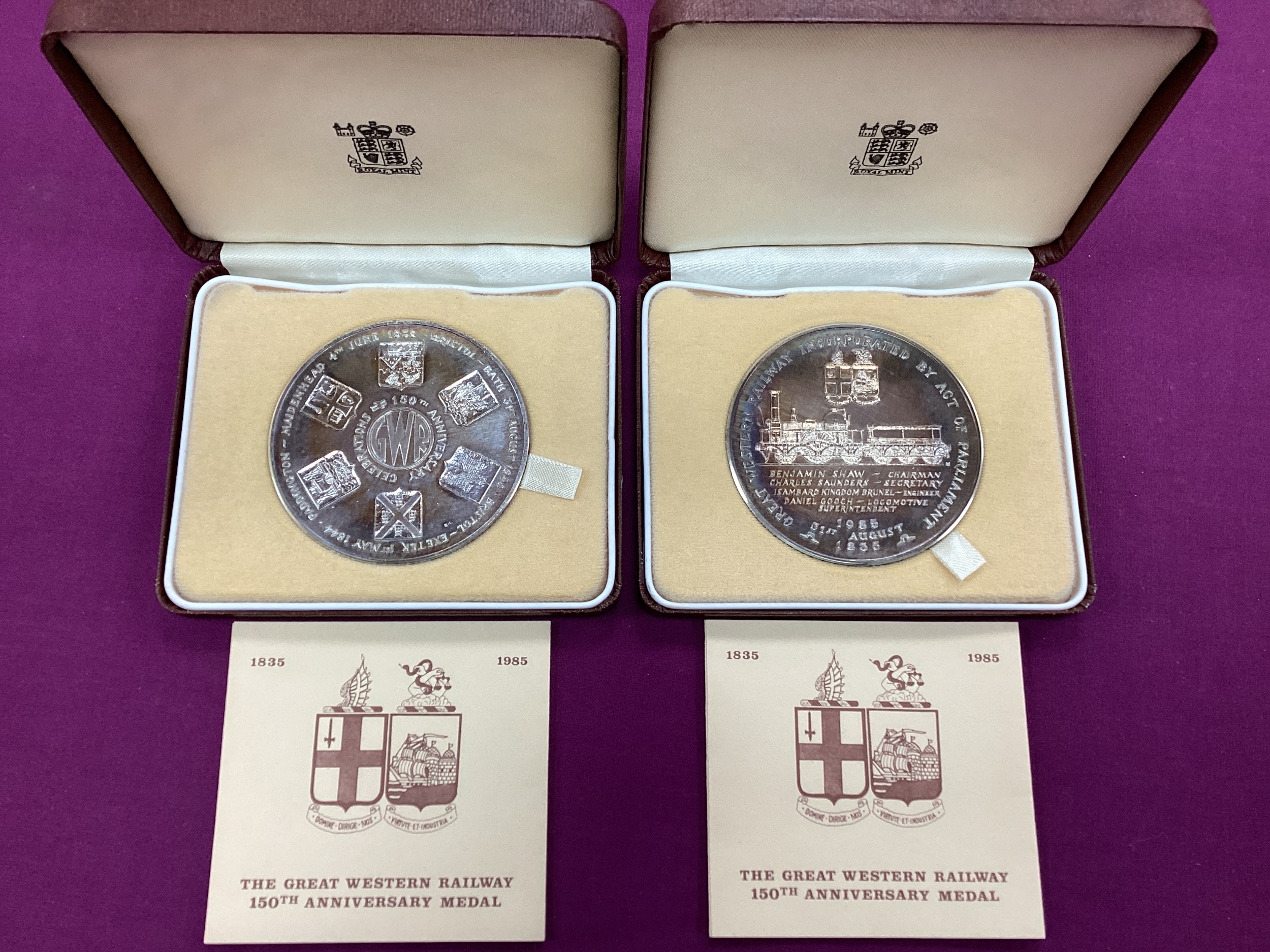 Two 1985 Royal Mint Sterling Silver Medals, to commemorate the 'Great Western Railway 150th Anniversary', each weighing 152g, cased with certificates of authenticity.