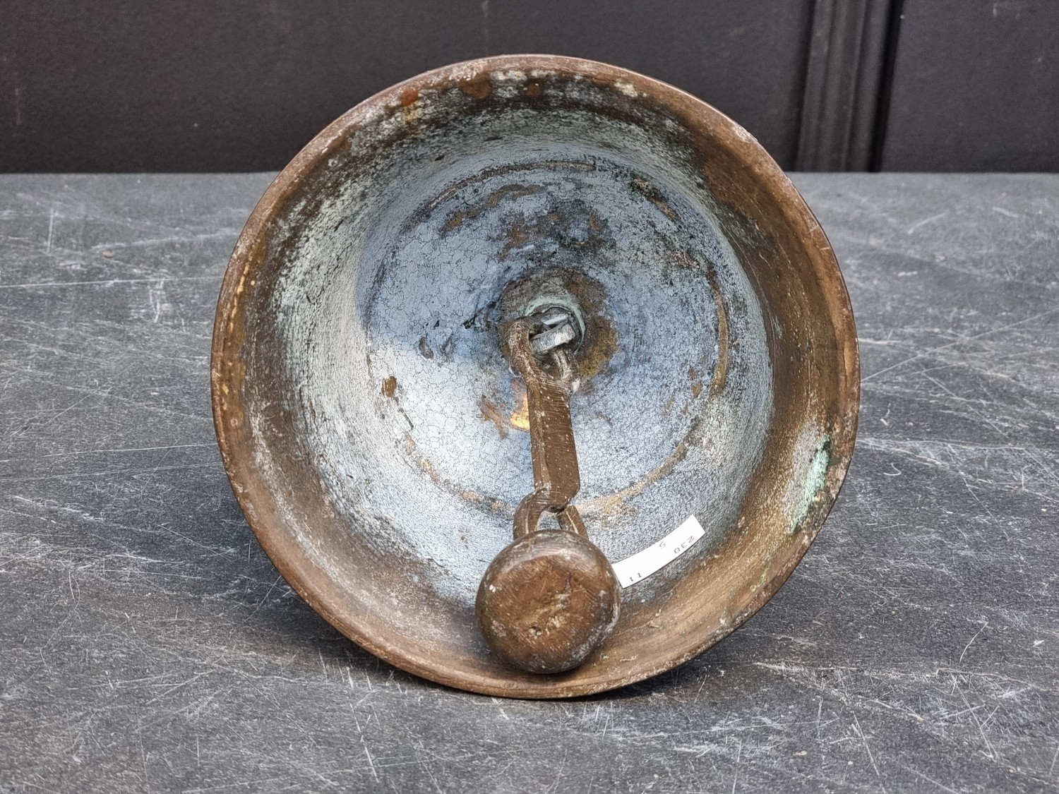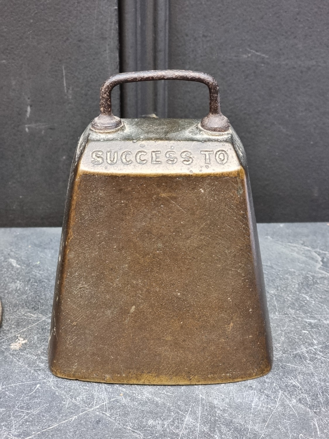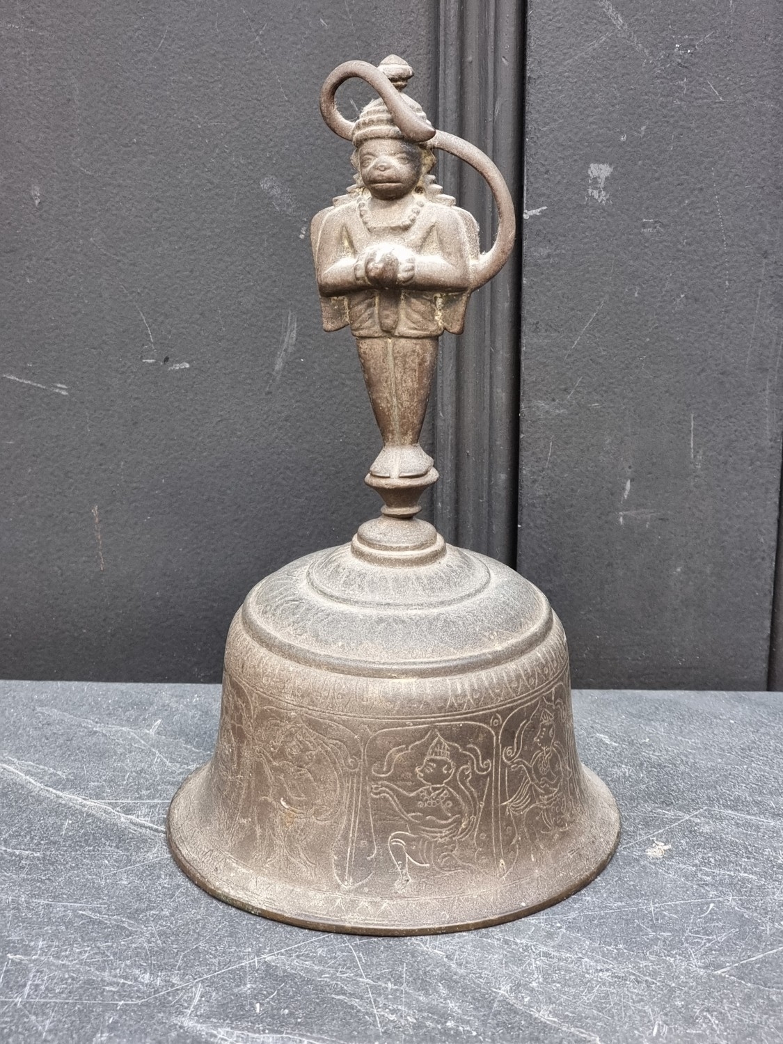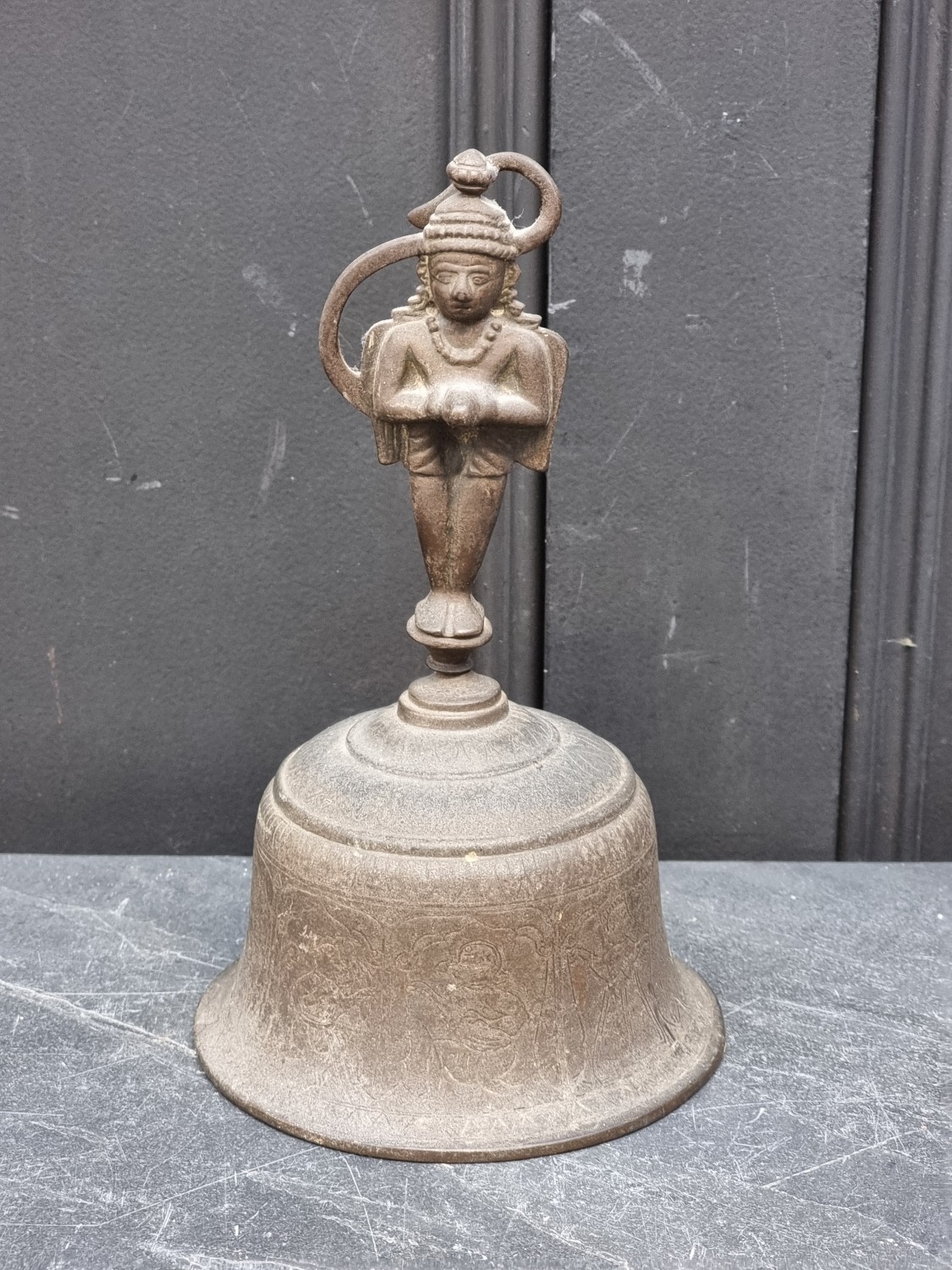 A 19th century Indian bronze bell, 23.5cm high; together with another bronze bell, inscribed 'Success To Horse Teams', 14cm high. (2)