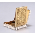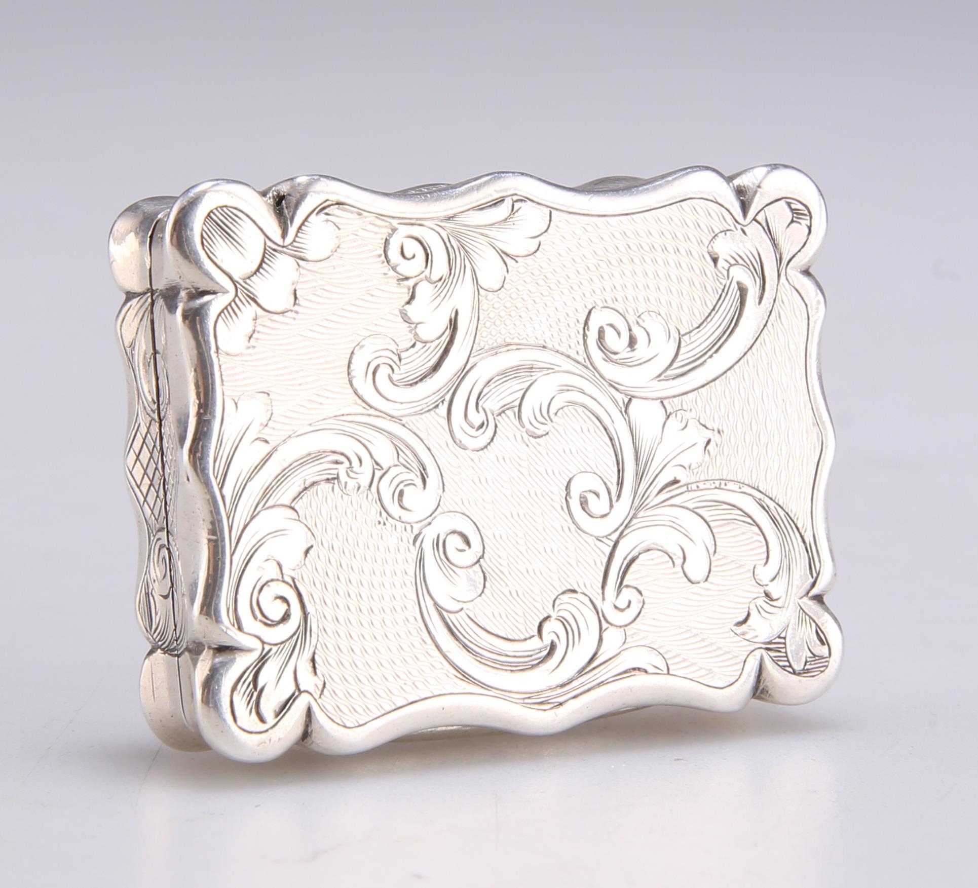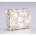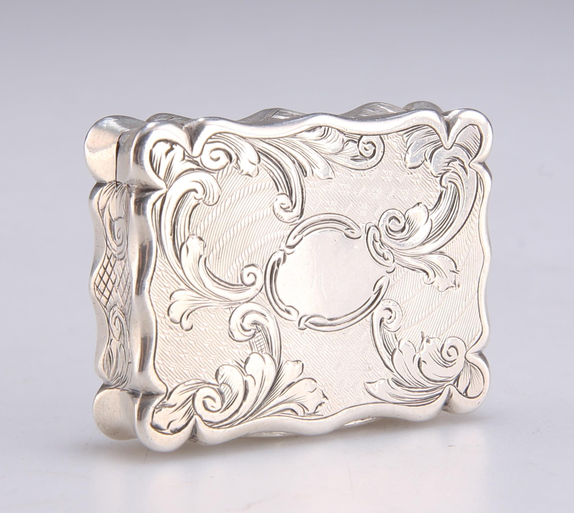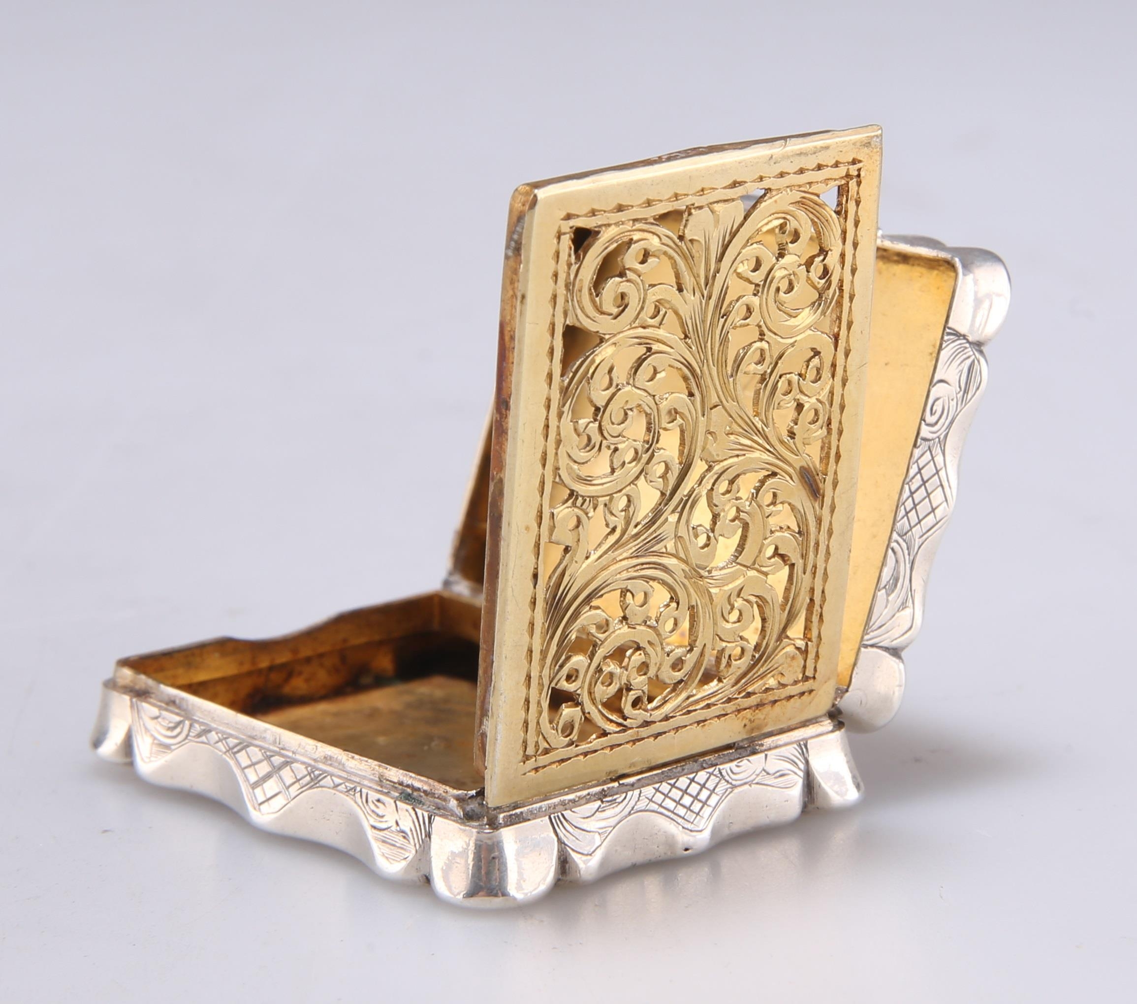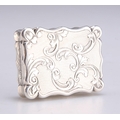 by Edward Smith, Birmingham 1845, shaped rectangular with a hinged cover, the engine-turned ground engraved with scrolling foliage, the interior with pierced and engraved foliate gilt grille. 4.2cm wide