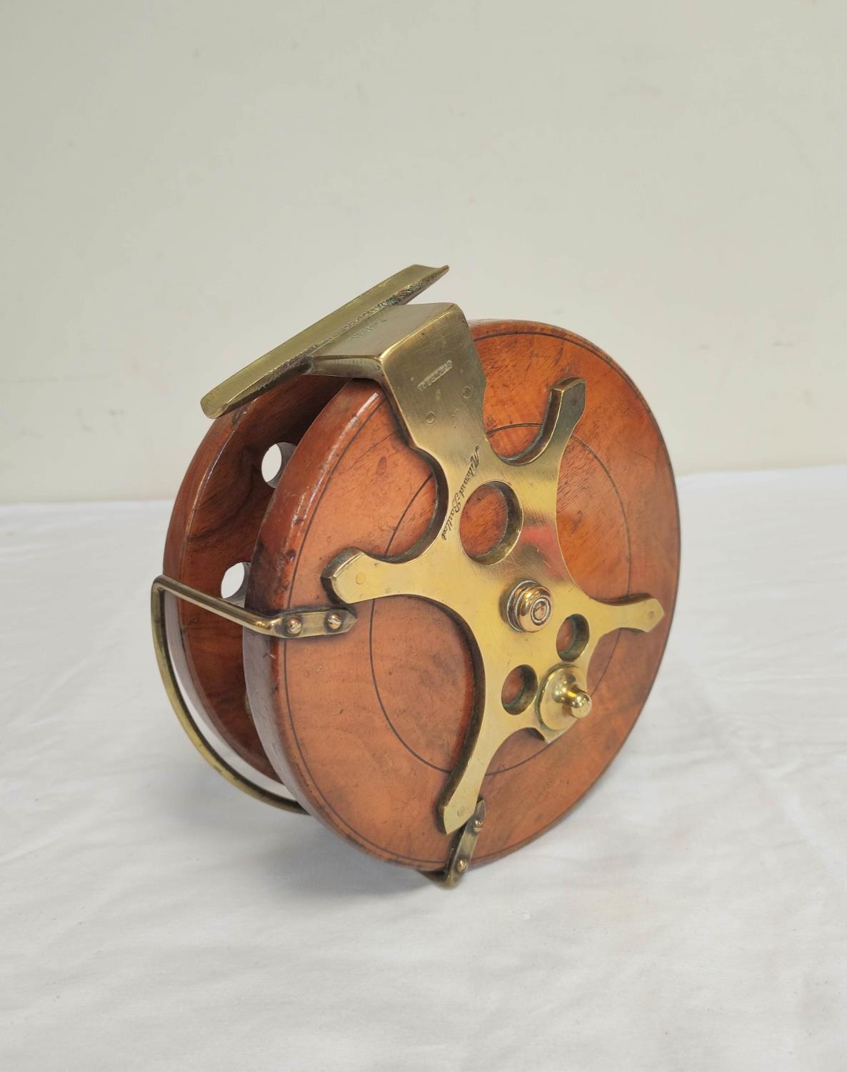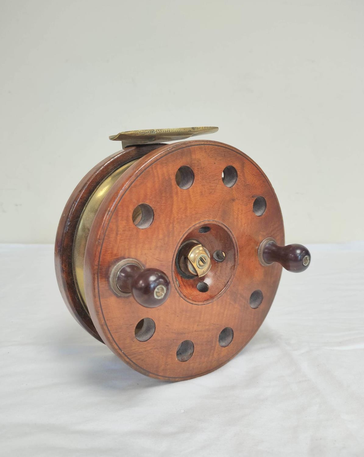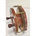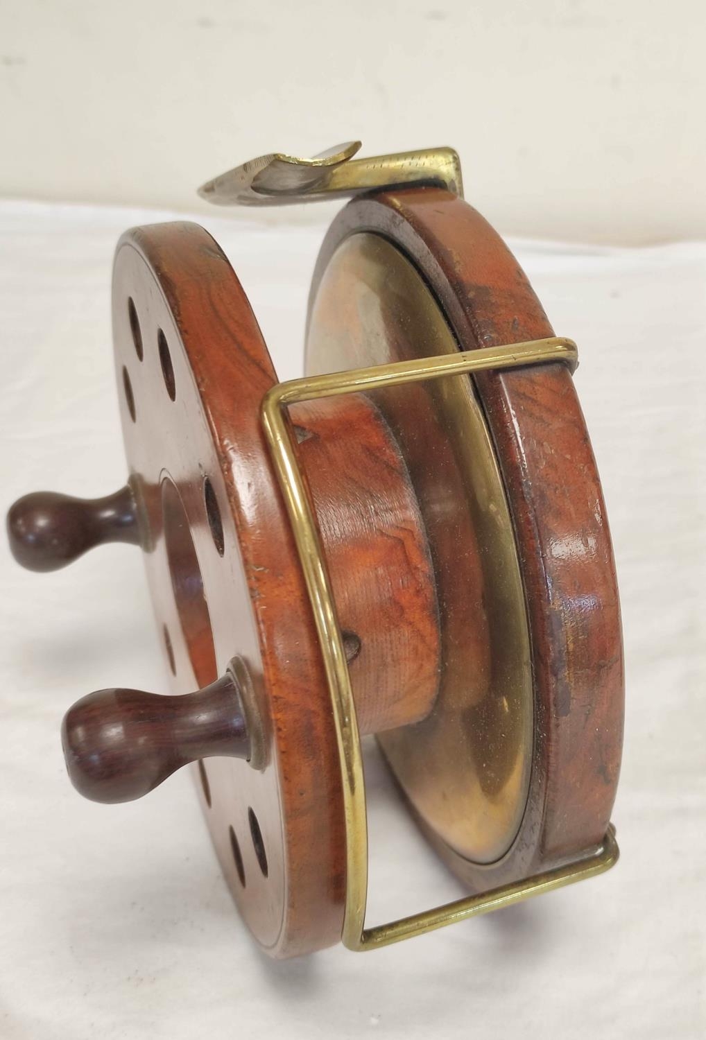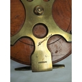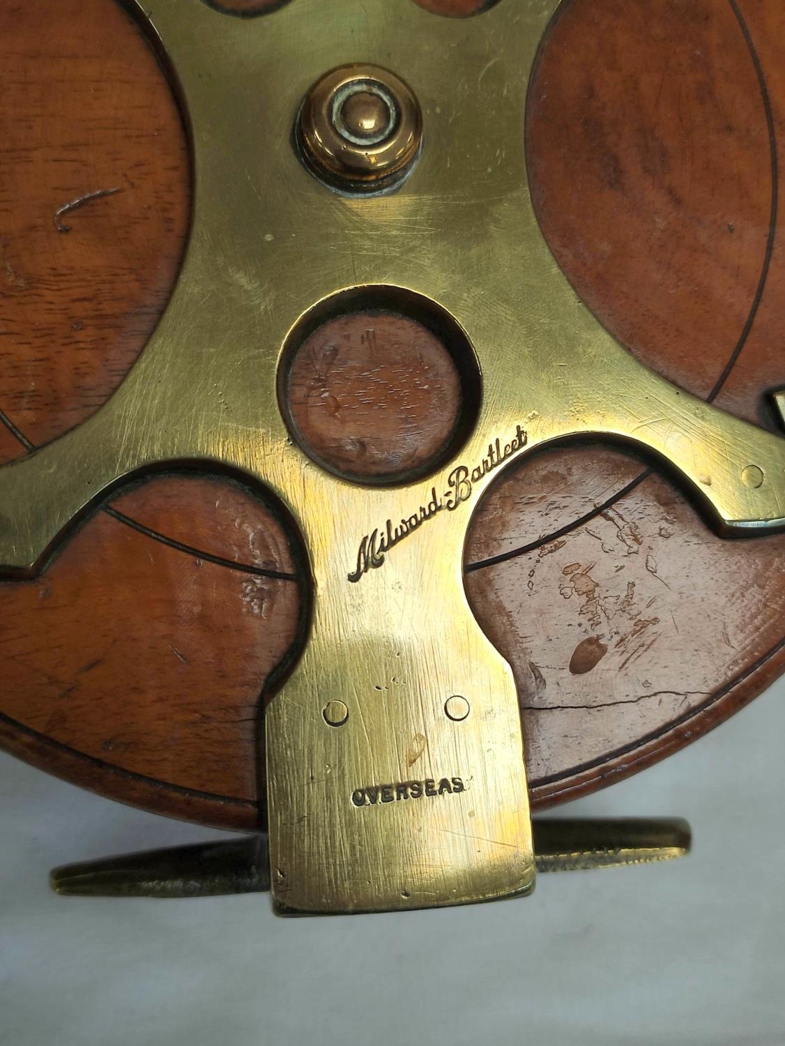 Antique Milward-Bartleet of Redditch post 1926 walnut and brass bound 7" "Overseas" fishing reel with central breaknut tension adjuster and rosewood handles.