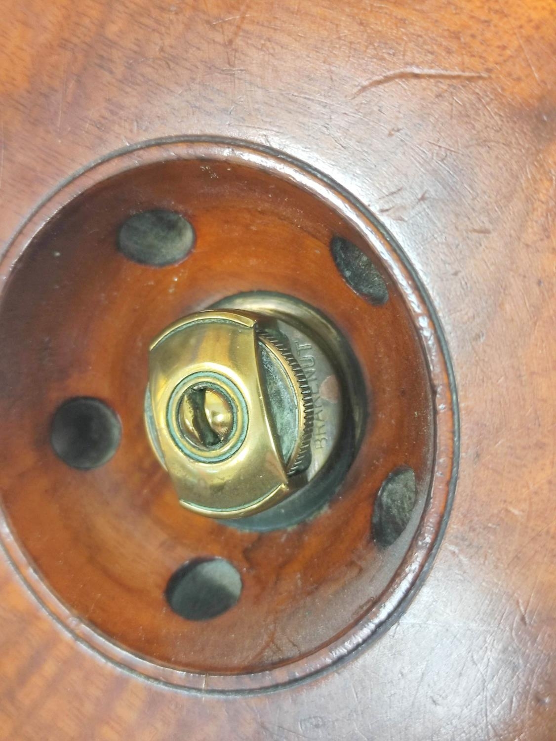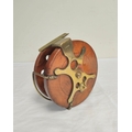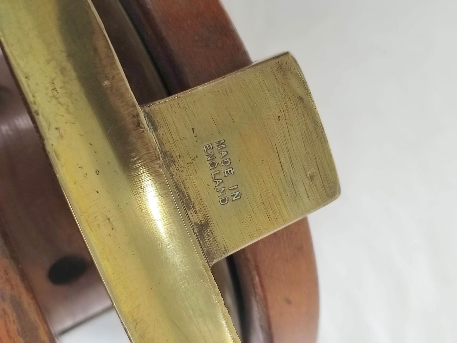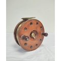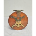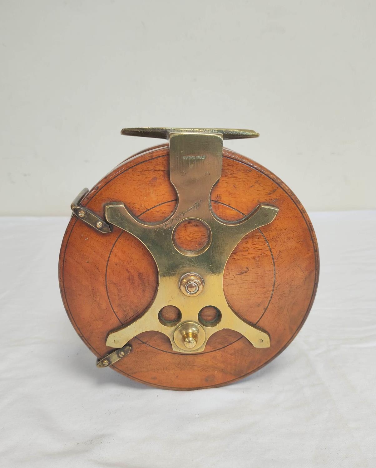 Antique Milward-Bartleet of Redditch post 1926 walnut and brass bound 7" "Overseas" fishing reel with central breaknut tension adjuster and rosewood handles.