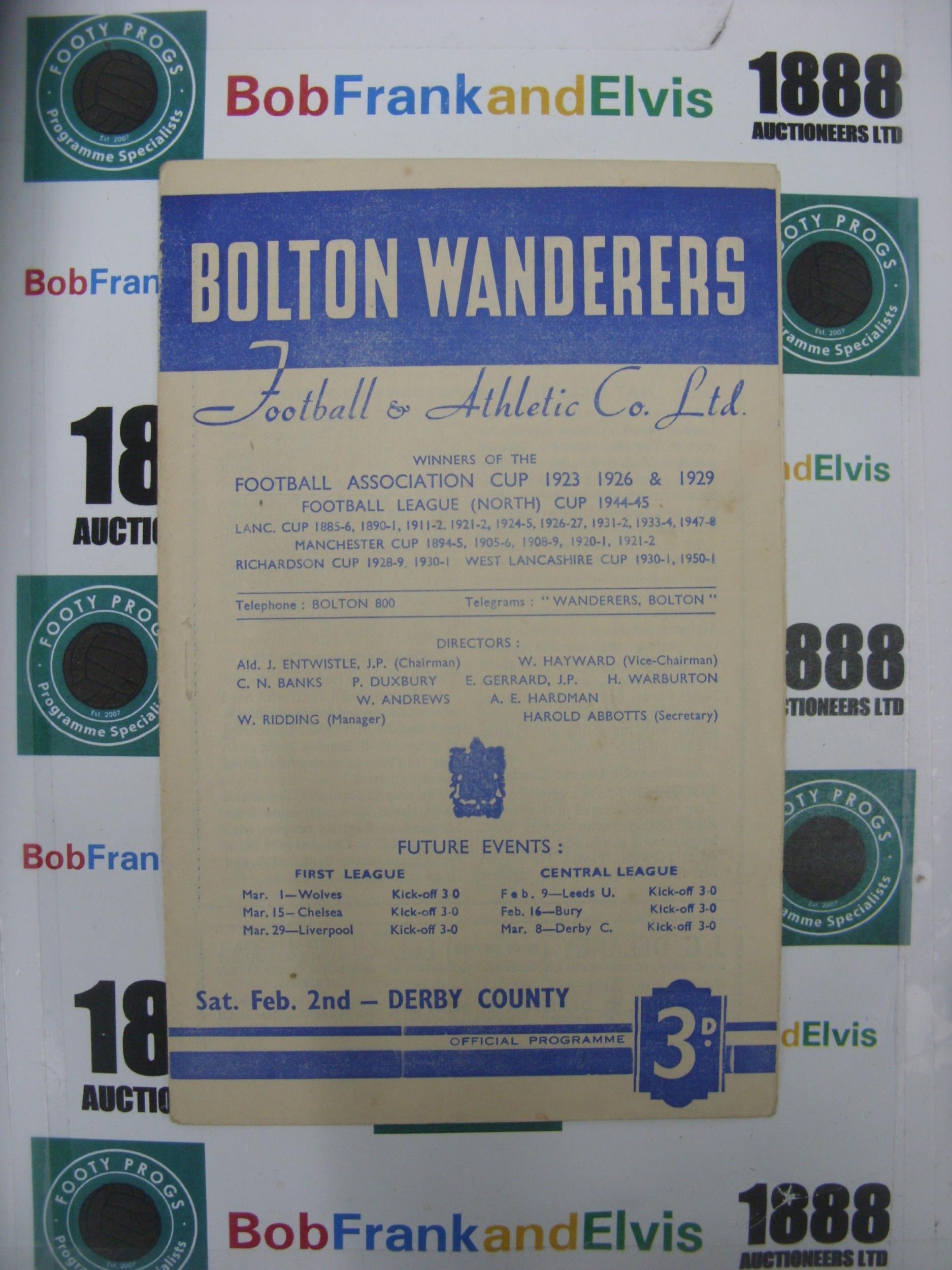 BOLTON WANDERERS, 1951/1952, a football programme from the game versus Derby County, played on 02/02/1952 (folded).