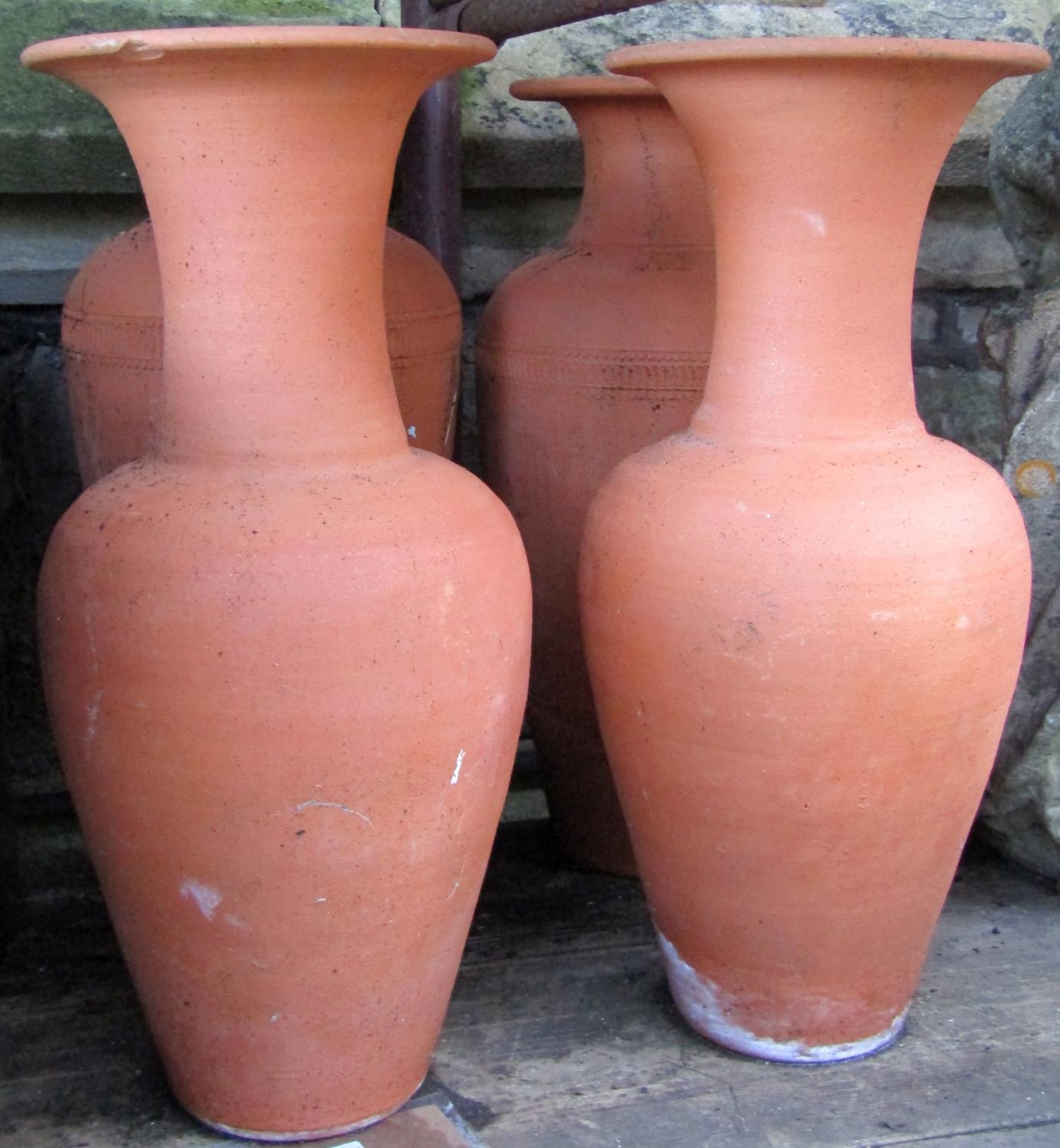 Four (two pairs) of contemporary terracotta vases (varying design), 50 cm high approximately