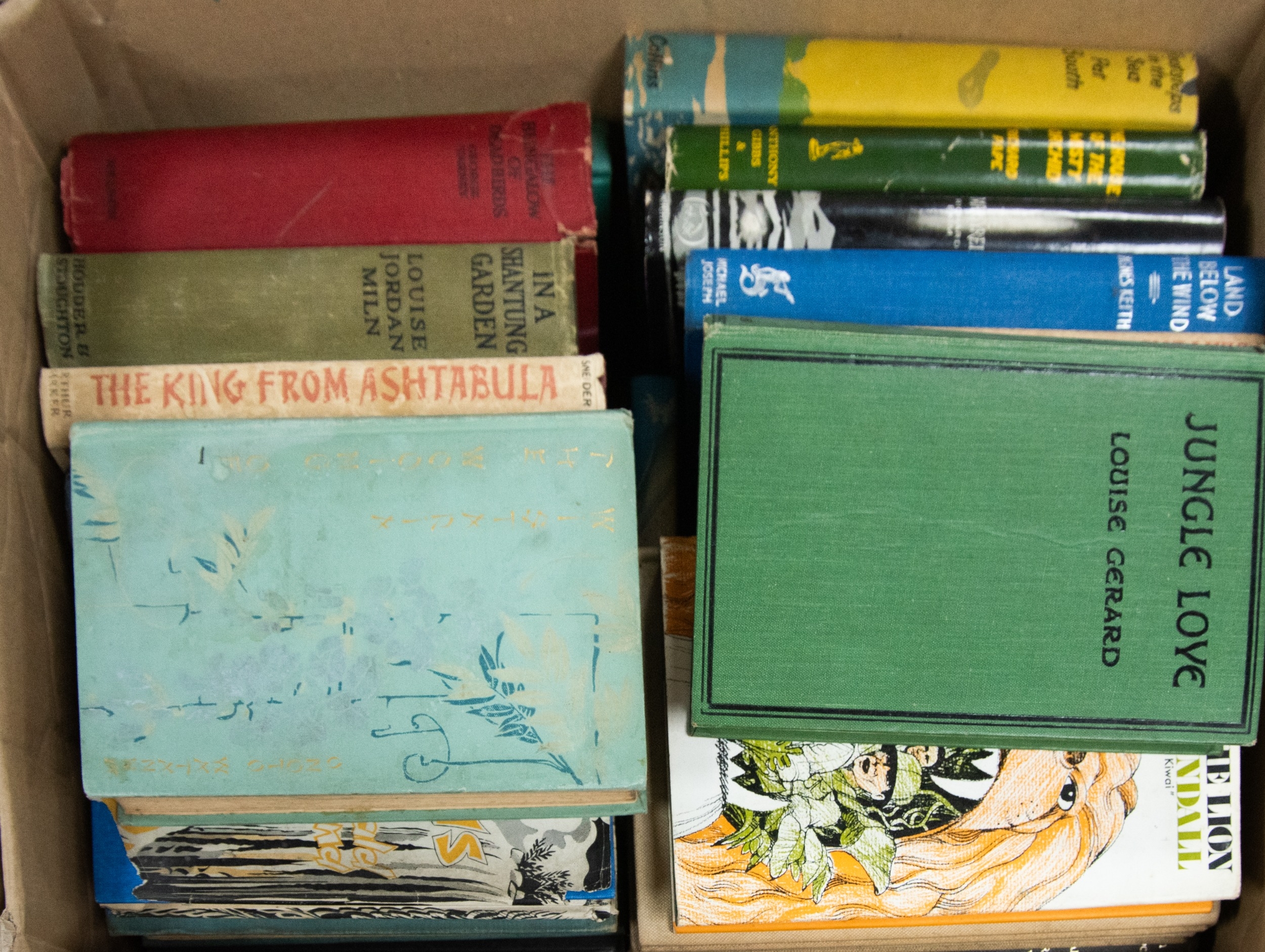 Michael Hastings - Death in Deep Green, pub Methuen, 1952, dj price 10s 6d net, artist JOHN MINTON. OSWALD WYND - Moon of the Tiger, pub Cassell, 1958, 1st ed, dj. Together with a further group of COLONIAL FICTION, mainly relating to SOUTH EAST ASIA & THE ORIENT, various authors to include LOUISE GERARD, EDWARD THOMPSON, JOHN SLIMMING, ONOTO WATANNA amongst others. Contents of a box