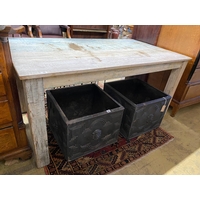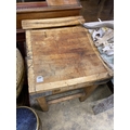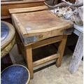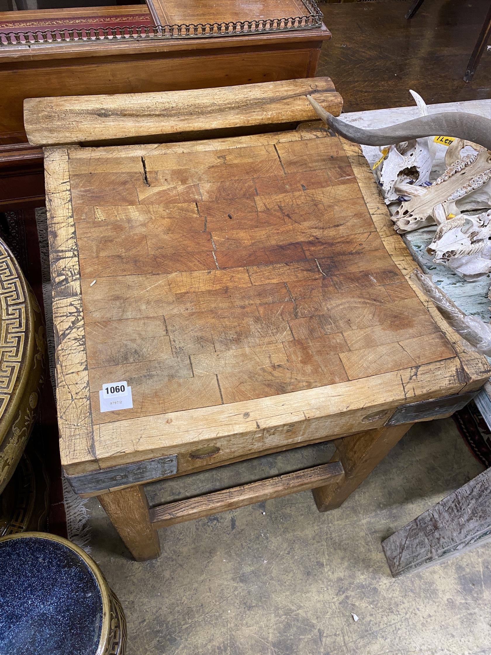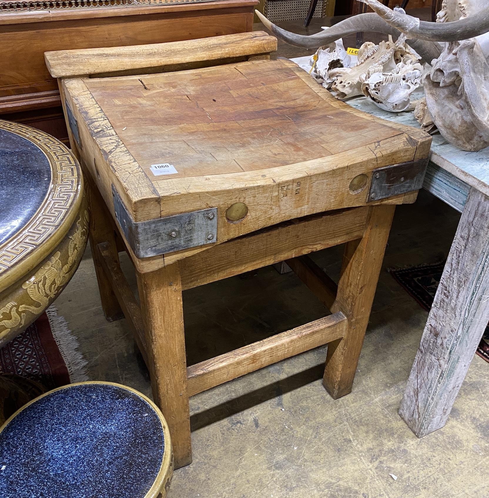 A Victorian iron bound pine butcher's block, width 61cm, depth 70cm, height 86cm