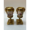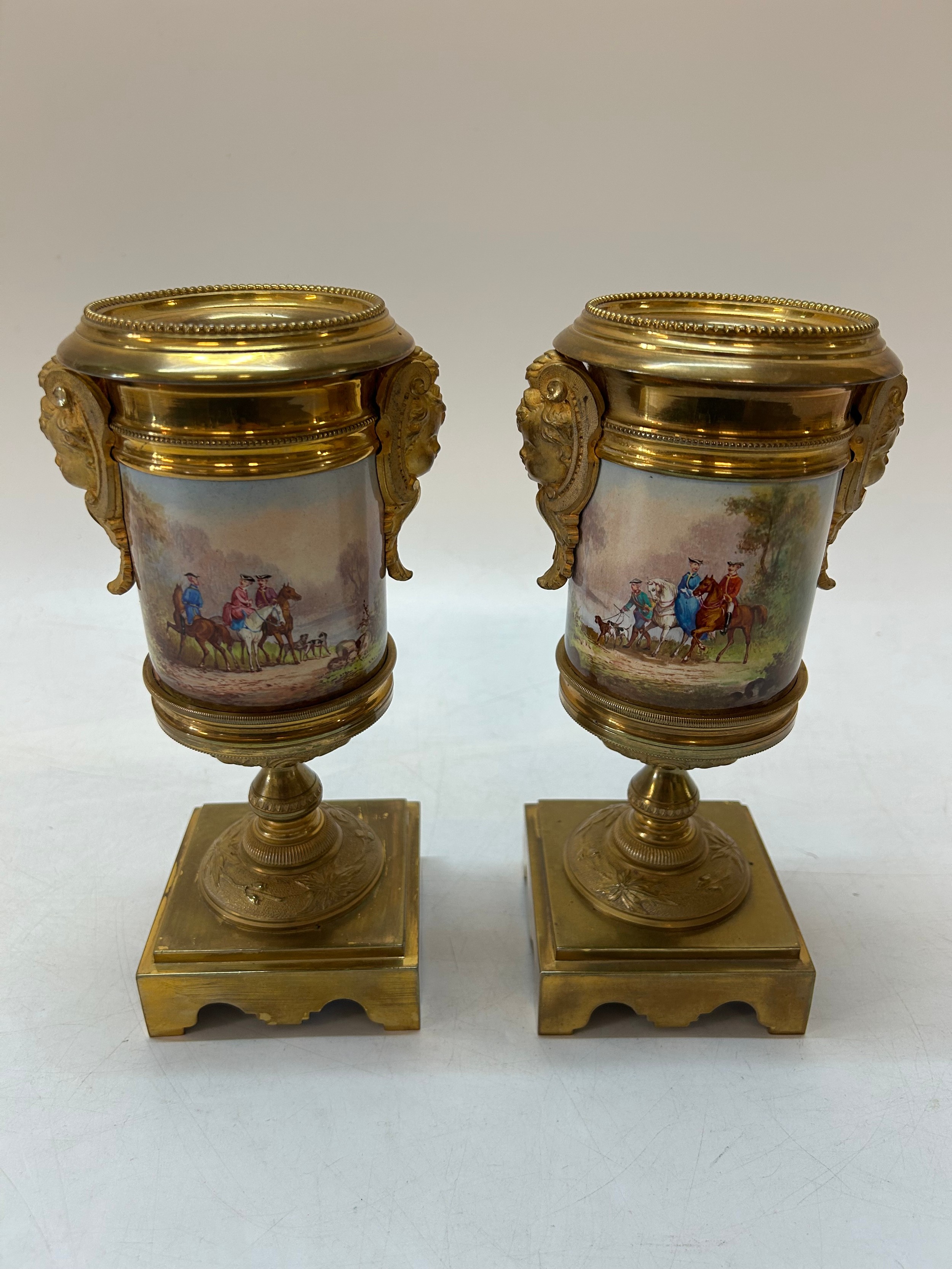A pair of French porcelain vases decorated horsemen and dogs in landscapes, mounted in two colour ormolu - 9in. high