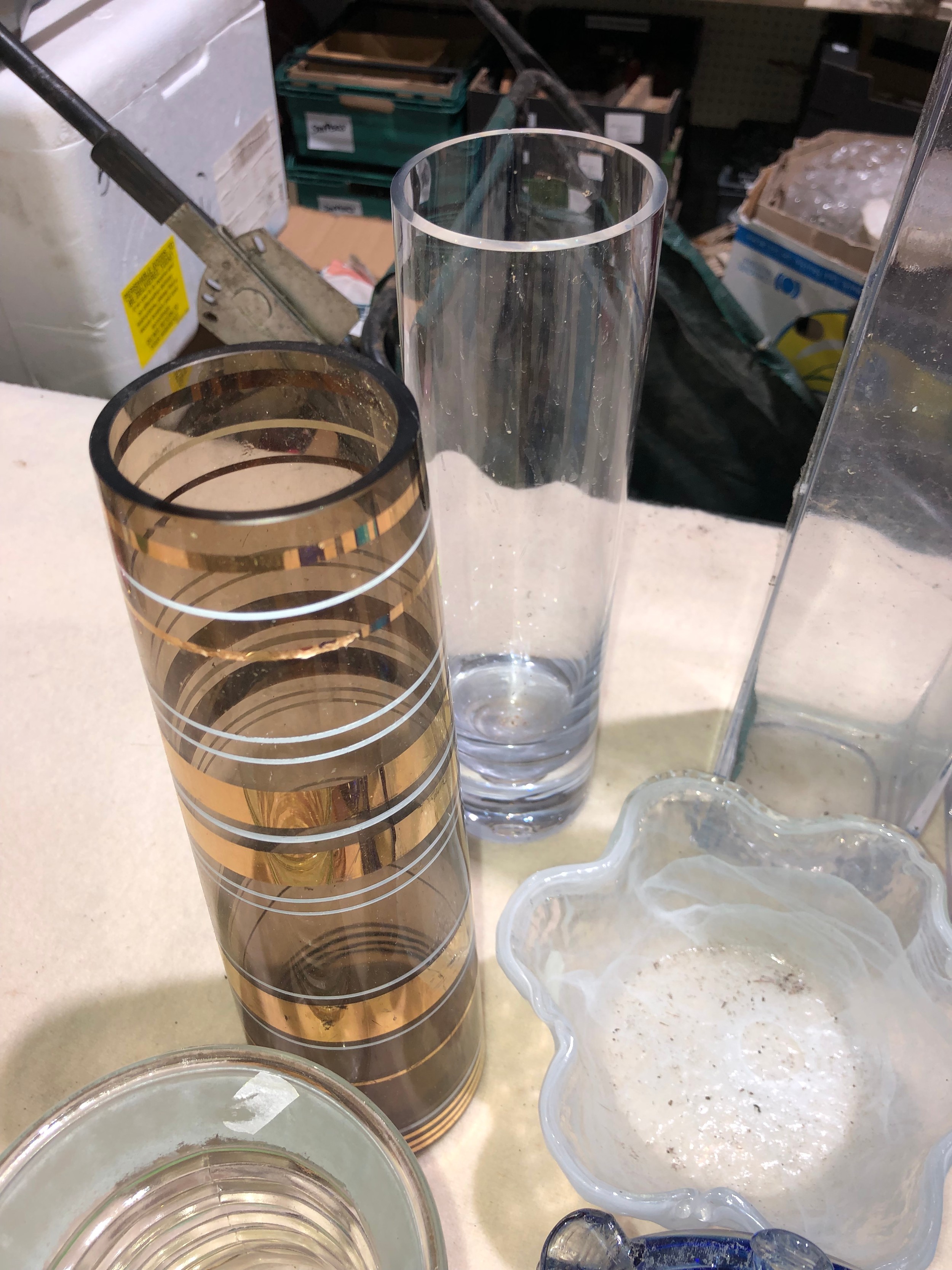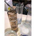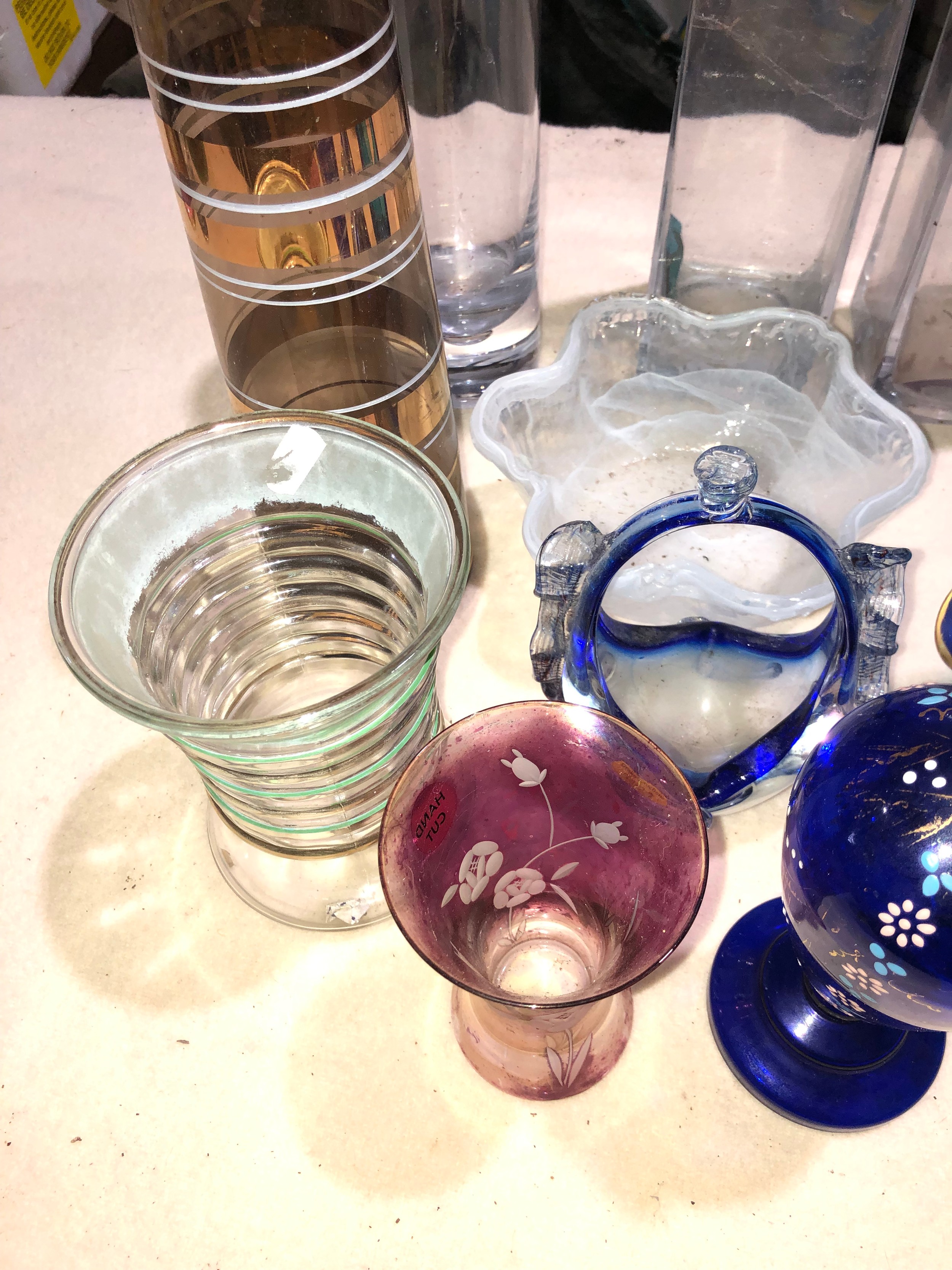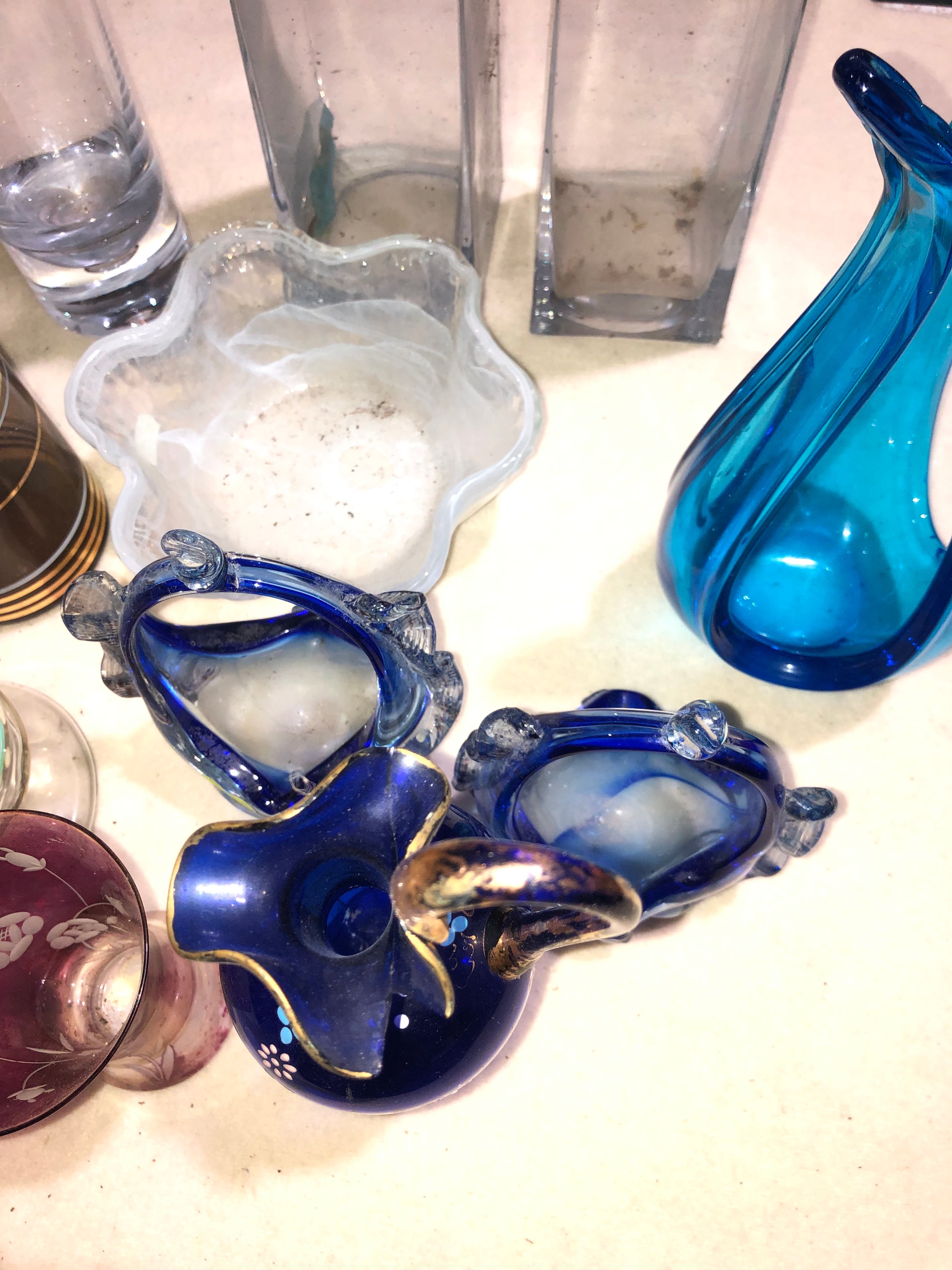 Fruit box containing coloured and clear glassware