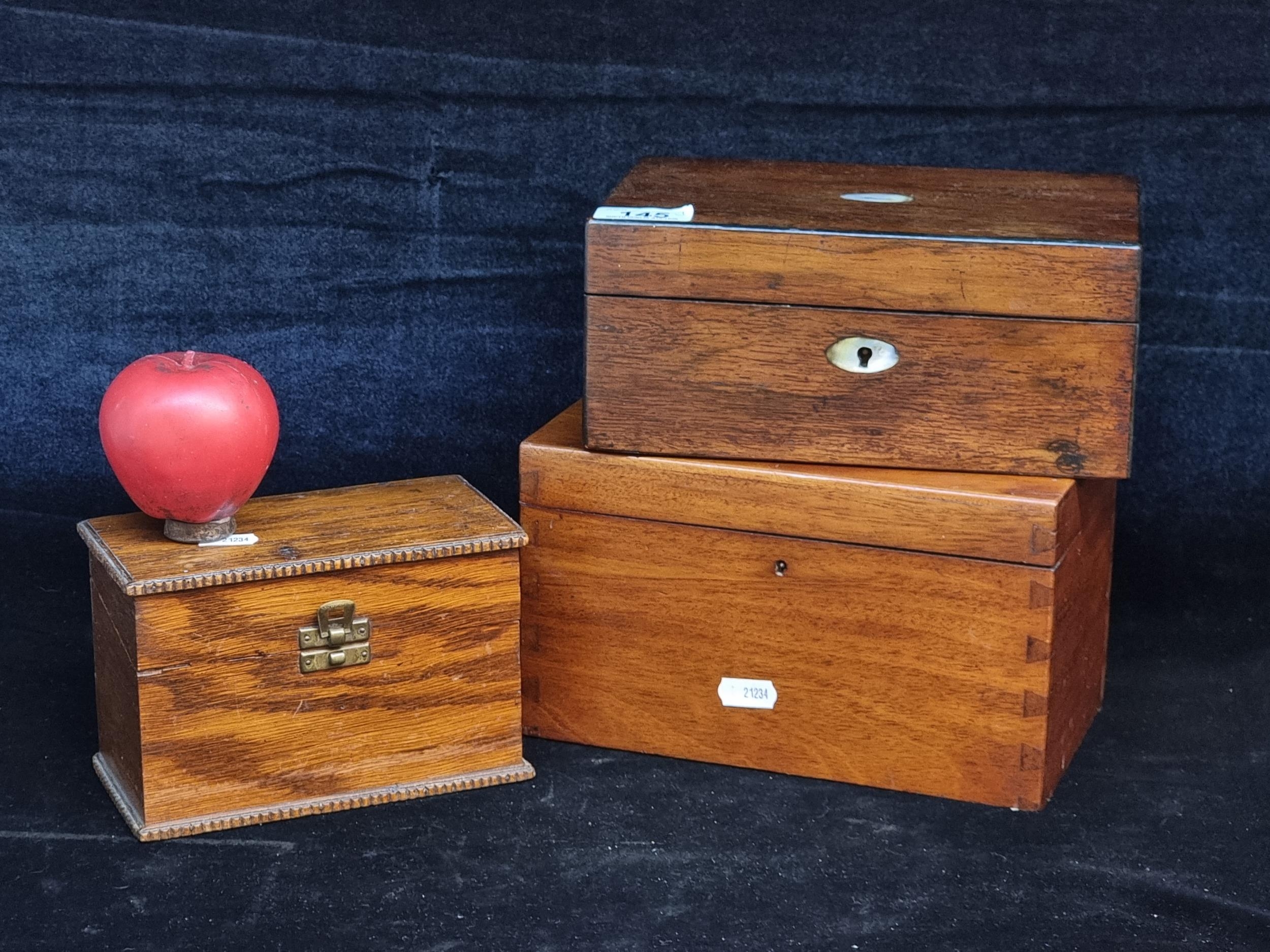 Three lovely wooden antique boxes. One features nice dove tail joinery and one features Mother of Pearl marquetry.