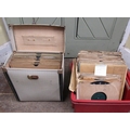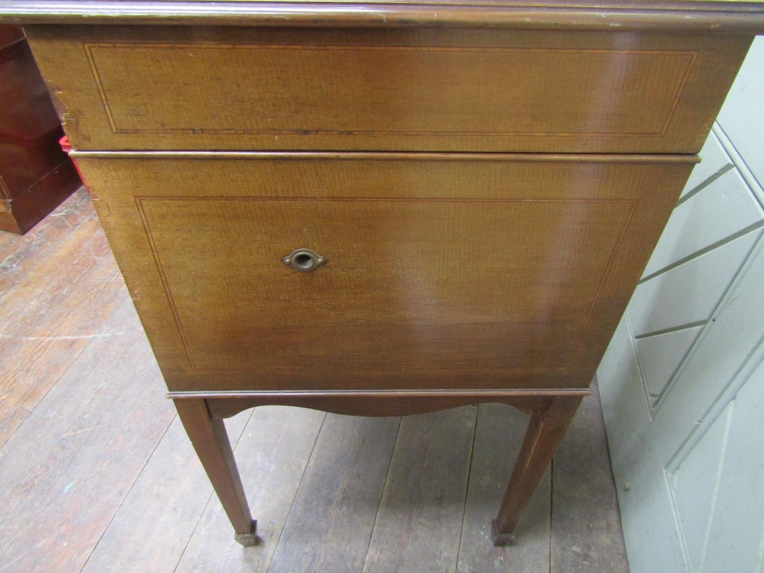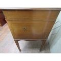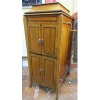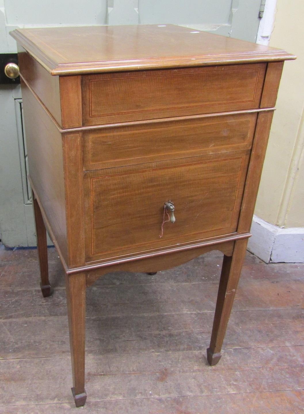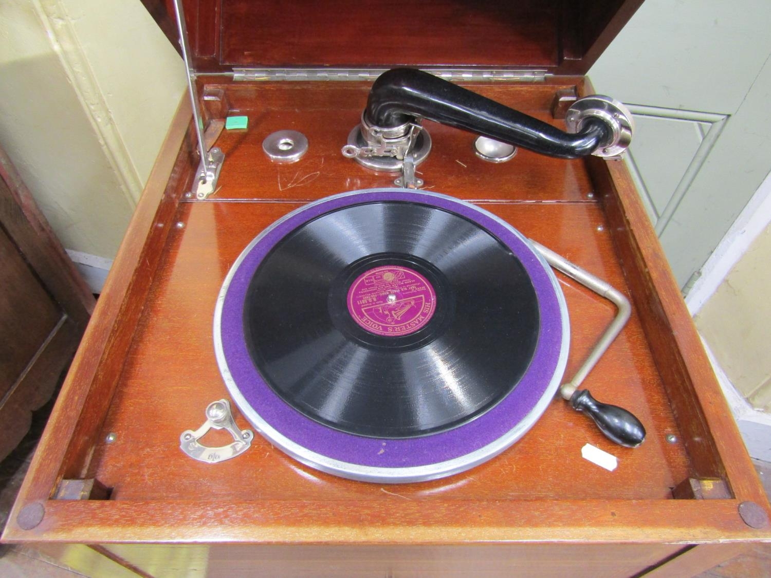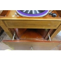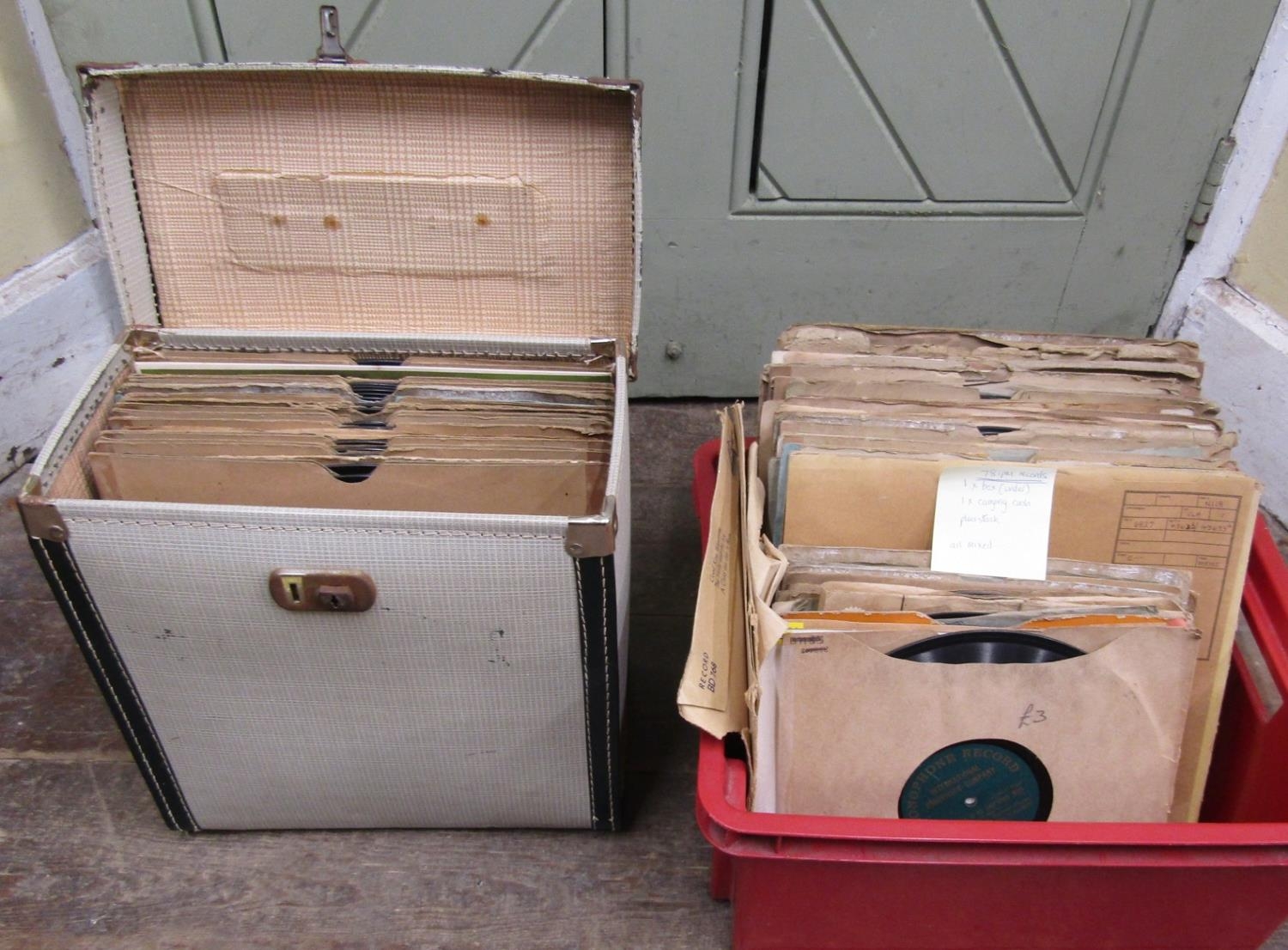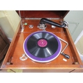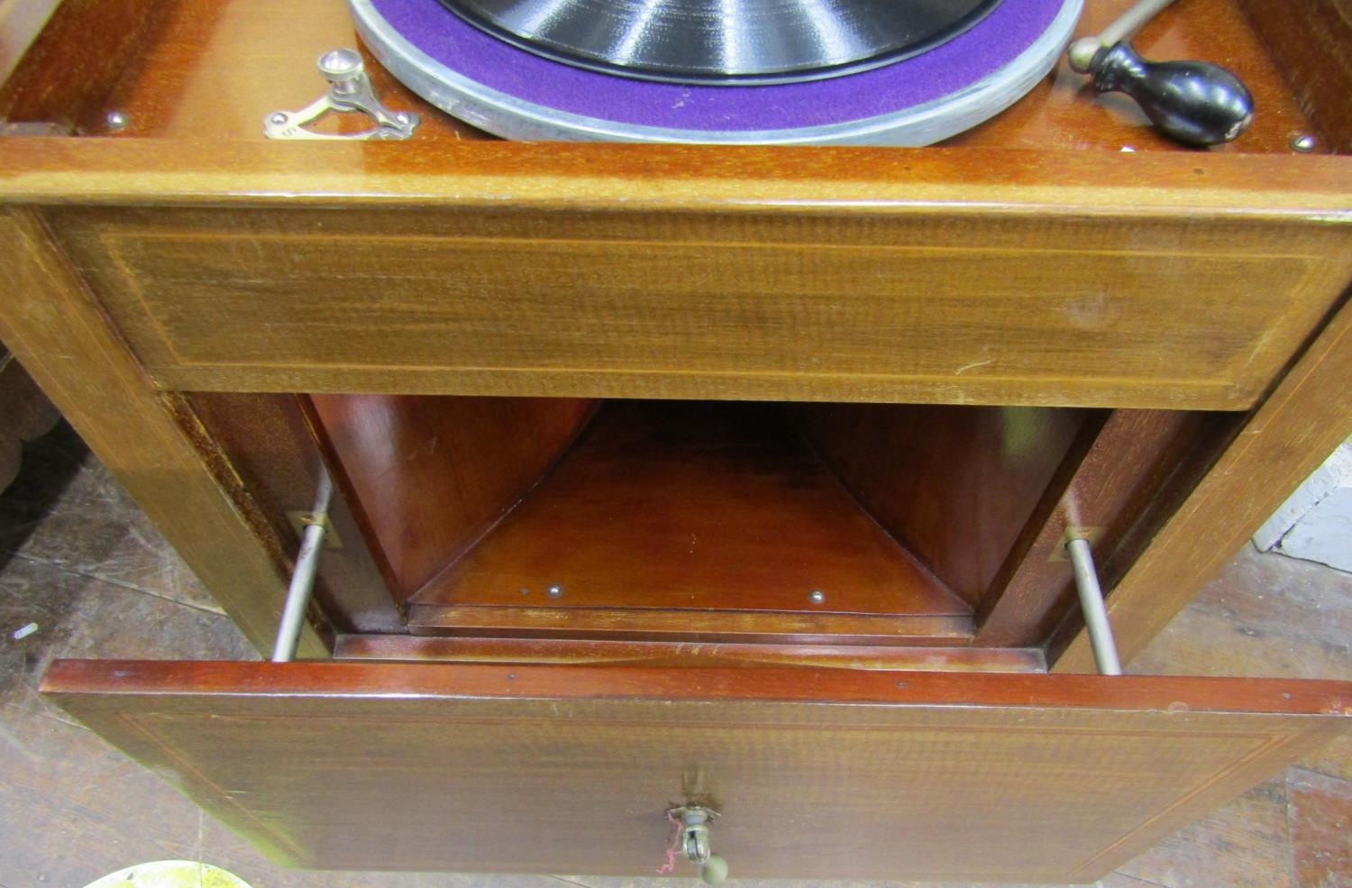 A vintage floorstanding gramophone The Algraphone, with chrome fittings, the front elevation enclosed by a single pull out drawer revealing the speaker, the mahogany case with sting banded inlay, raised on a square tapered supports with spade feet, together with a selection of classical and other 78rpm records