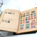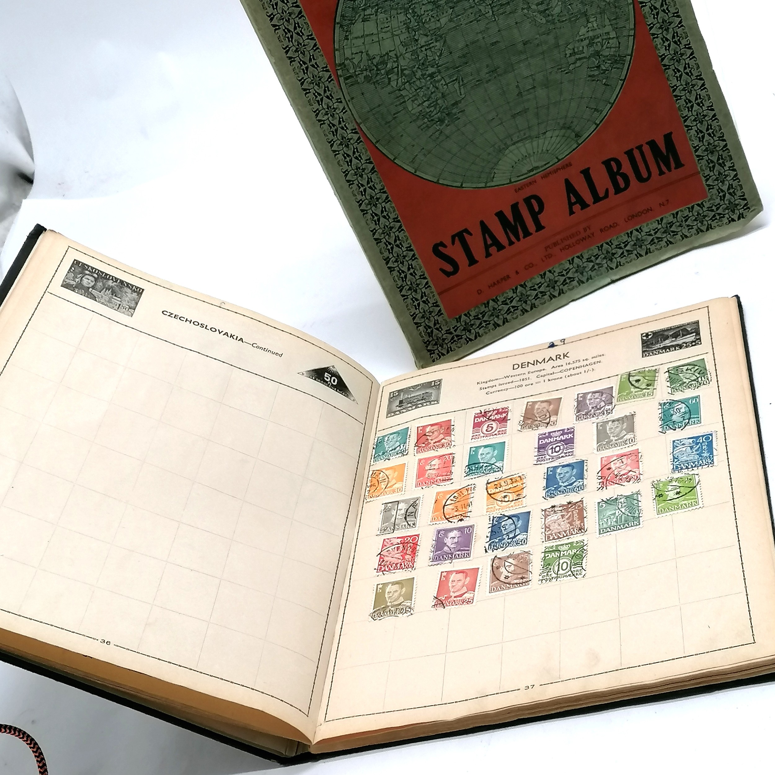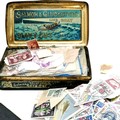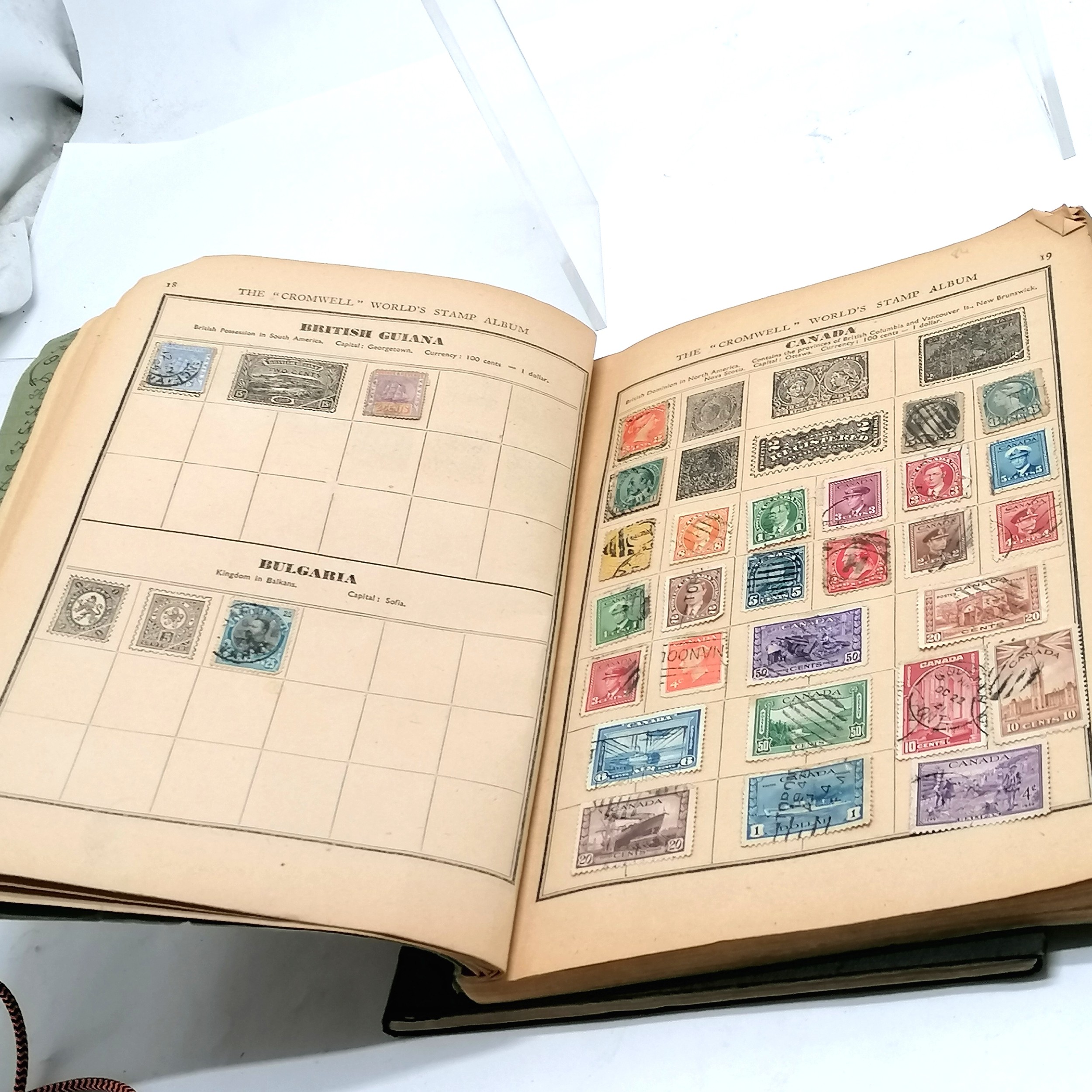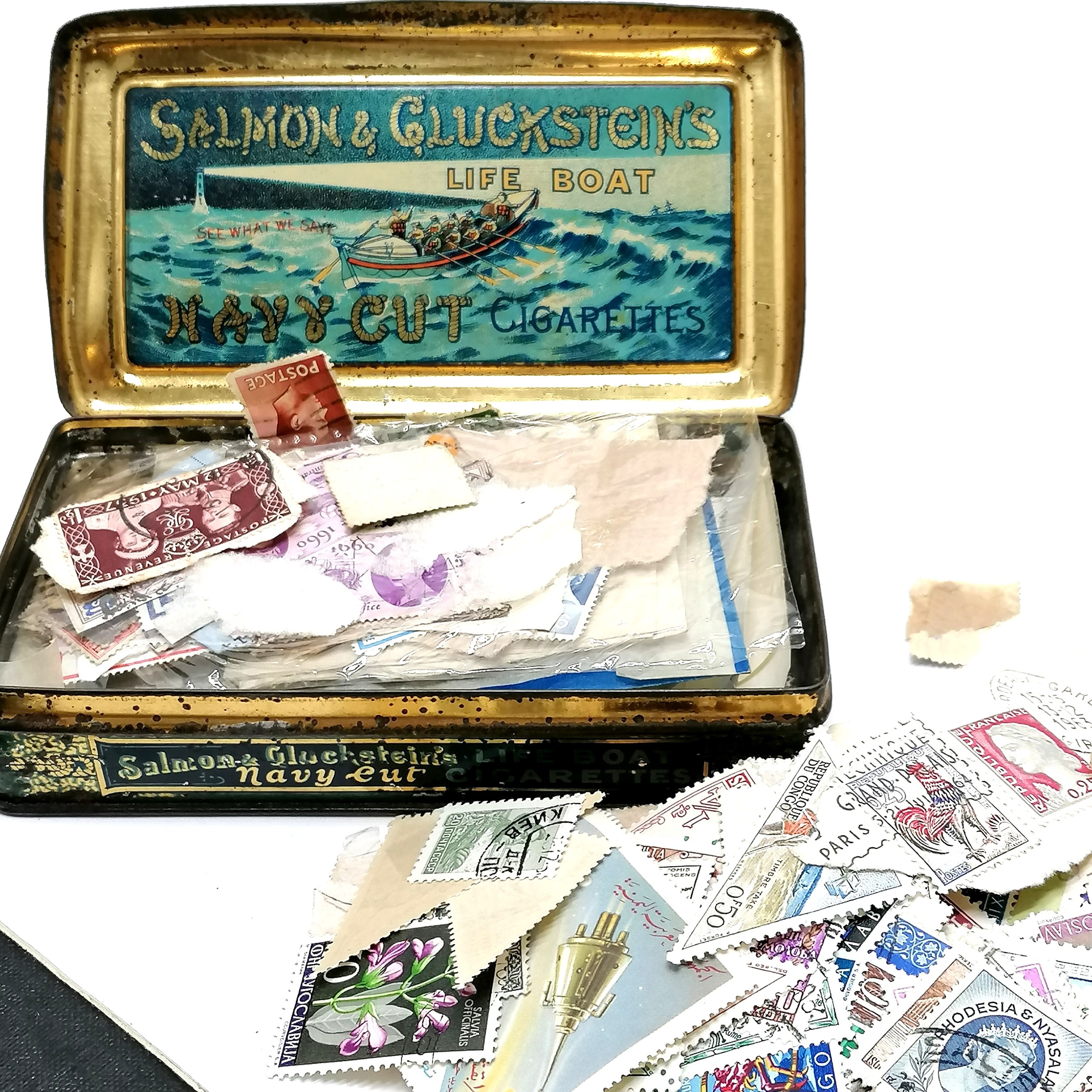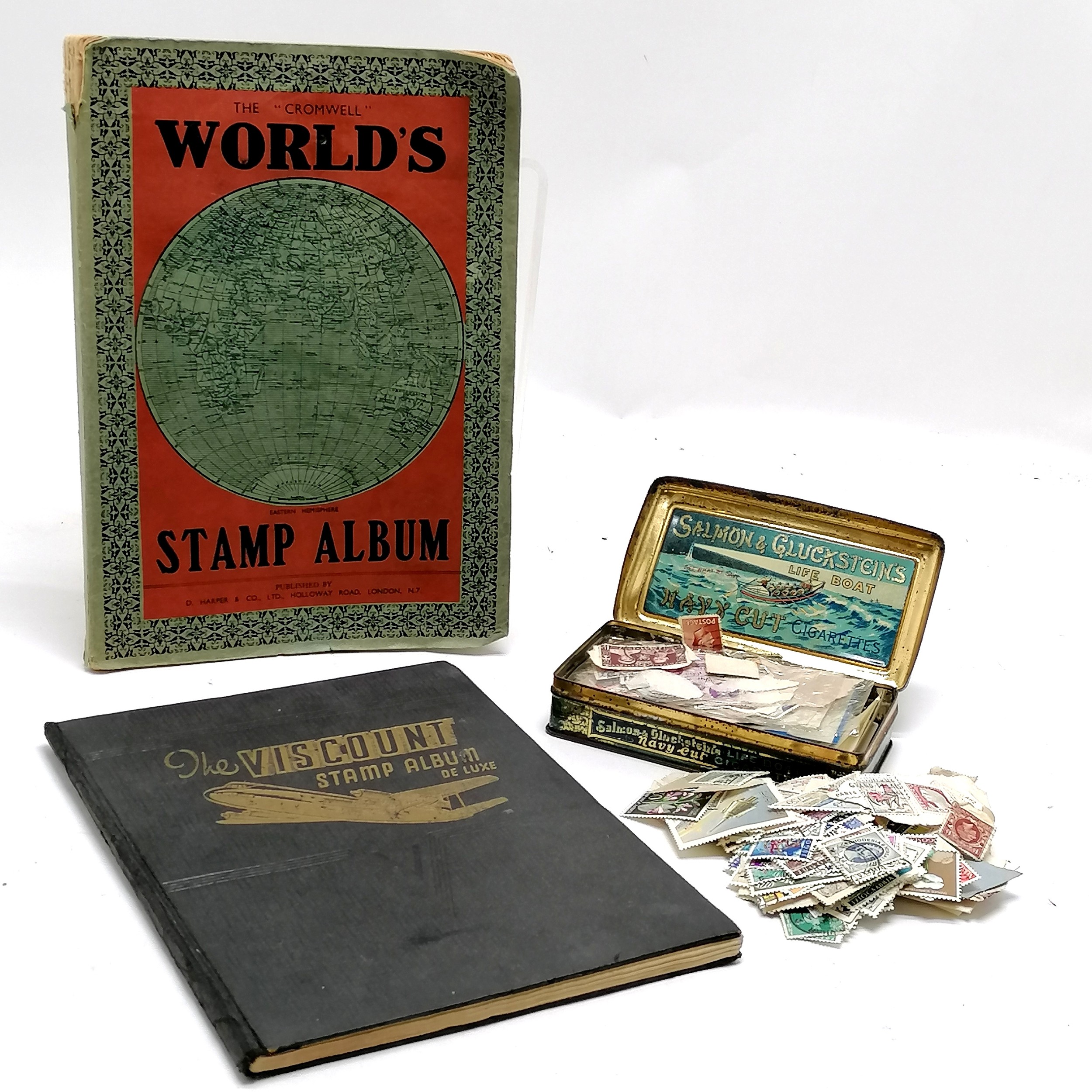 2 x vintage stamp albums 'The Cromwell' & 'The Viscount' (with contents) t/w Salmon & Glucksteins Life-boat cigarette tin (worn lid) with oddments