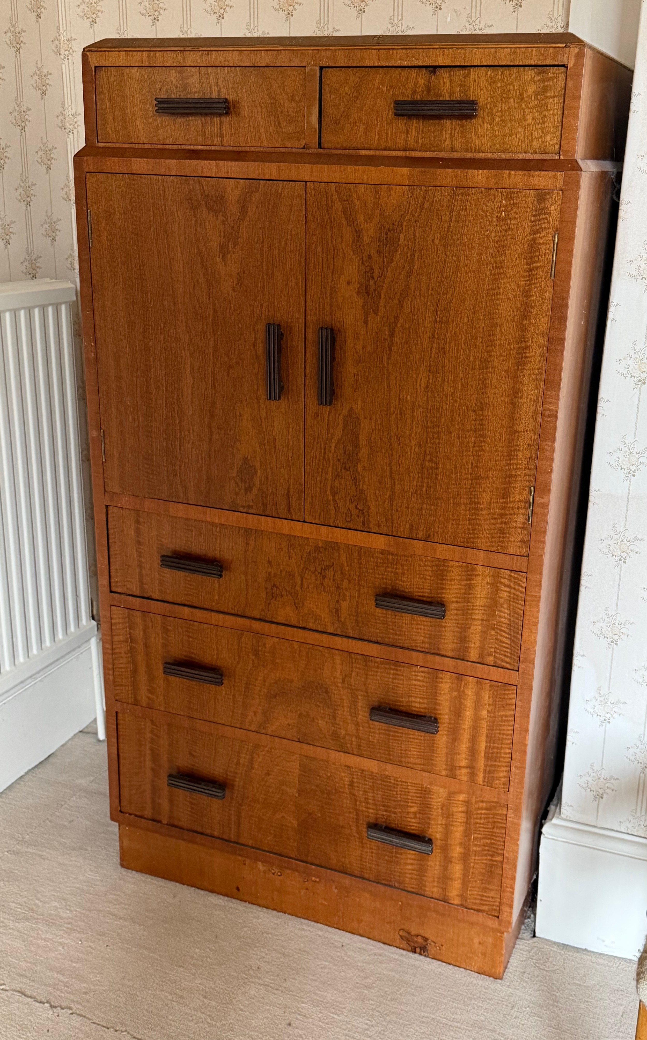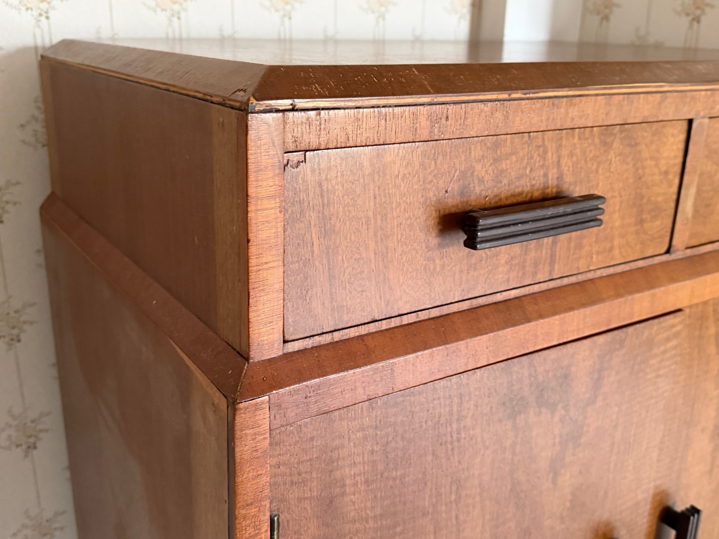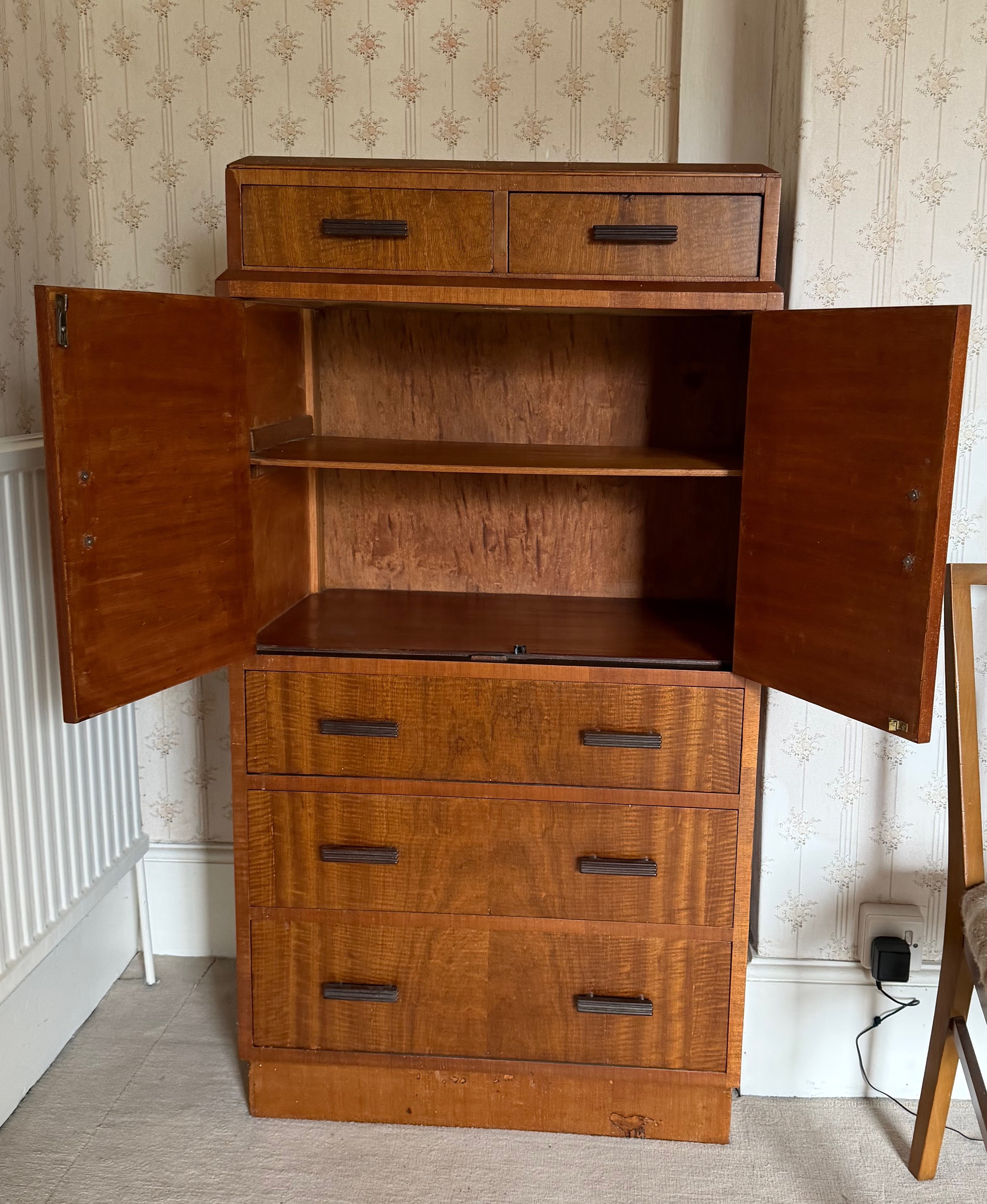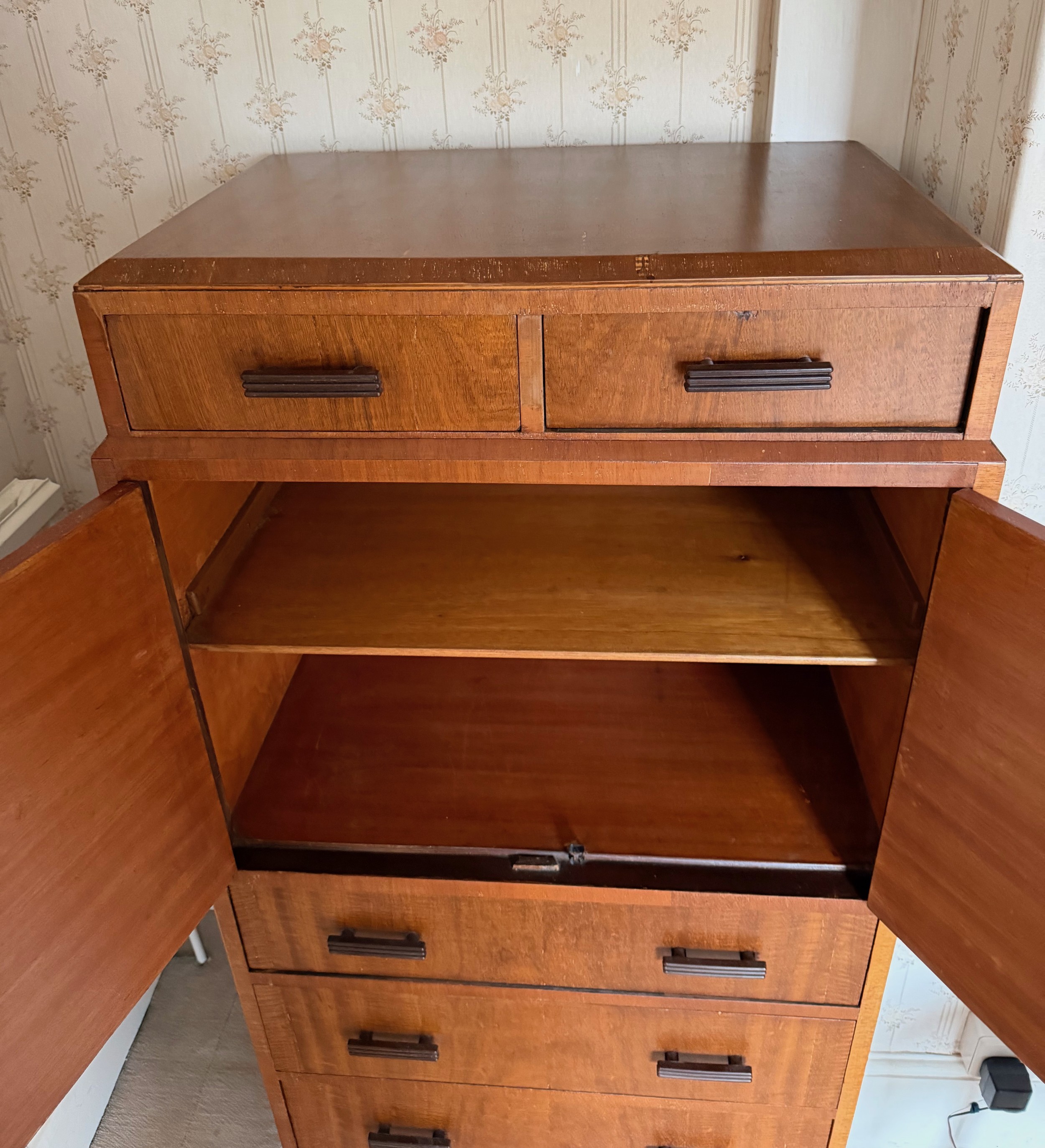 Furniture, an Art Deco storage unit with bakelite handles, 73 cm x 45cm x 137 cm tall.This lot is collection only