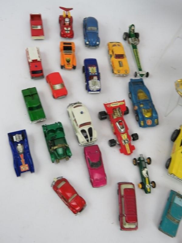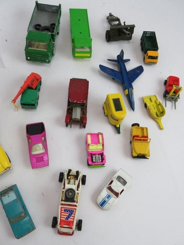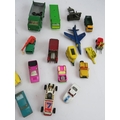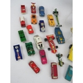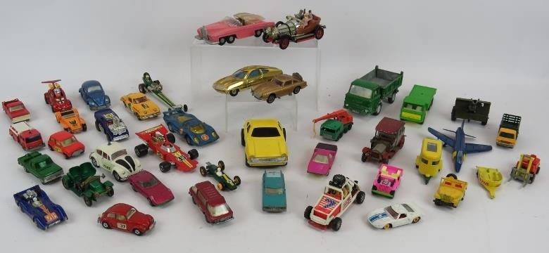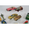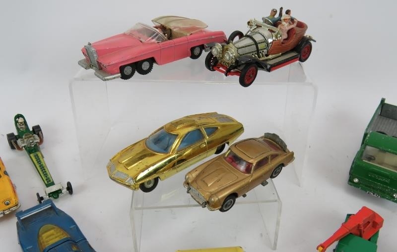 A collection of vintage Dinky, Corgi and Matchbox Die Cast cars including Thunderbirds FAB1, James Bond DB5, Chitty Chitty Bang Bang and Ed Straker's car.