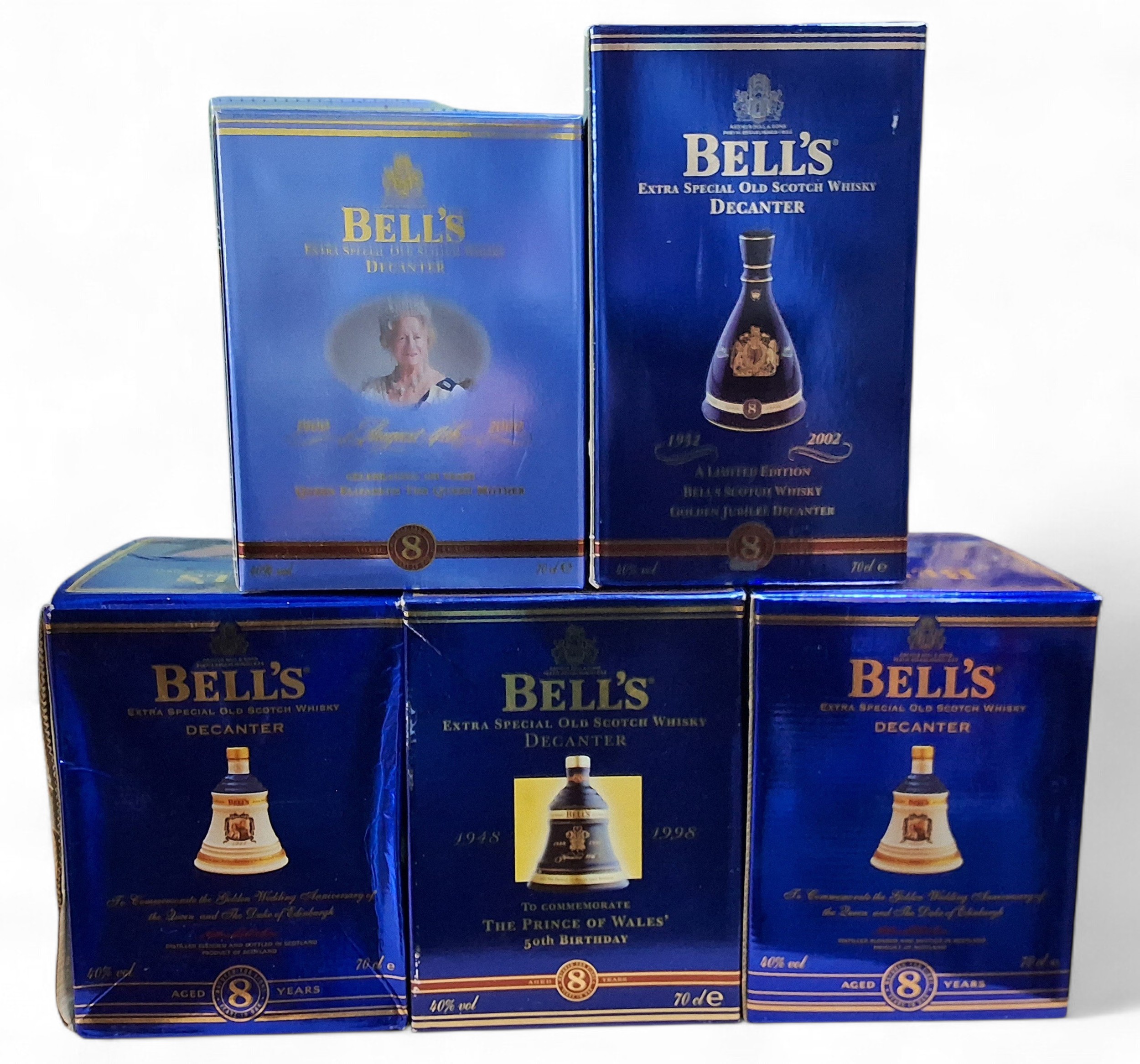 Wines and Spirits - five boxed Bells sealed decanters in the form of bells, Golden Jubilee decanter 1952-2002, Prince of Wales 50th Birthday, 2 x Golden Wedding Anniversary of the Queen and the Duke of Edinburgh; etc. (all 40% vol and 70cl)