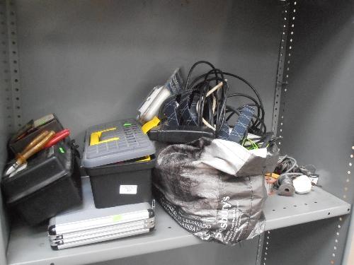 SHELF OF MISCELLANEOUS WORKSHOP ITEMS - CABLING, METERS, TOOLS ETC.,