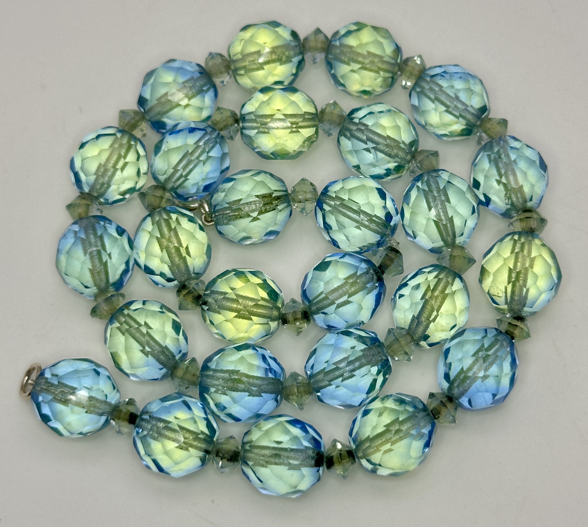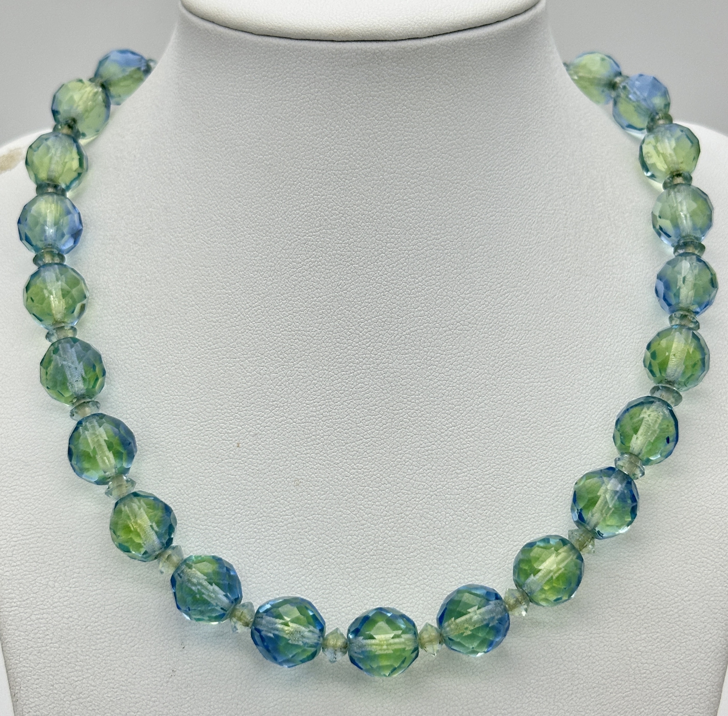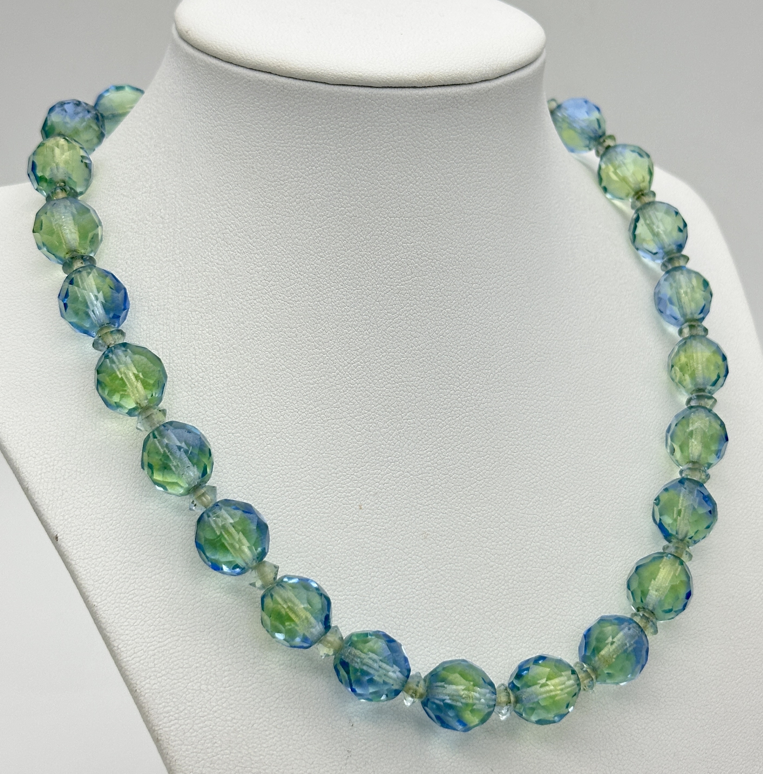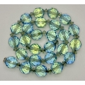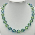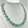 A Vintage Sterling Silver and Faceted Blue/Green Uranium Glass Beaded Necklace- 43cm Length. Beads measure 1cm Wide. Gross Weight 60 Grams.