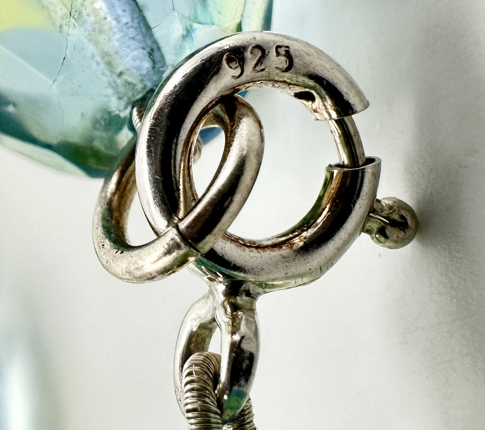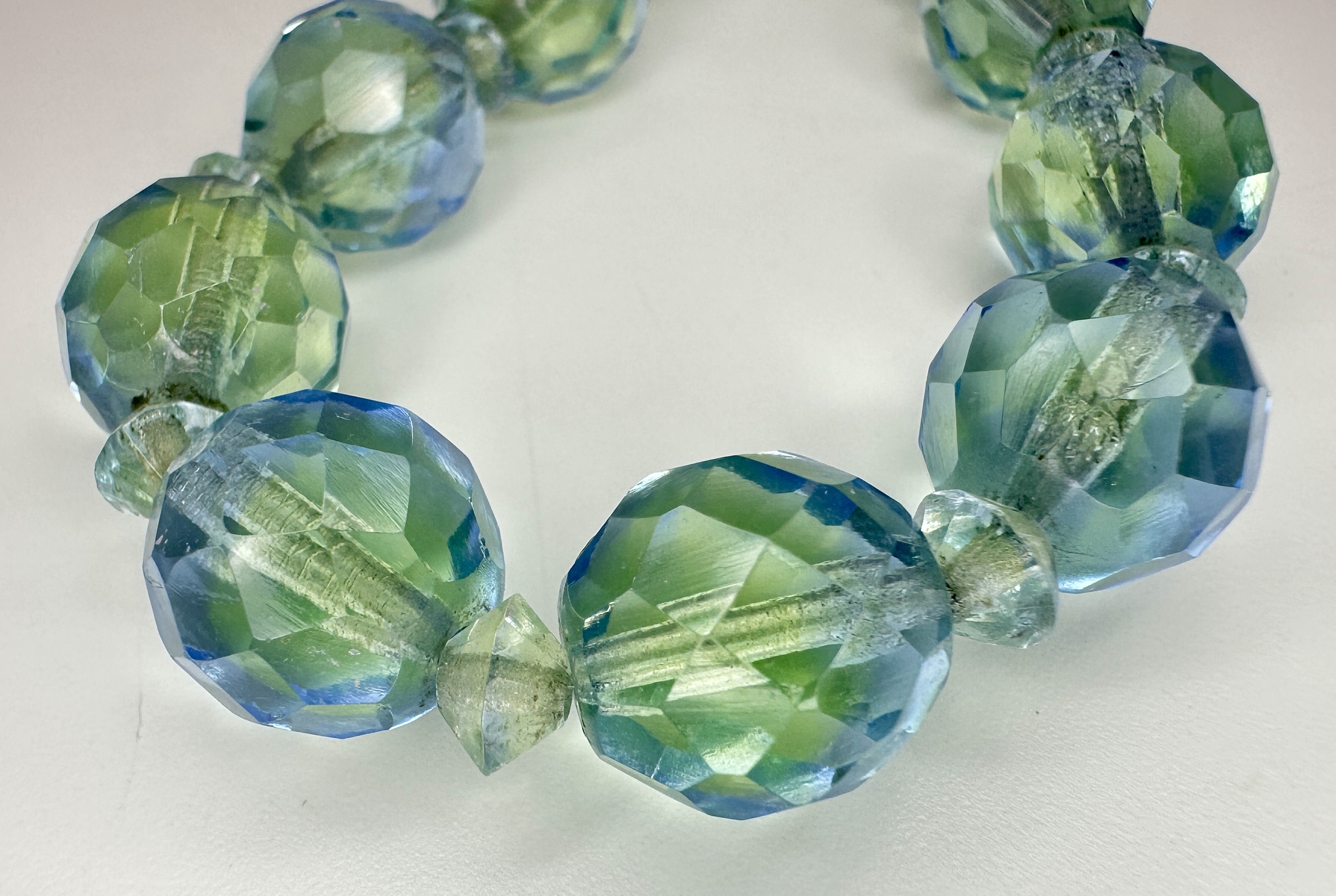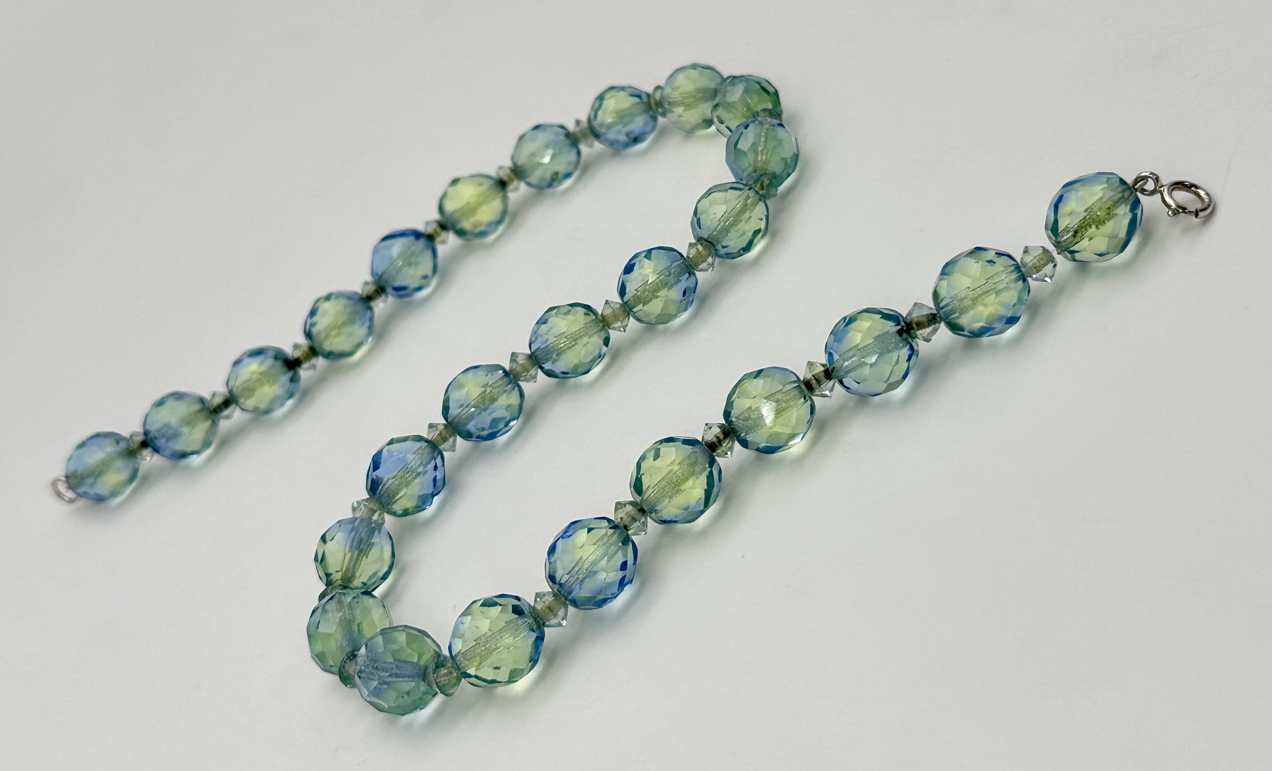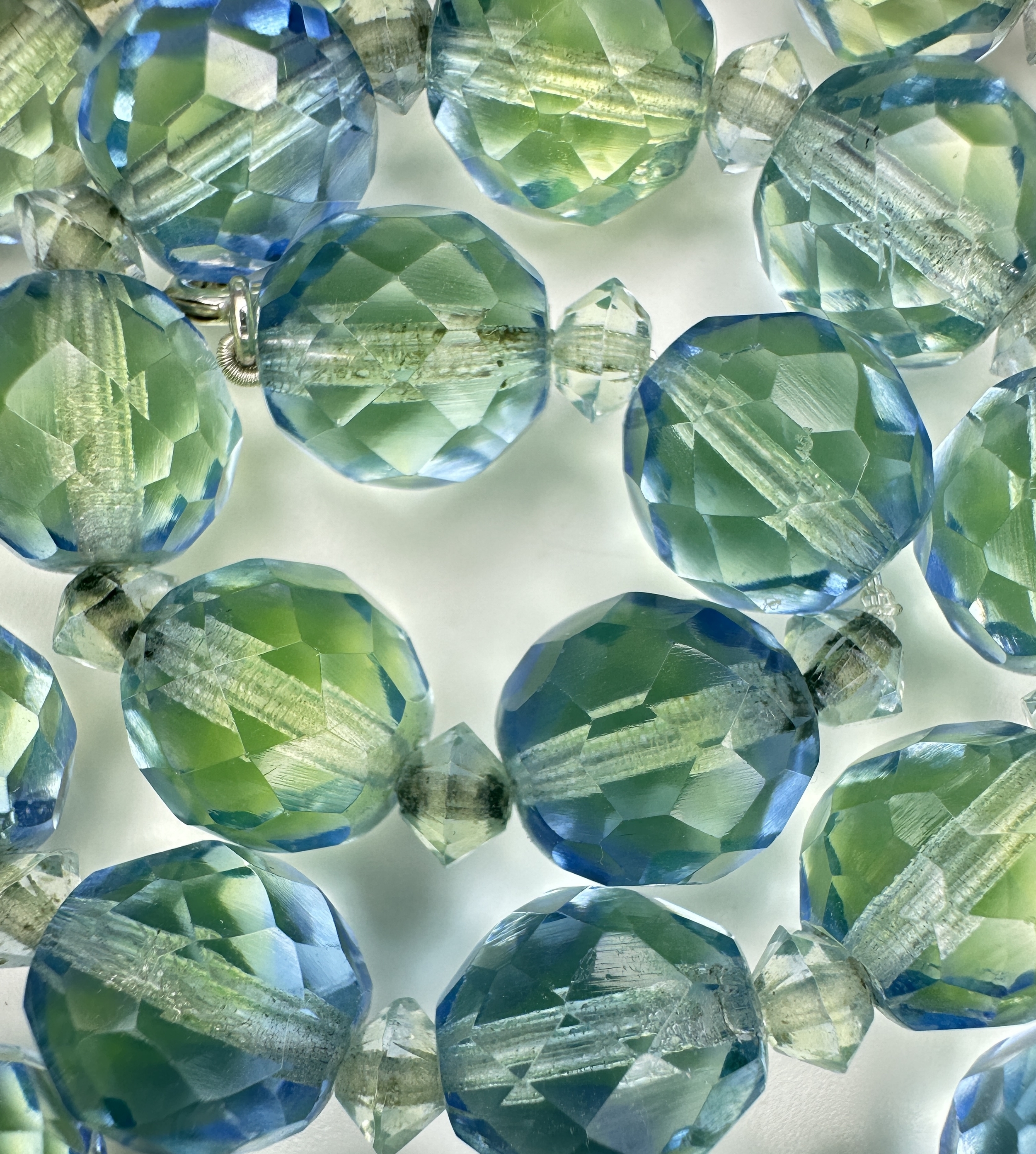 A Vintage Sterling Silver and Faceted Blue/Green Uranium Glass Beaded Necklace- 43cm Length. Beads measure 1cm Wide. Gross Weight 60 Grams.