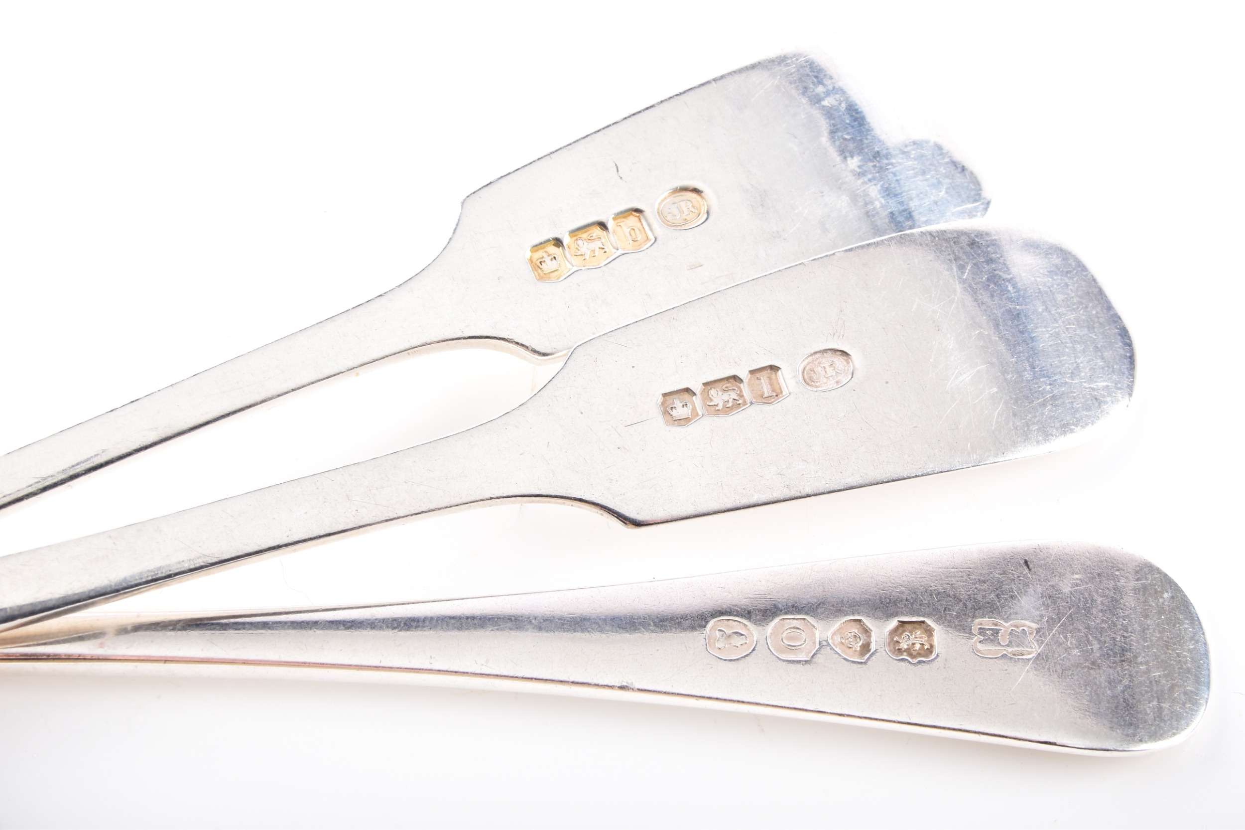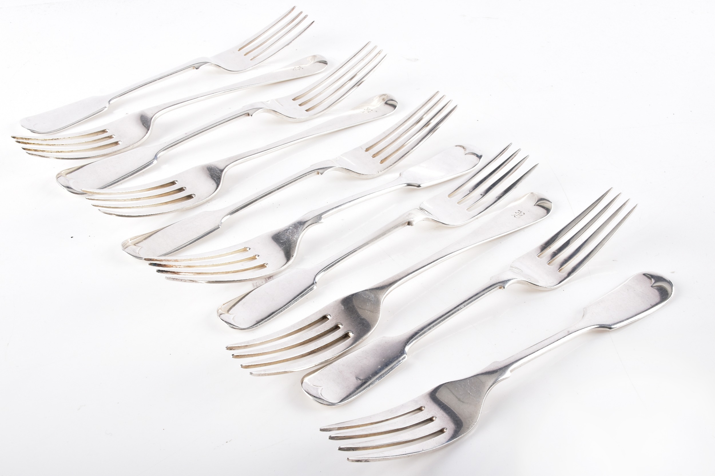 A collection of silver dessert forks, including three George IV forks hallmarked for London 1829 by William Eaton, Old English pattern, along with five forks hallmarked for Sheffield 1907, 1919, 1920, 1928 and 1929, fiddle pattern, all by John Round & Son Ltd, together with two silver plated dessert forks.