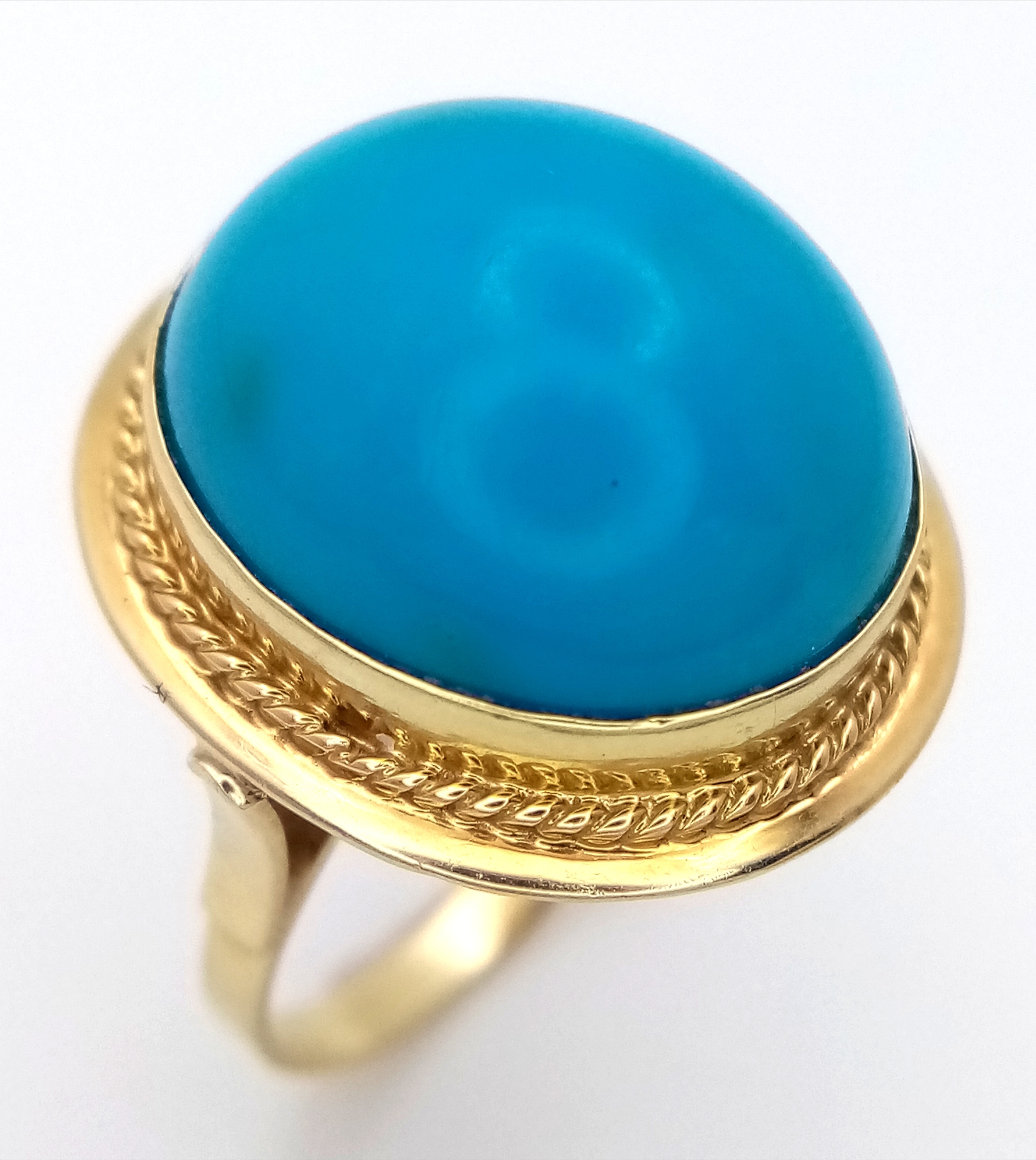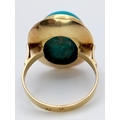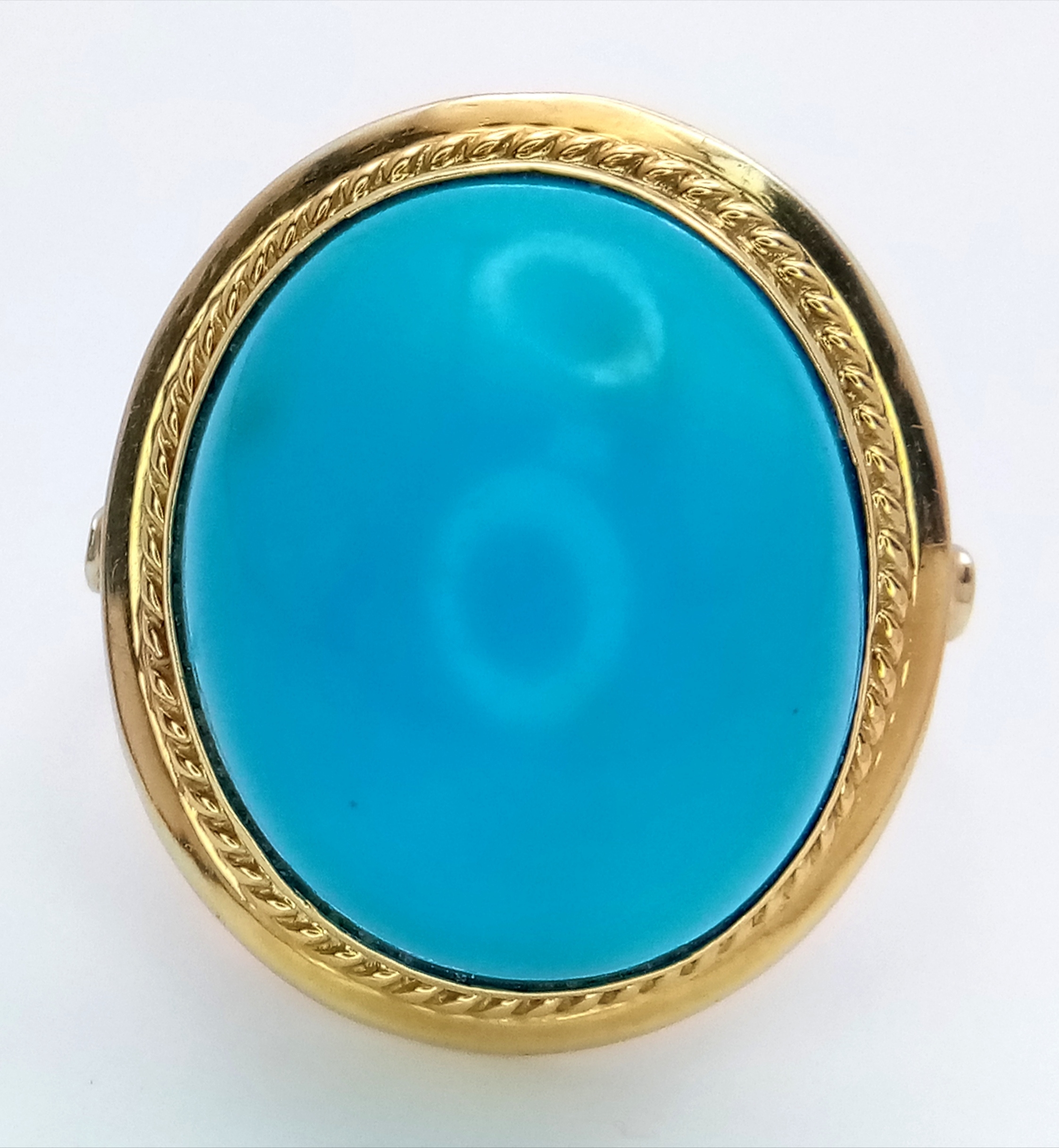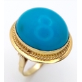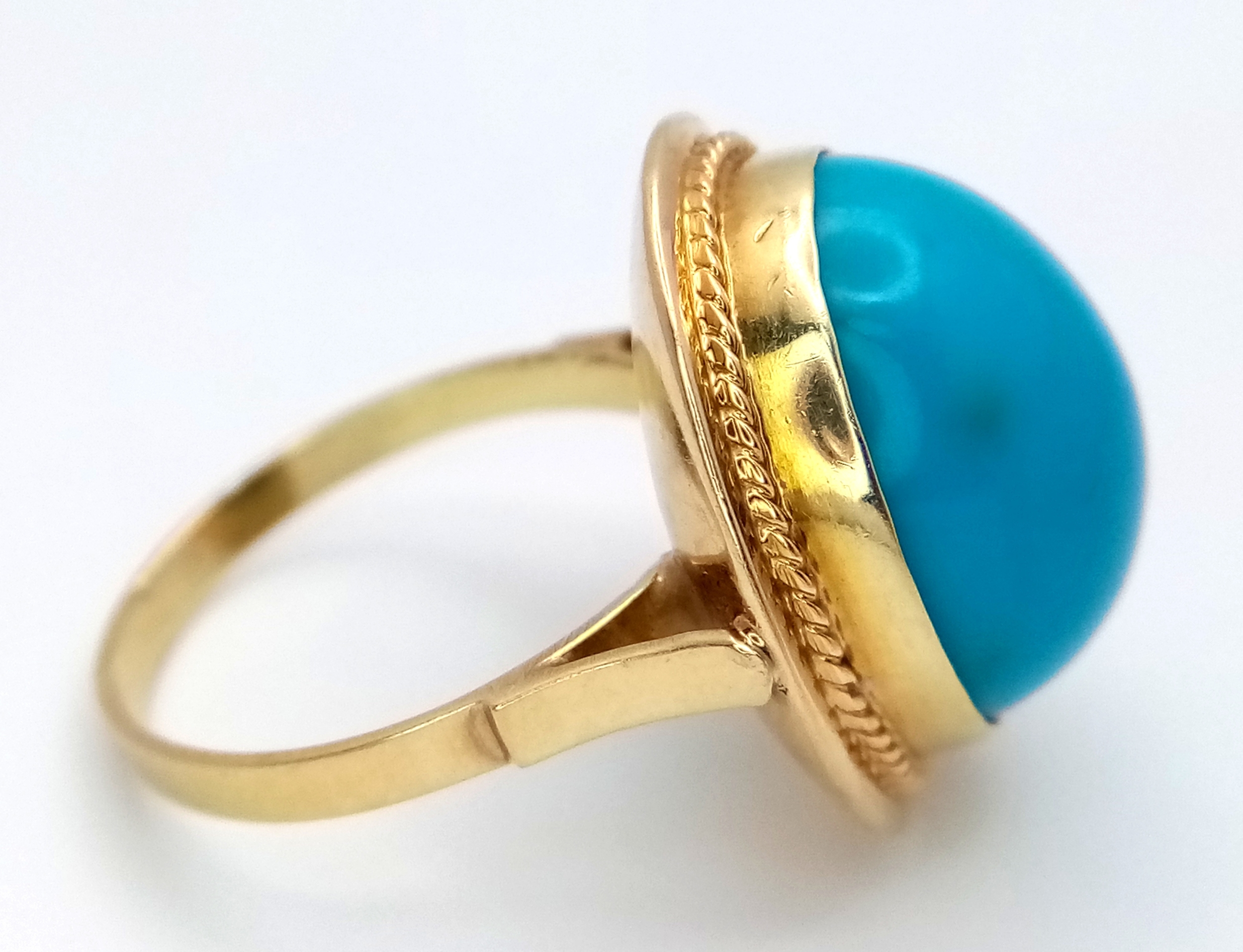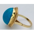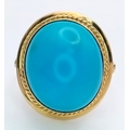 An 18K Yellow Gold (tests as) Turquoise Ring. A large pale blue turquoise cabochon in a decorative setting. Size R. 8g.