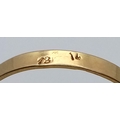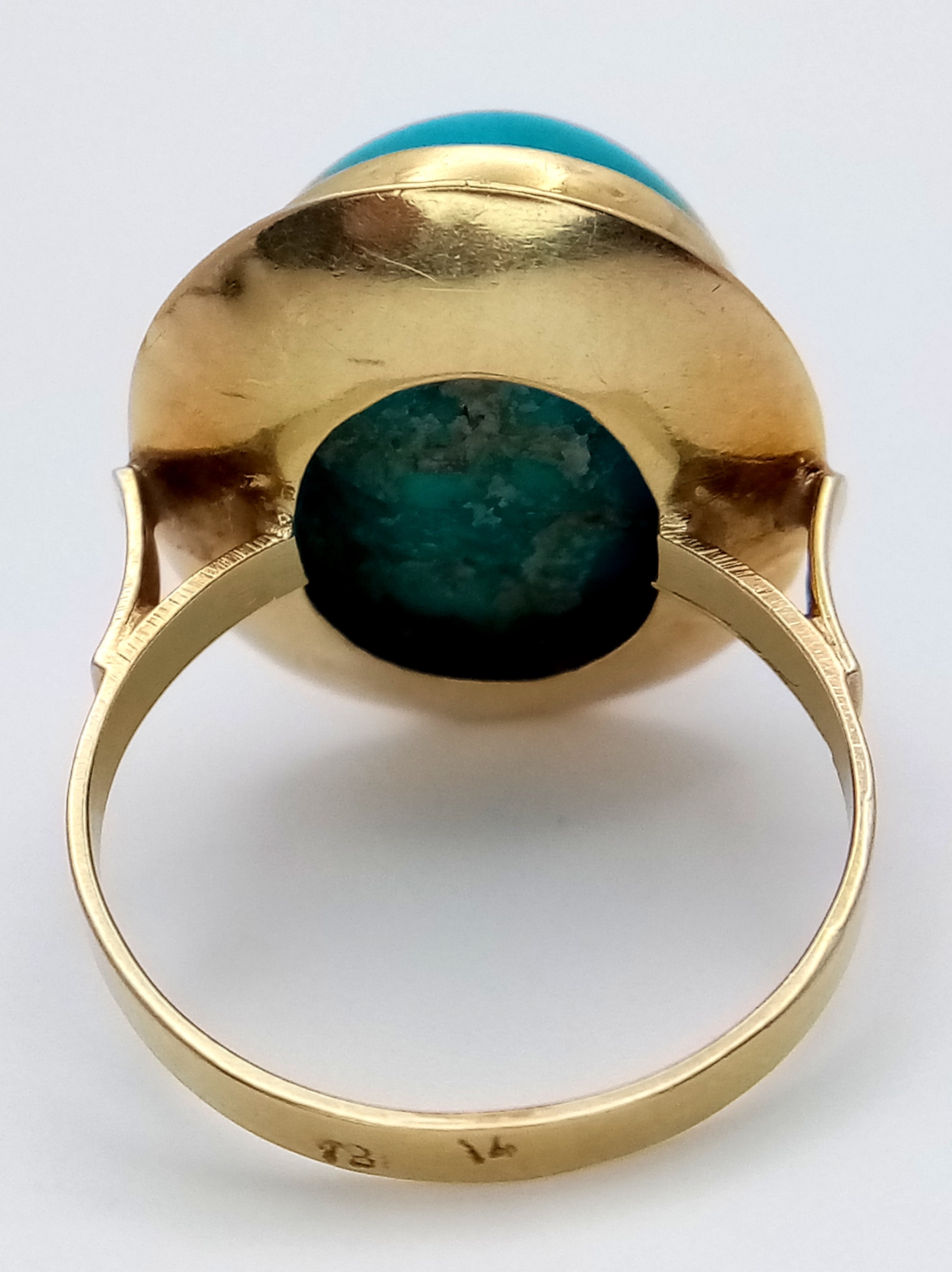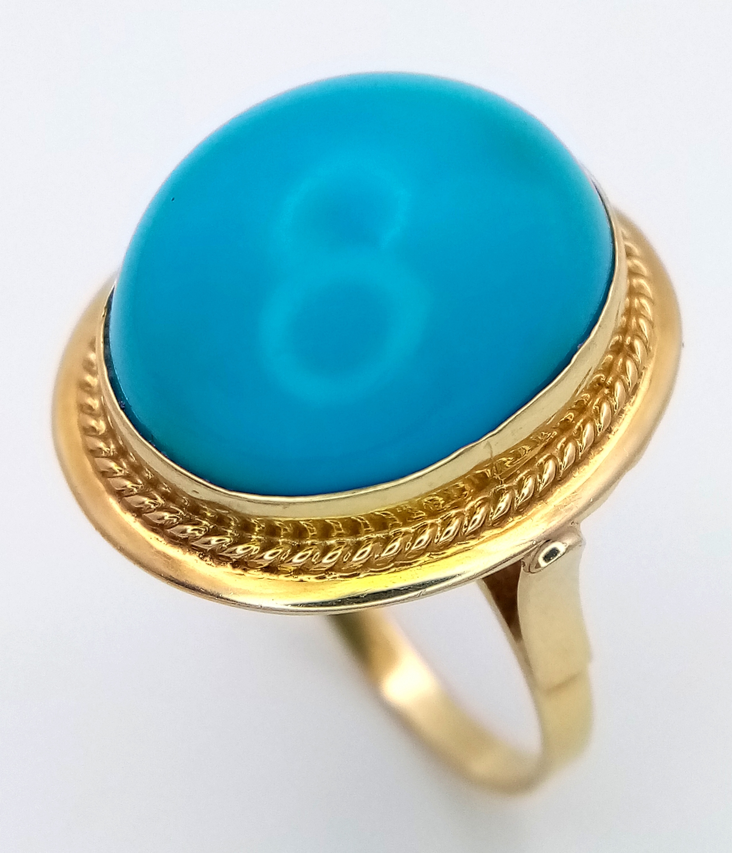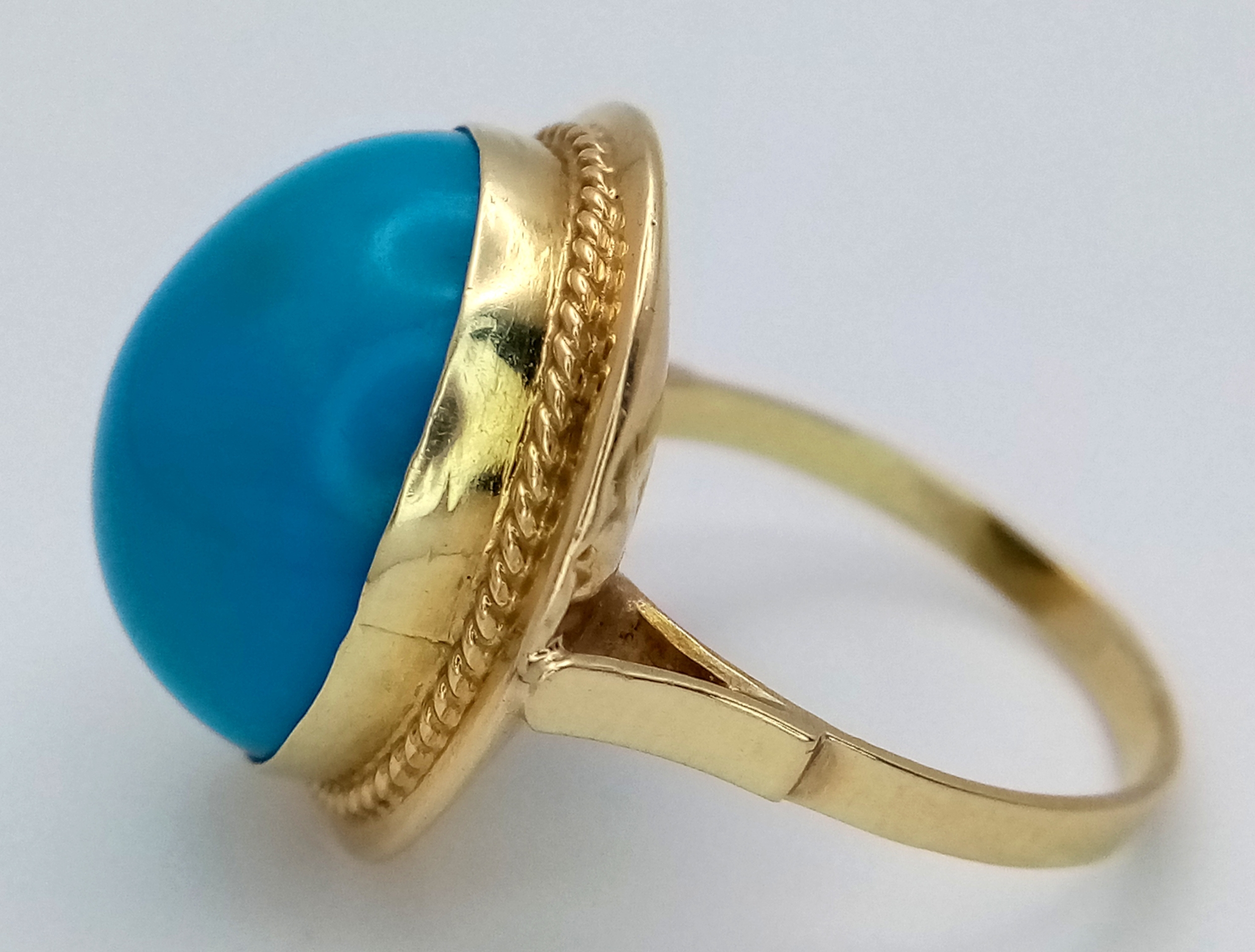 An 18K Yellow Gold (tests as) Turquoise Ring. A large pale blue turquoise cabochon in a decorative setting. Size R. 8g.