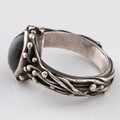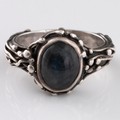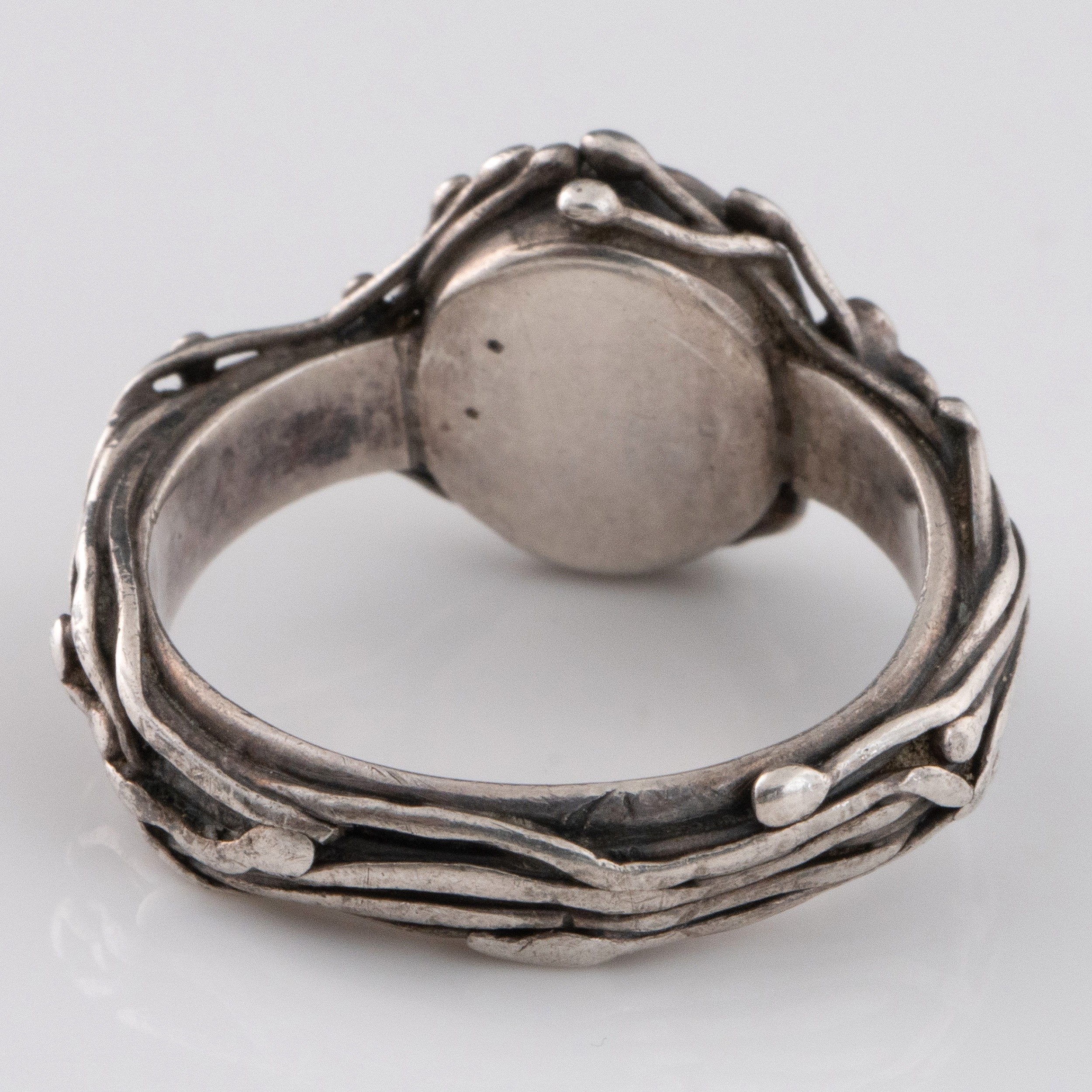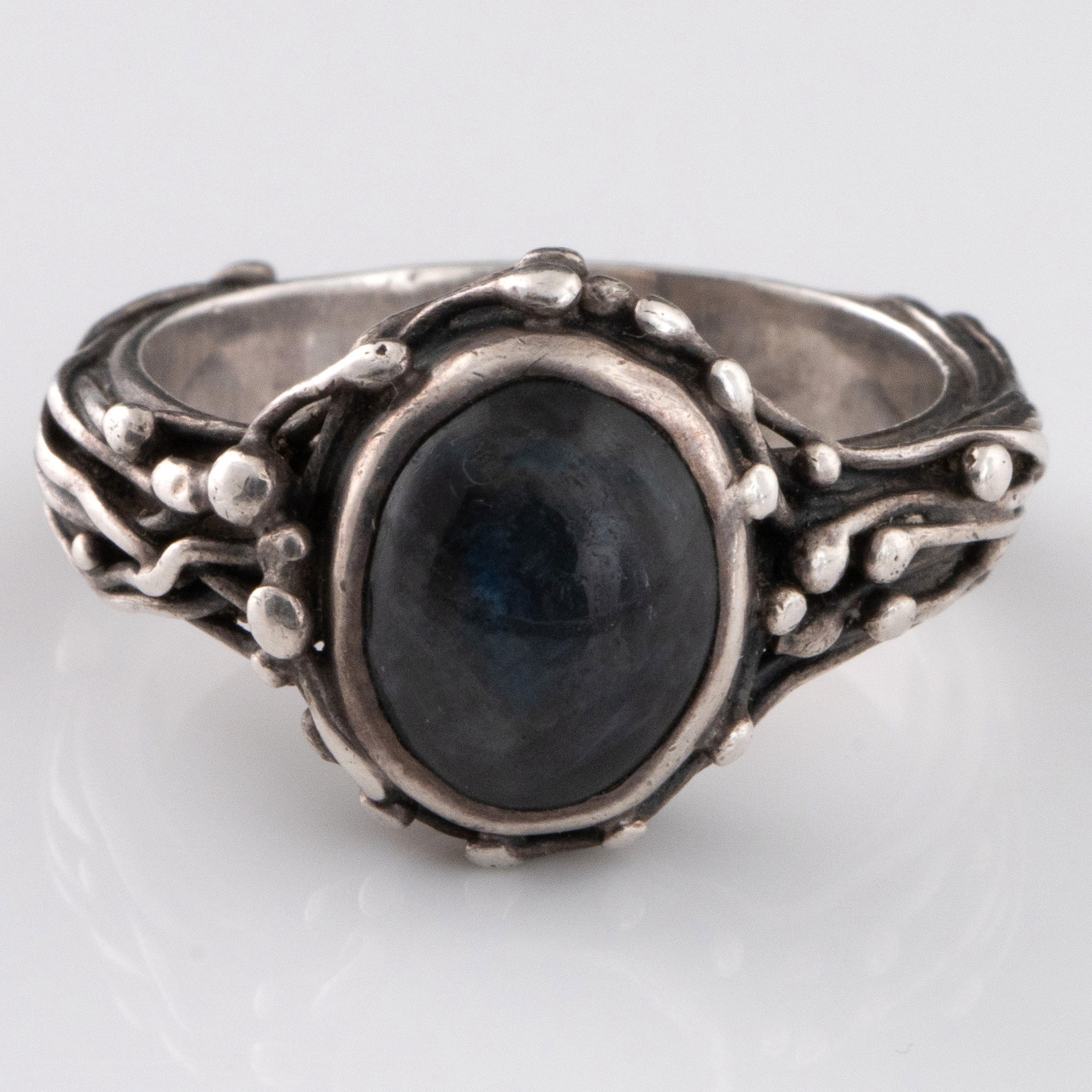 An English Arts and Crafts silver ring, c.1905, decorated with an intricate design of entwined stems and seed heads, set with a labradorite cabochon that is vivid blue in direct sunlight, unmarked but tests as silver, ring size is L ½, 6.4g total weight. (LDC15151)