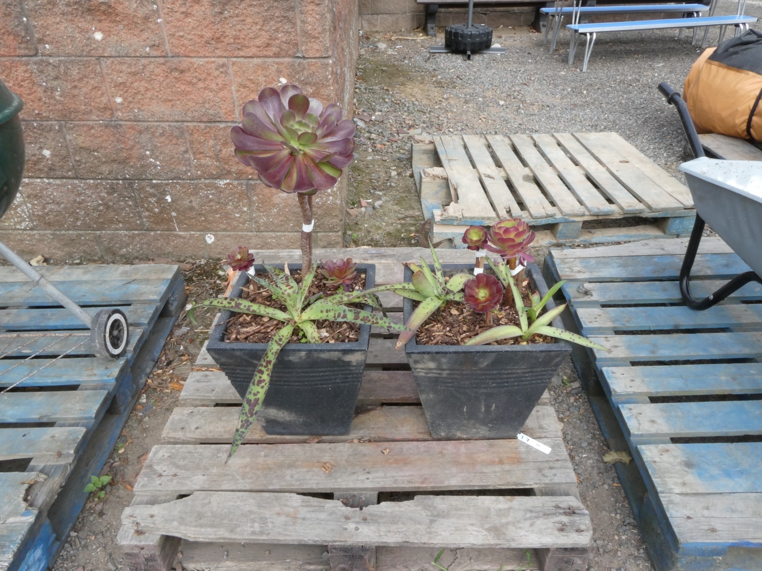 A pair of composite planters of square tapered form containing a succulent and other plants