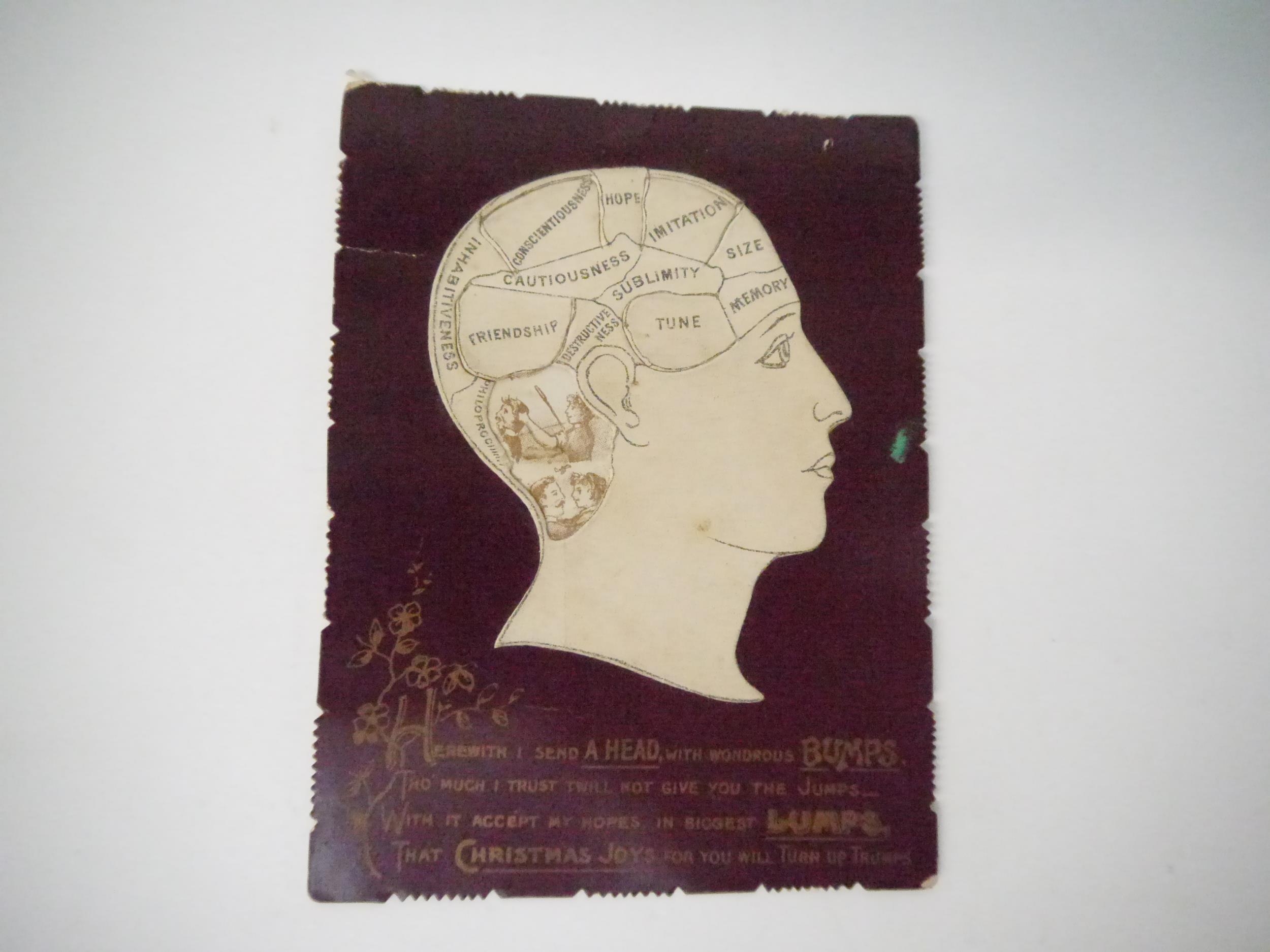 VICTORIAN CHRISTMAS CARD. n.d. (possibly 1880s?). A phrenological inter-active card. Text to front "Herewith I send a head, with wondrous bumps, Tho' much I trust 'twill not give you the jumps - With it accept my hopes, in biggest lumps, That Christmas joys for you will turn up trumps", plain/unprinted to reverse