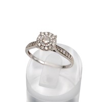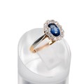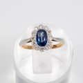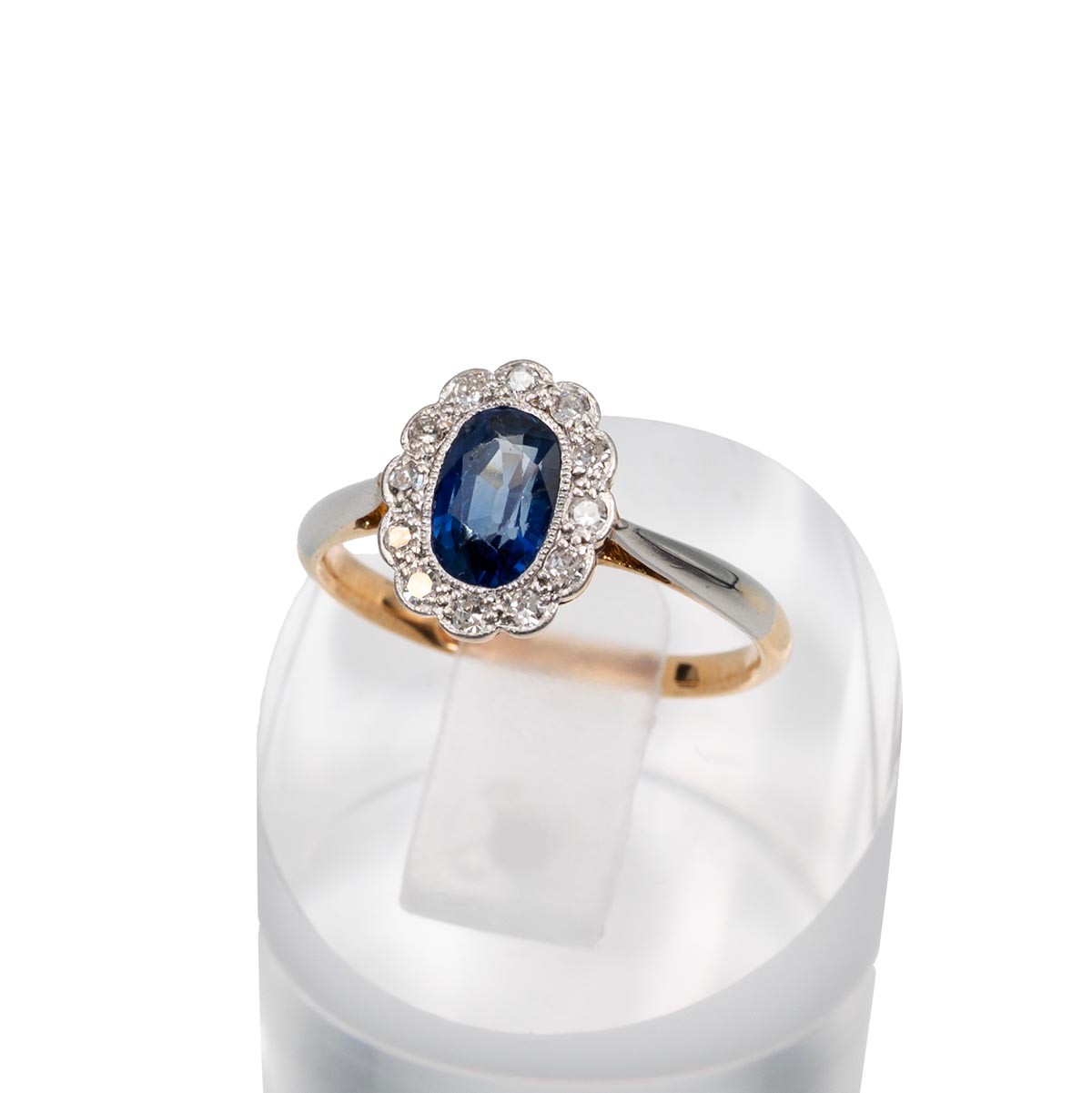 An 18ct gold sapphire and diamond cluster ring, set with a border of 12 brilliant cut diamonds, the shank stamped "18 CT PT", size L, 2.3 grams.