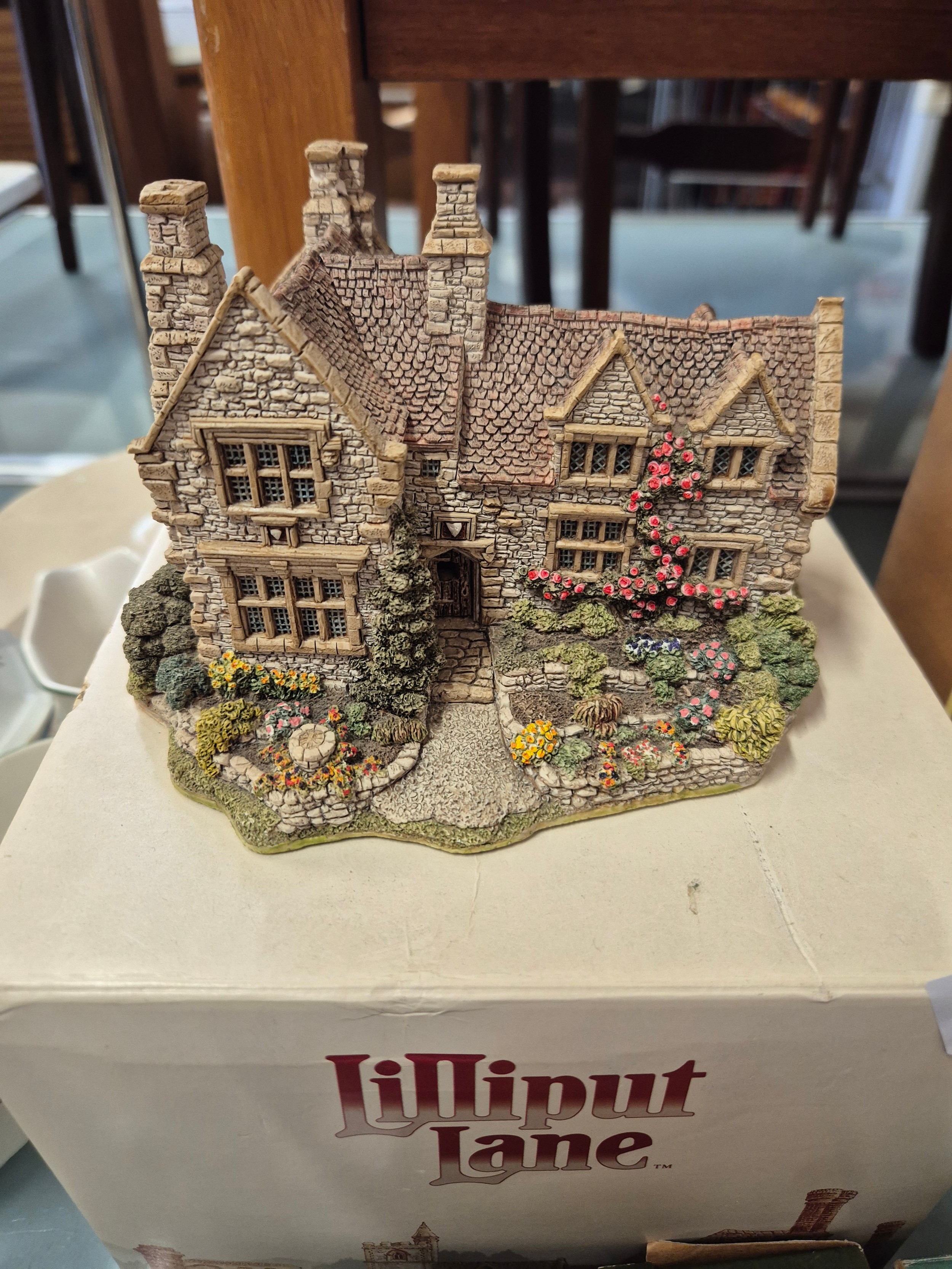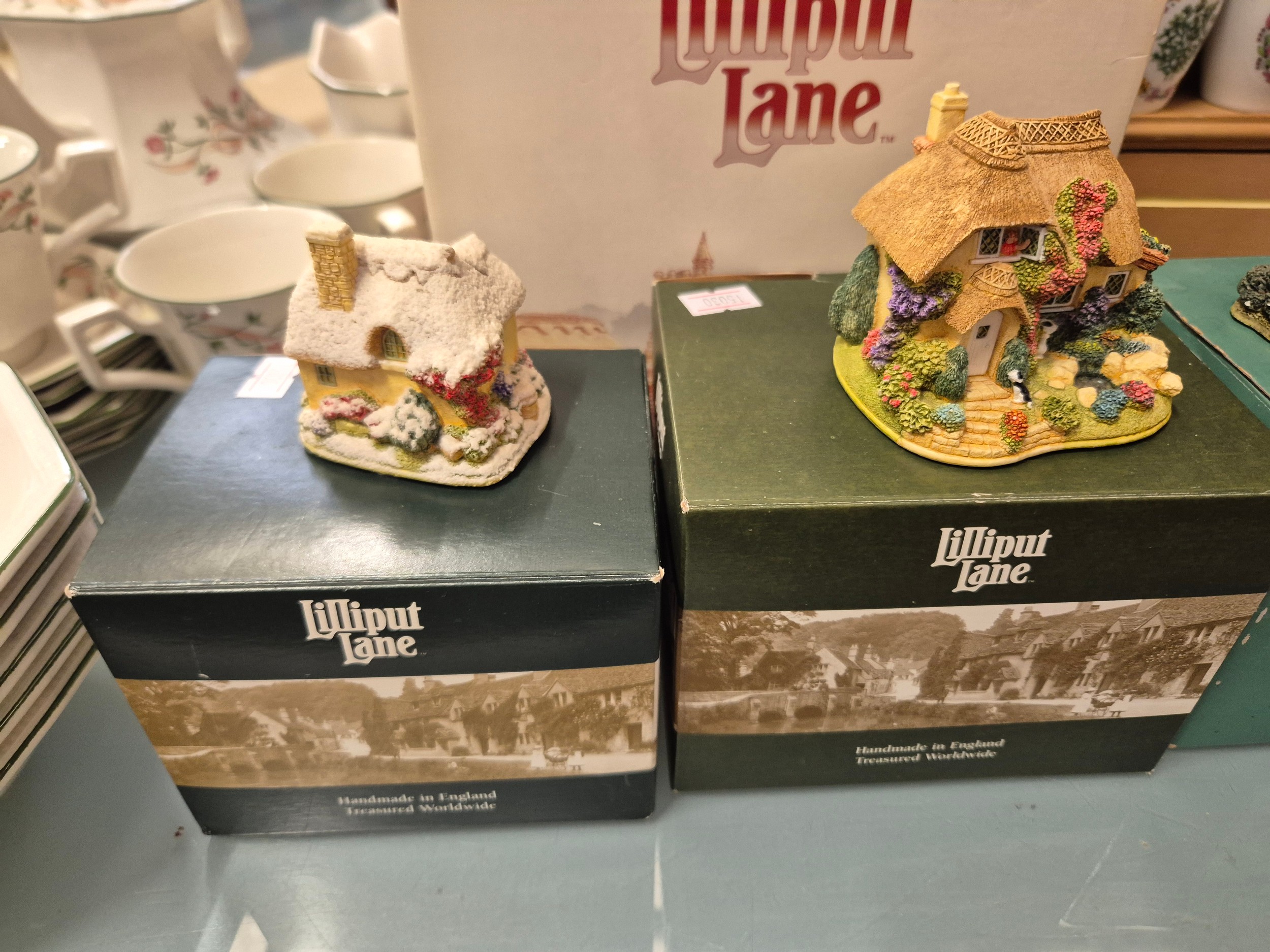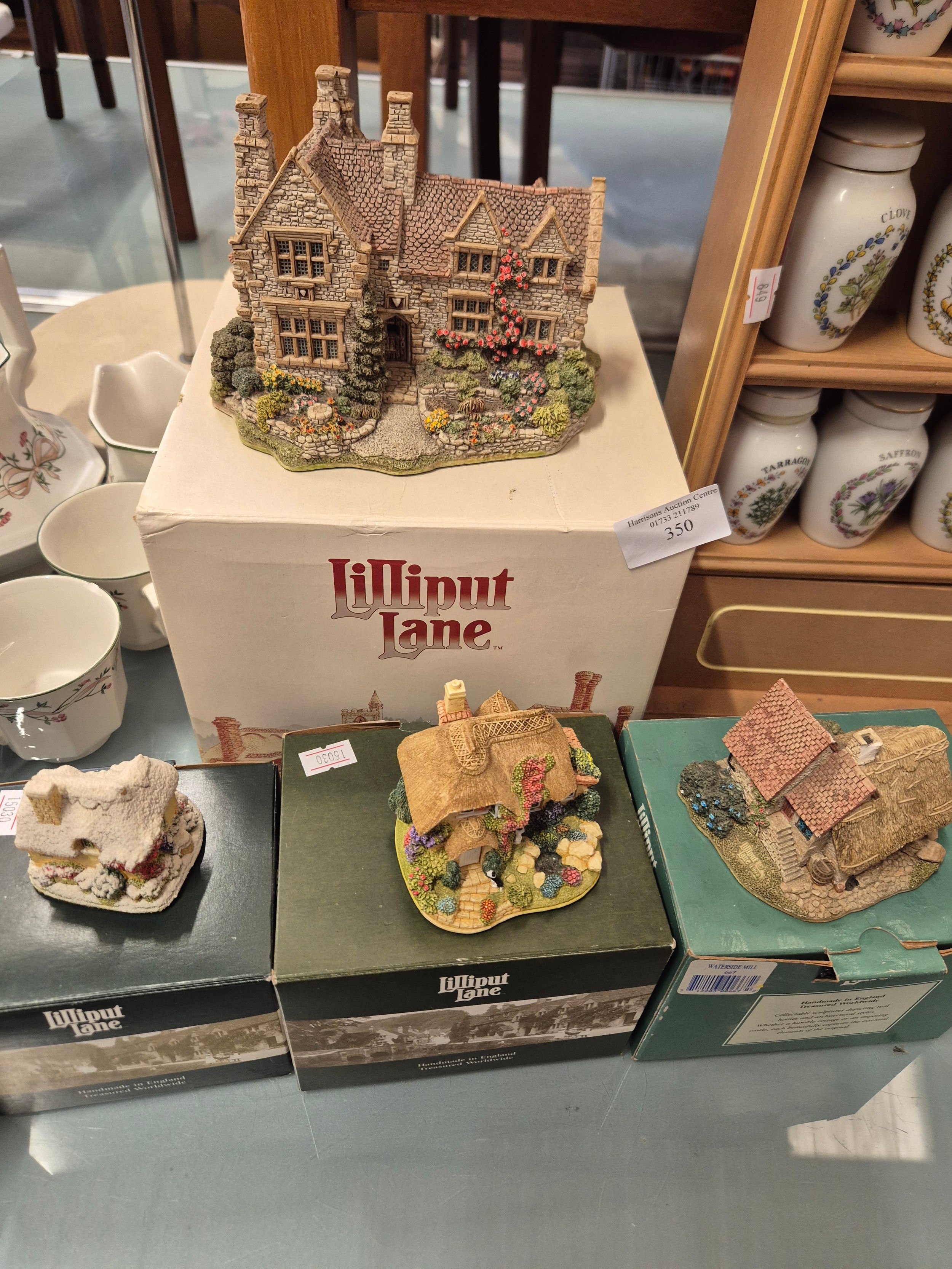 4 Lilliput Lane cottages with the boxes - Little Dog Lost, Winter Warmer, Waterside Mill and Armada House