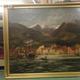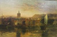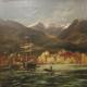 C19th Oil On Canvas Shore Scene with white red roofed buildings, single funnel steam ship & 2 masted sailing vessels, man in small dinghy to fore, snow capped hills to distance under cloudy sky by R. Gallon (English Artist Robert Gallon 1845-1925) in simple gilt frame, approx. 32' x 21'