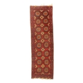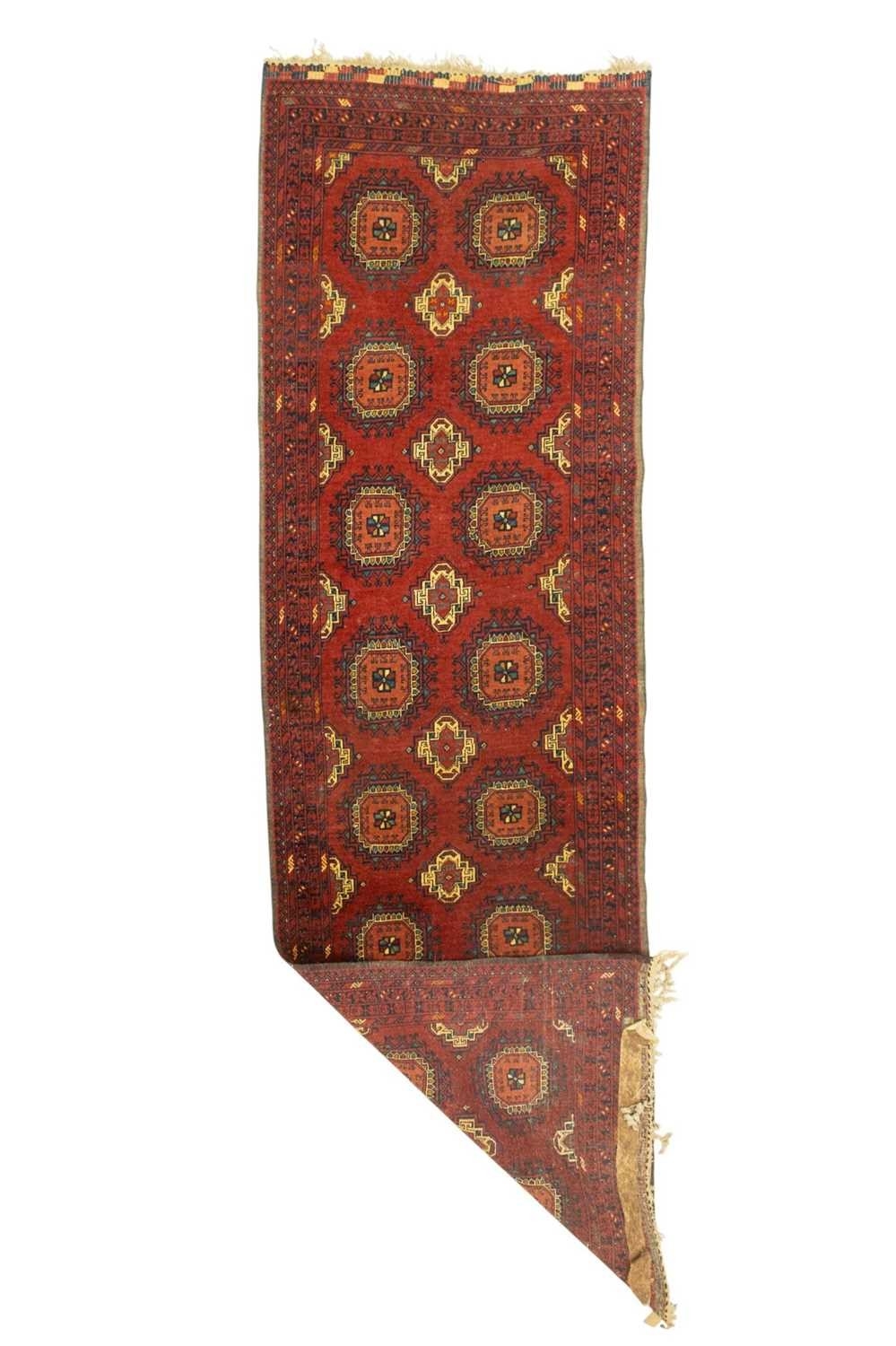 An Afghan wool carpet runner. Red ground, repeating central guls within multiple patterned borders, wool pile and wool foundation, 278cm x 88cm.