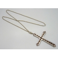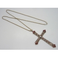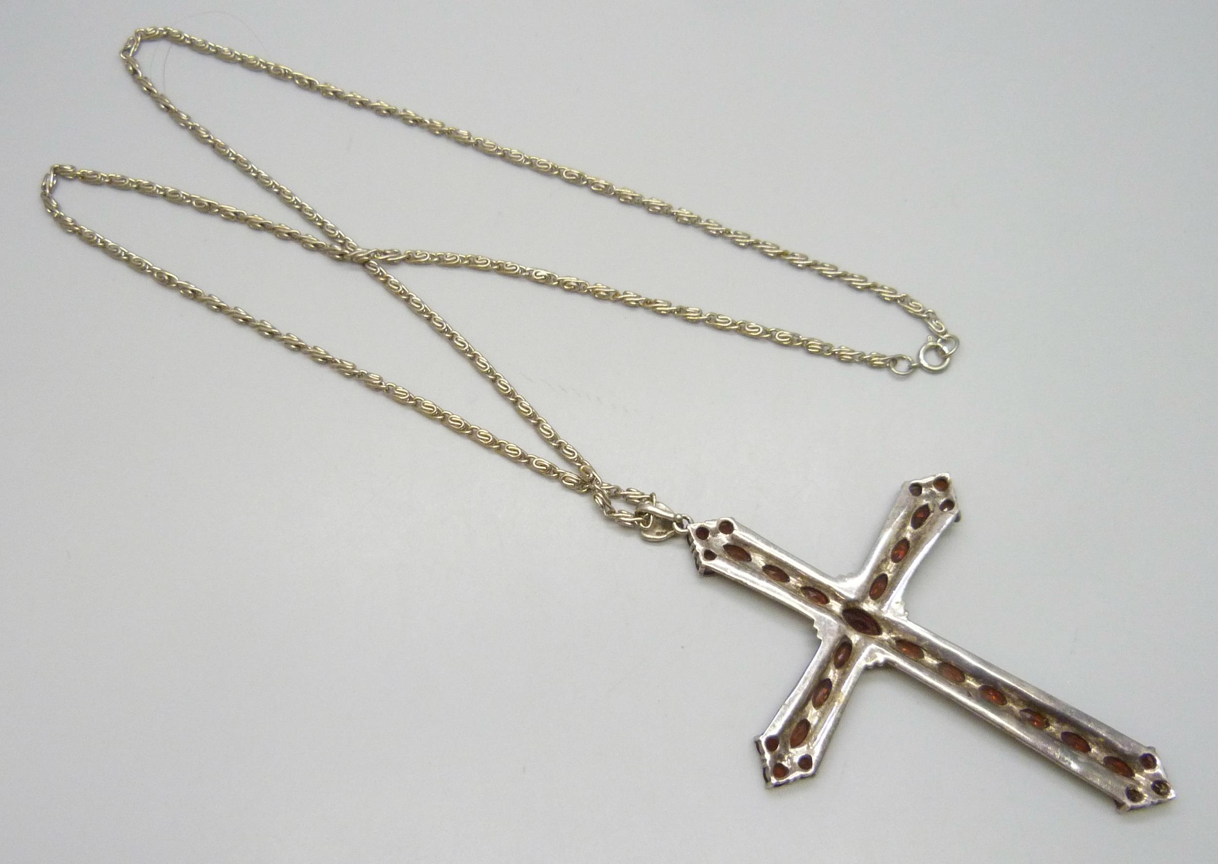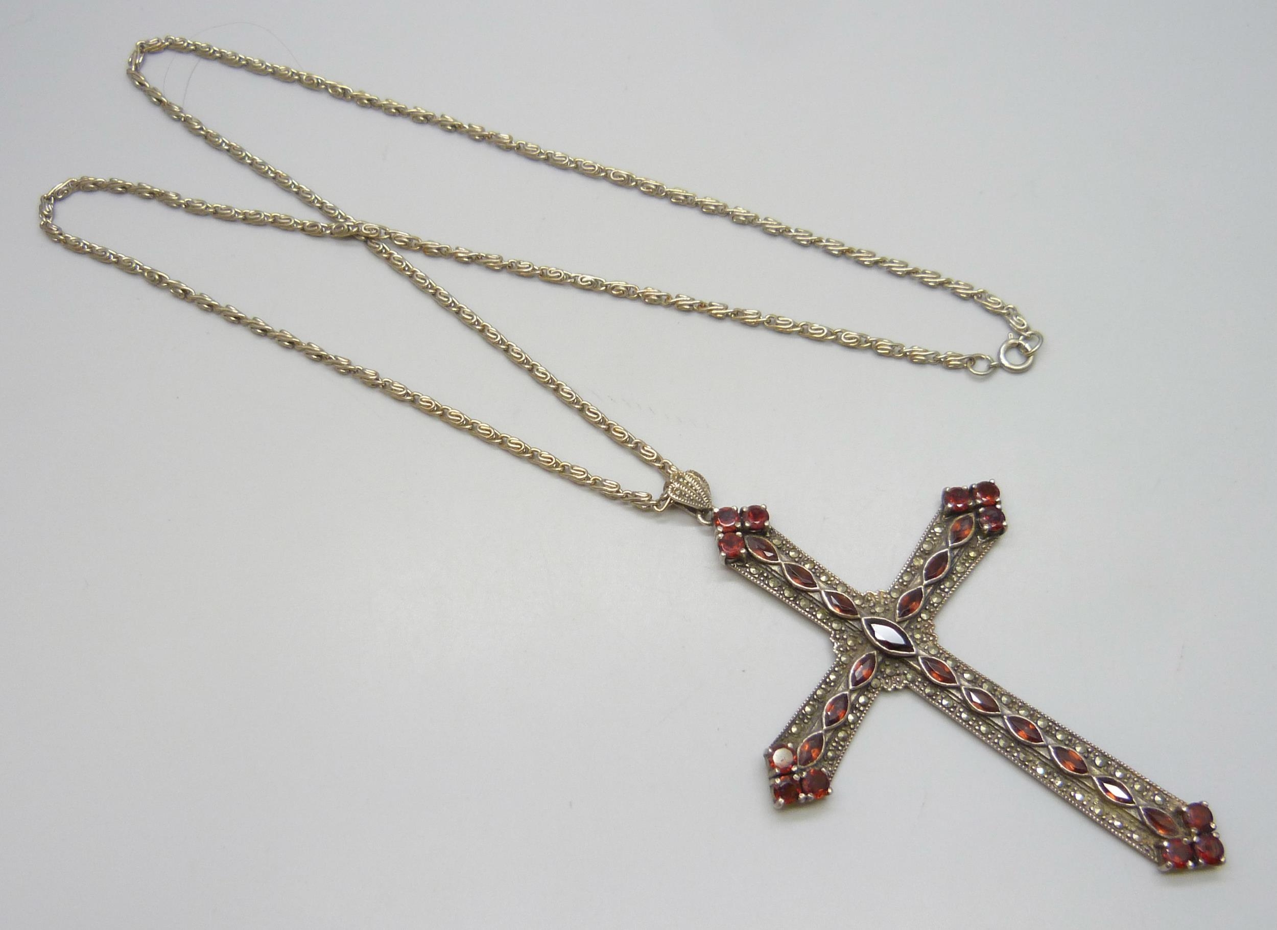 A large silver cross pendant set with garnet and marcasite, 11.5cm including bail, 24g, on a plated chain