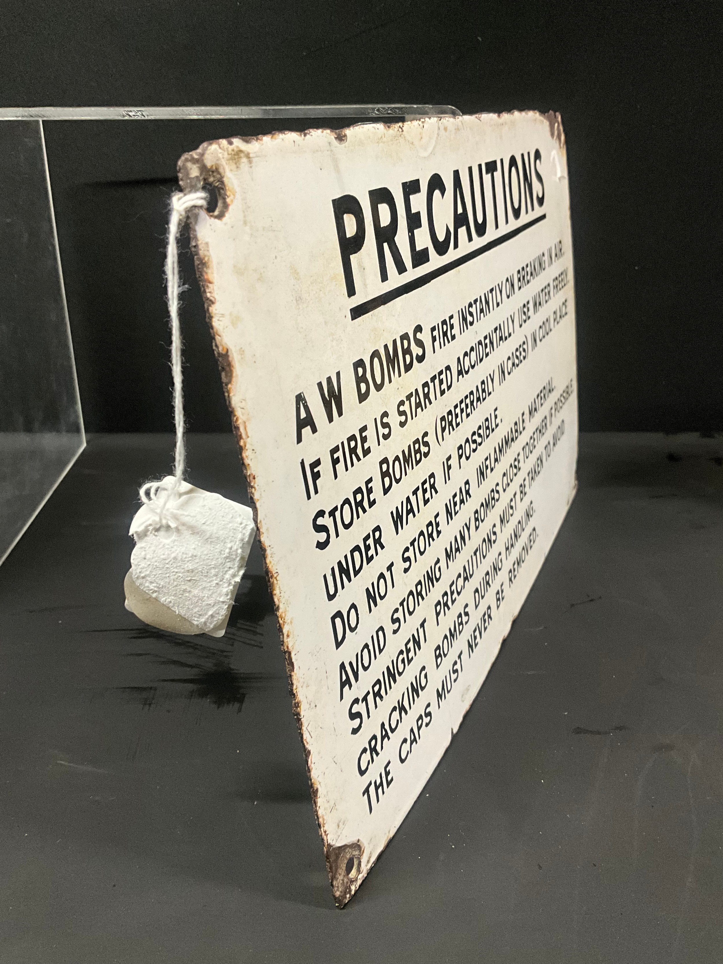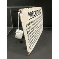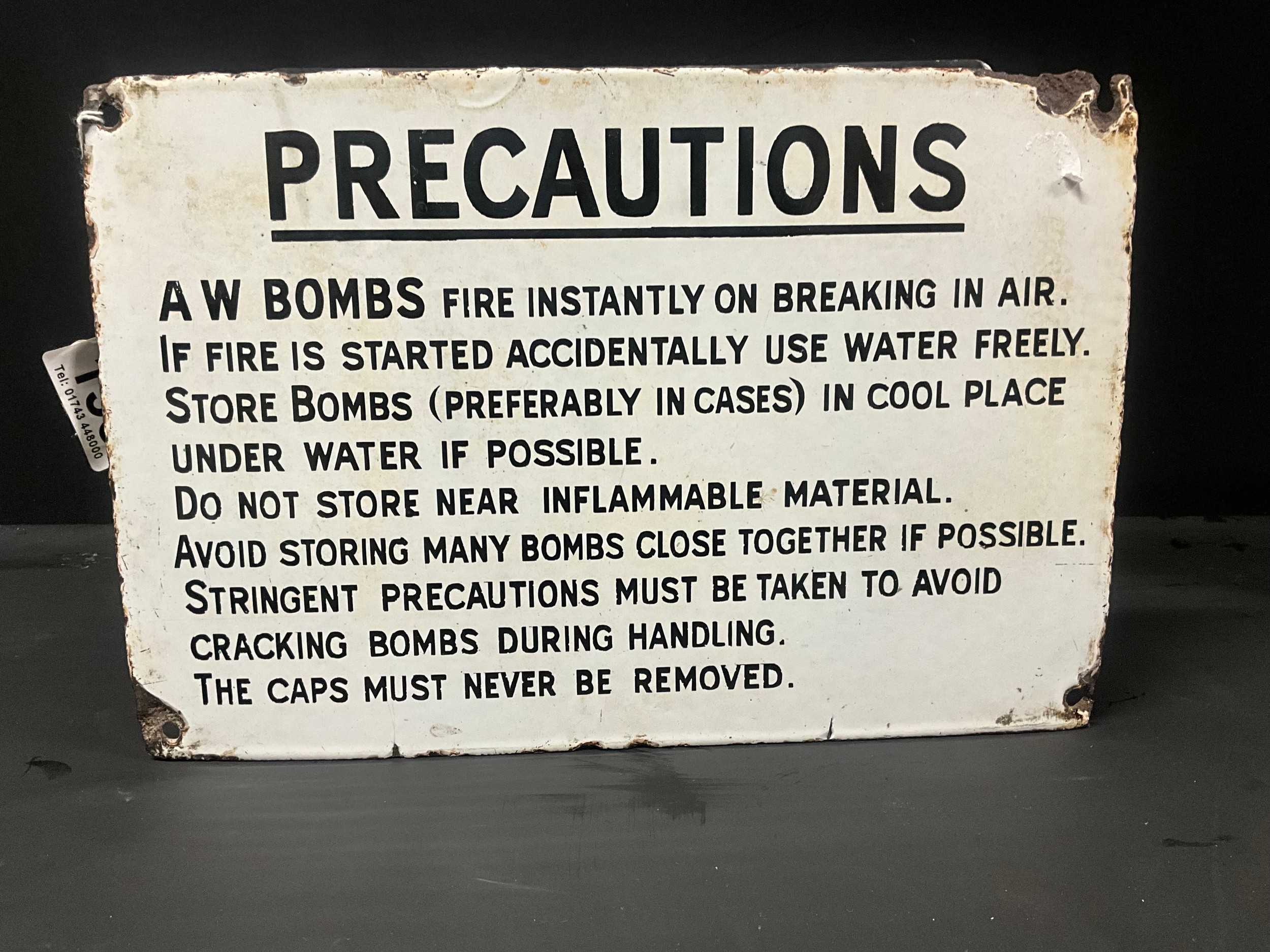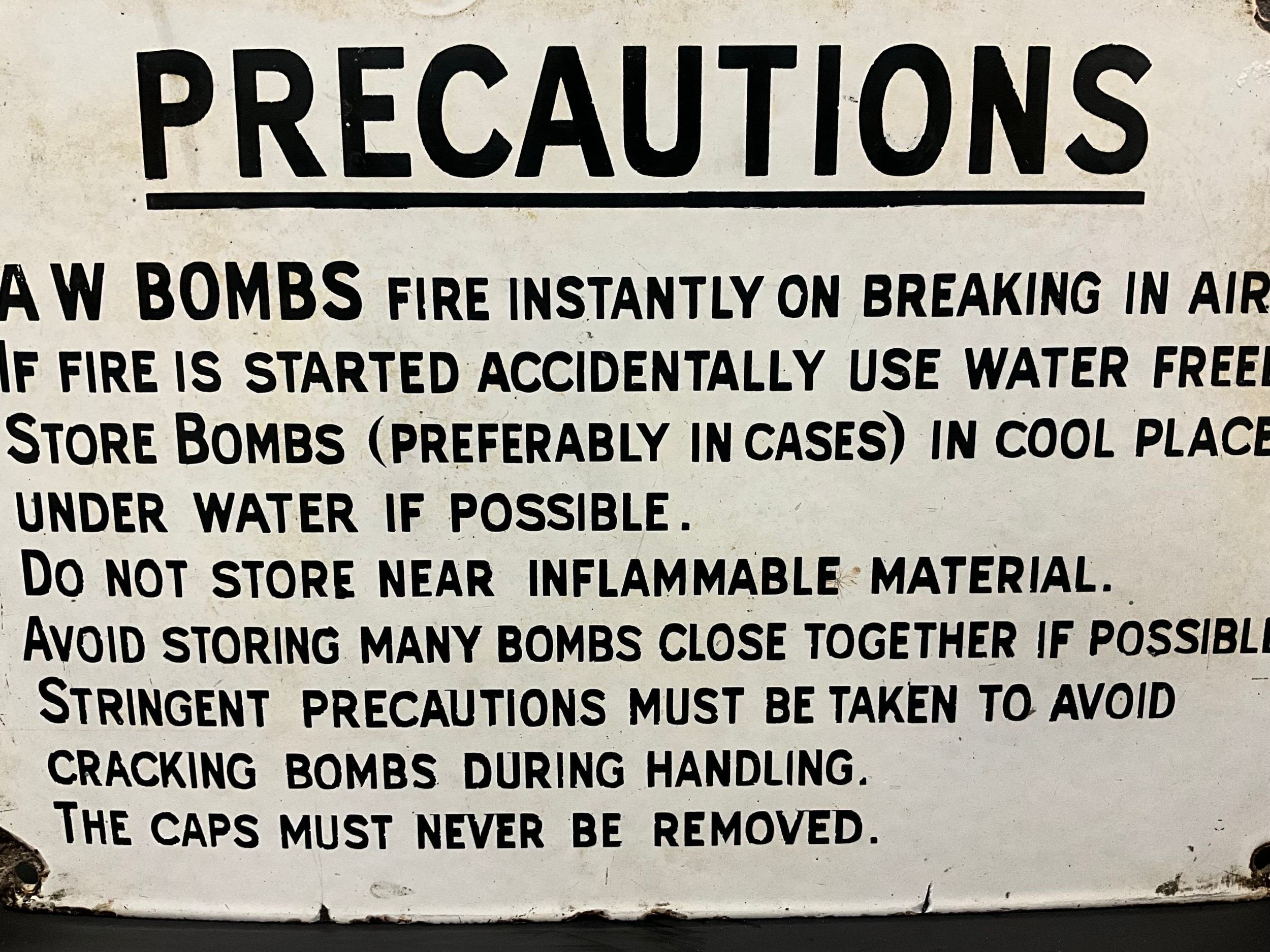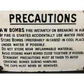 VINTAGE ENAMEL PRECAUTIONS BOMB SIGN 12" X 8"