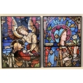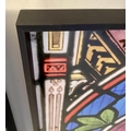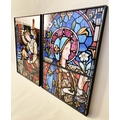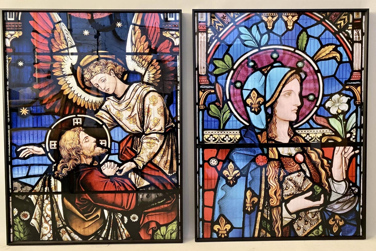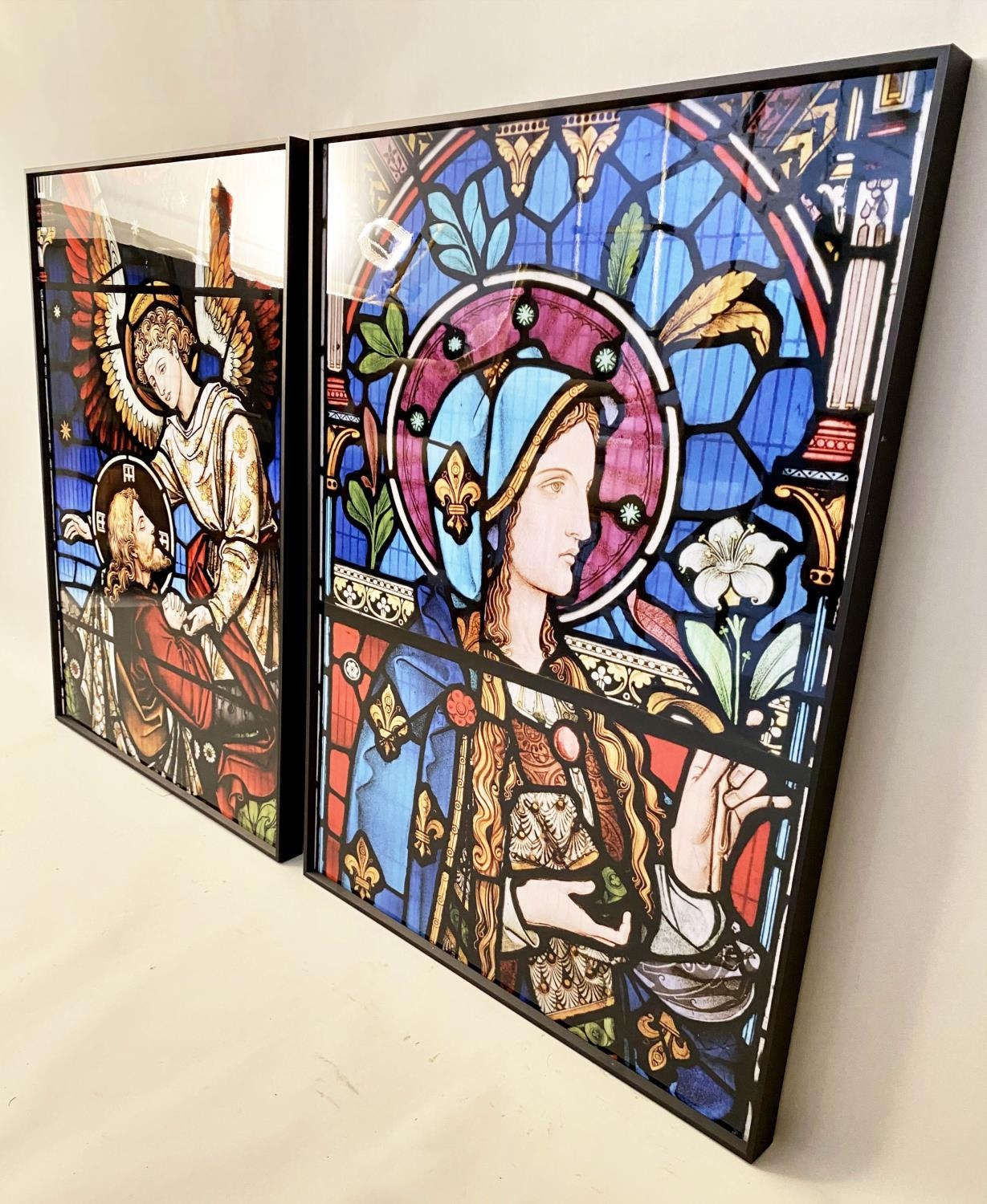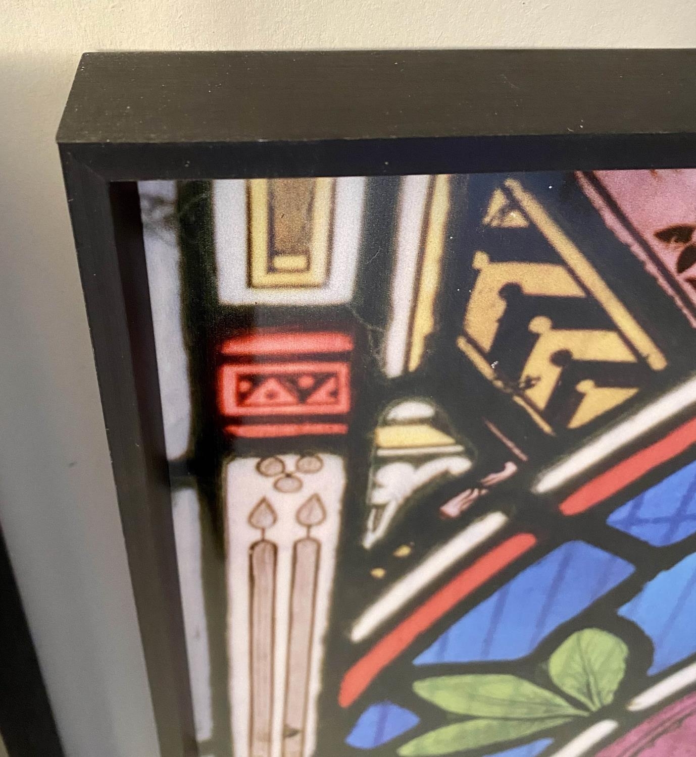 PRINTS OF CHURCH STAINED GLASS WINDOWS, a pair, print on glass framed stained glass design, 81cm H x 6cm. (2)