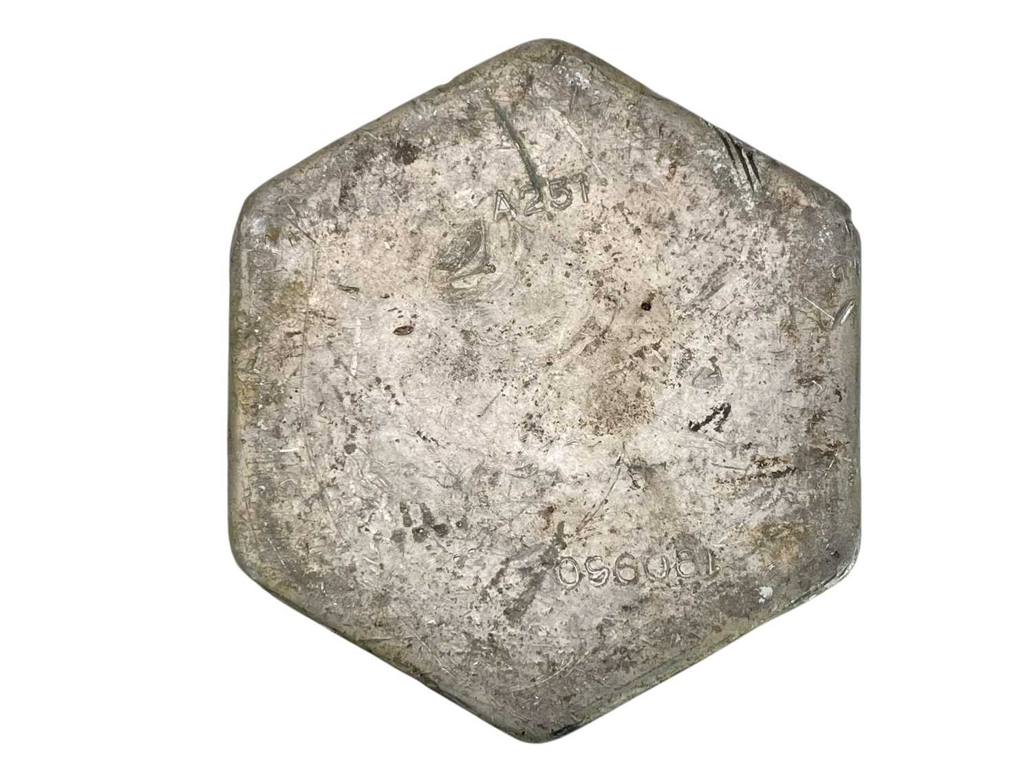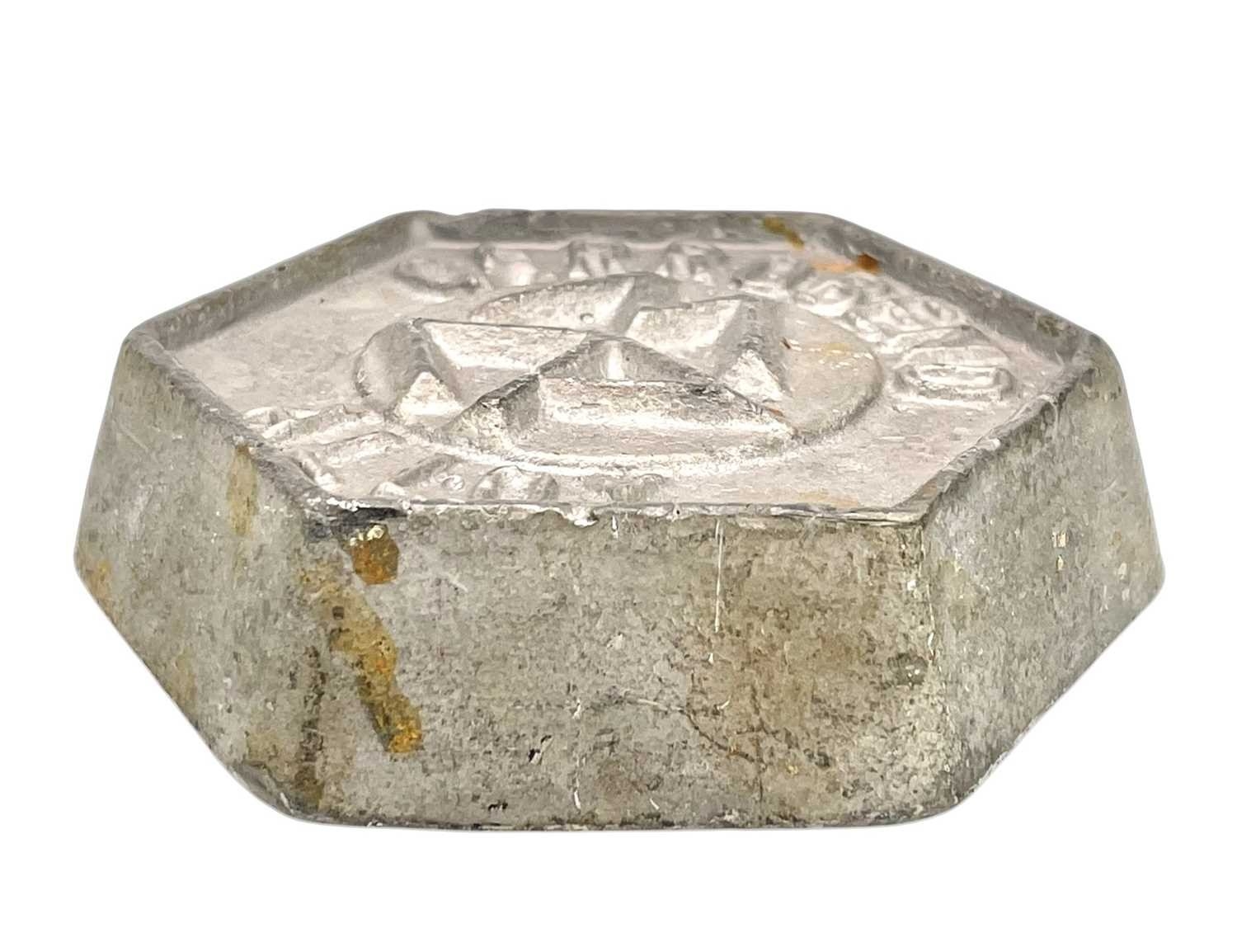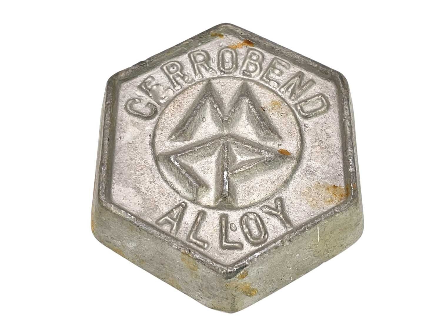 A Cerrobend Alloy metal ingot. Stamped number 190960 and A251, width 8.5cm, weight 950gr.