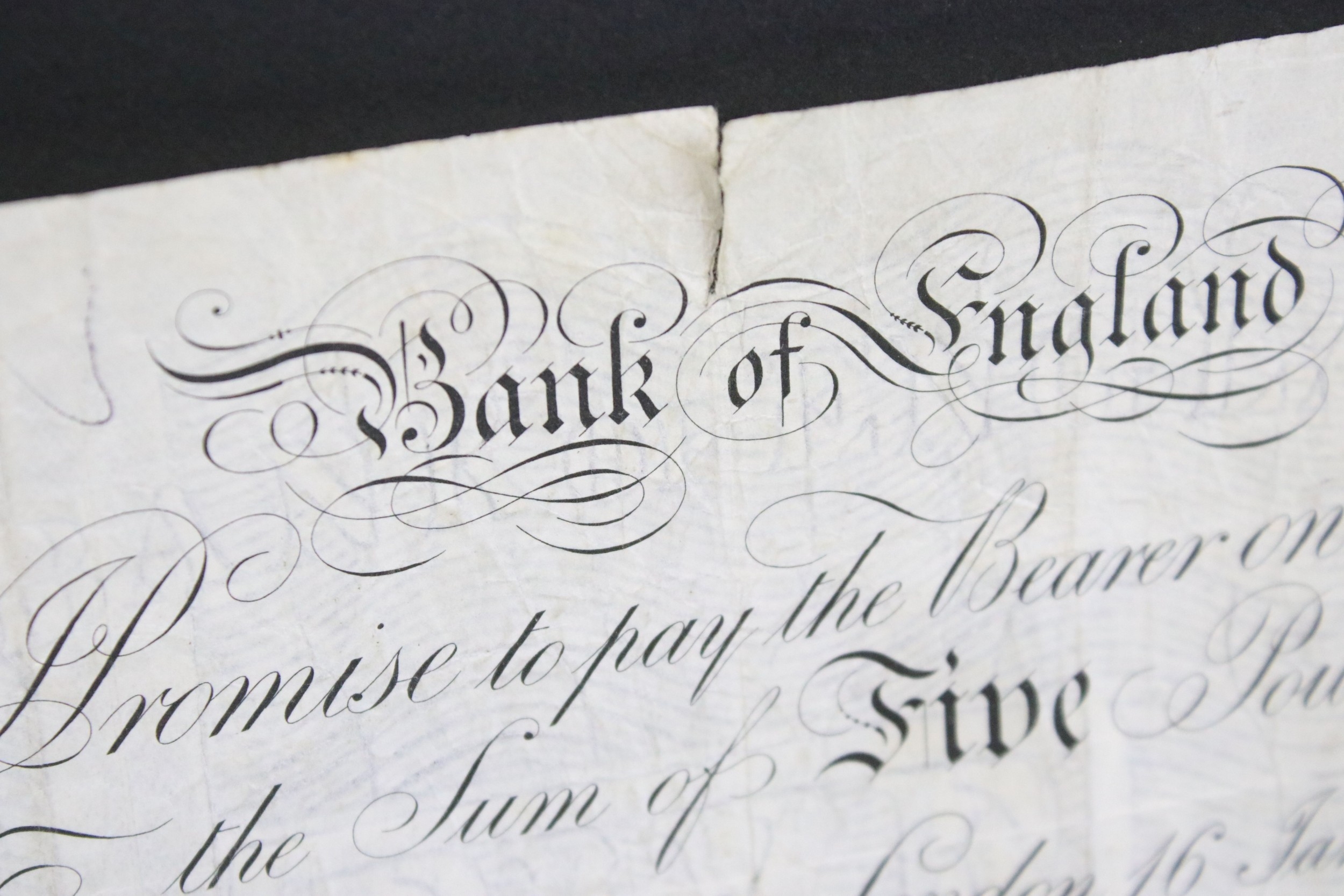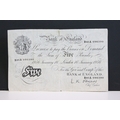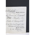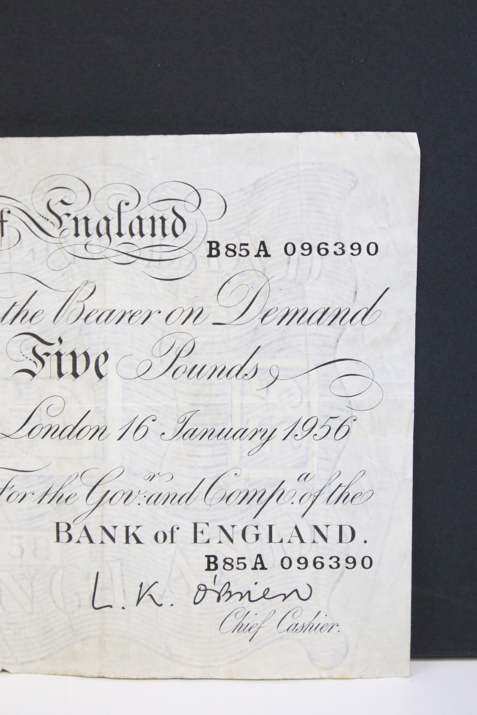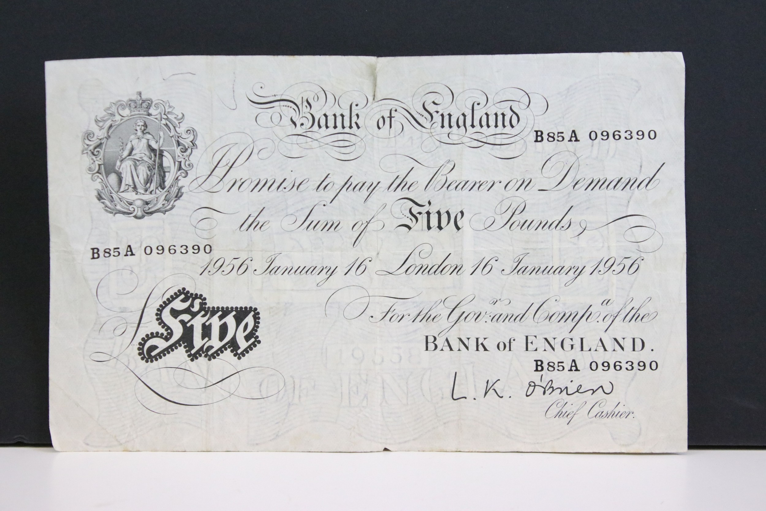 A United Kingdom Bank of England White £5 banknote, serial numbered B85A 096390 with Chief Cashier L.K. O'Brien.