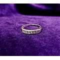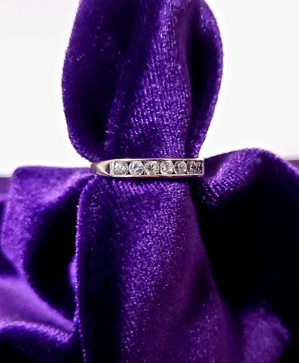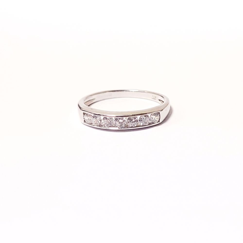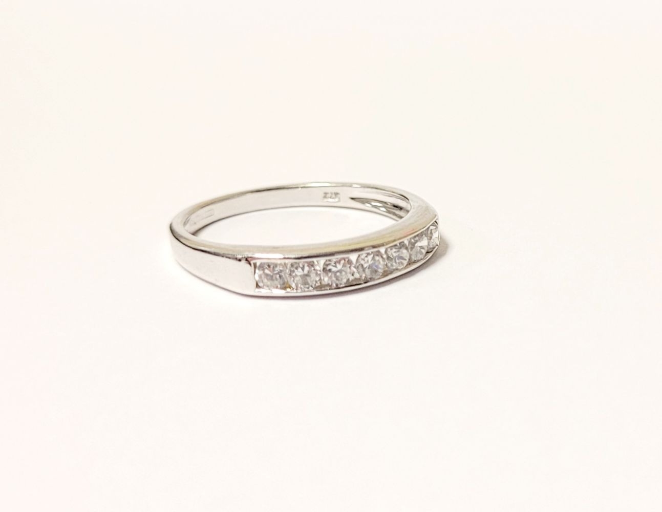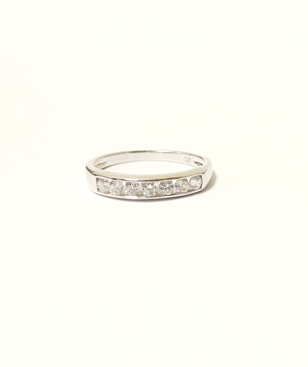 A LOVELY SEVEN STONE 9CT WHITE GOLD DIAMOND RING / HALF ETERNITY, 375 marked. Ring size Q.