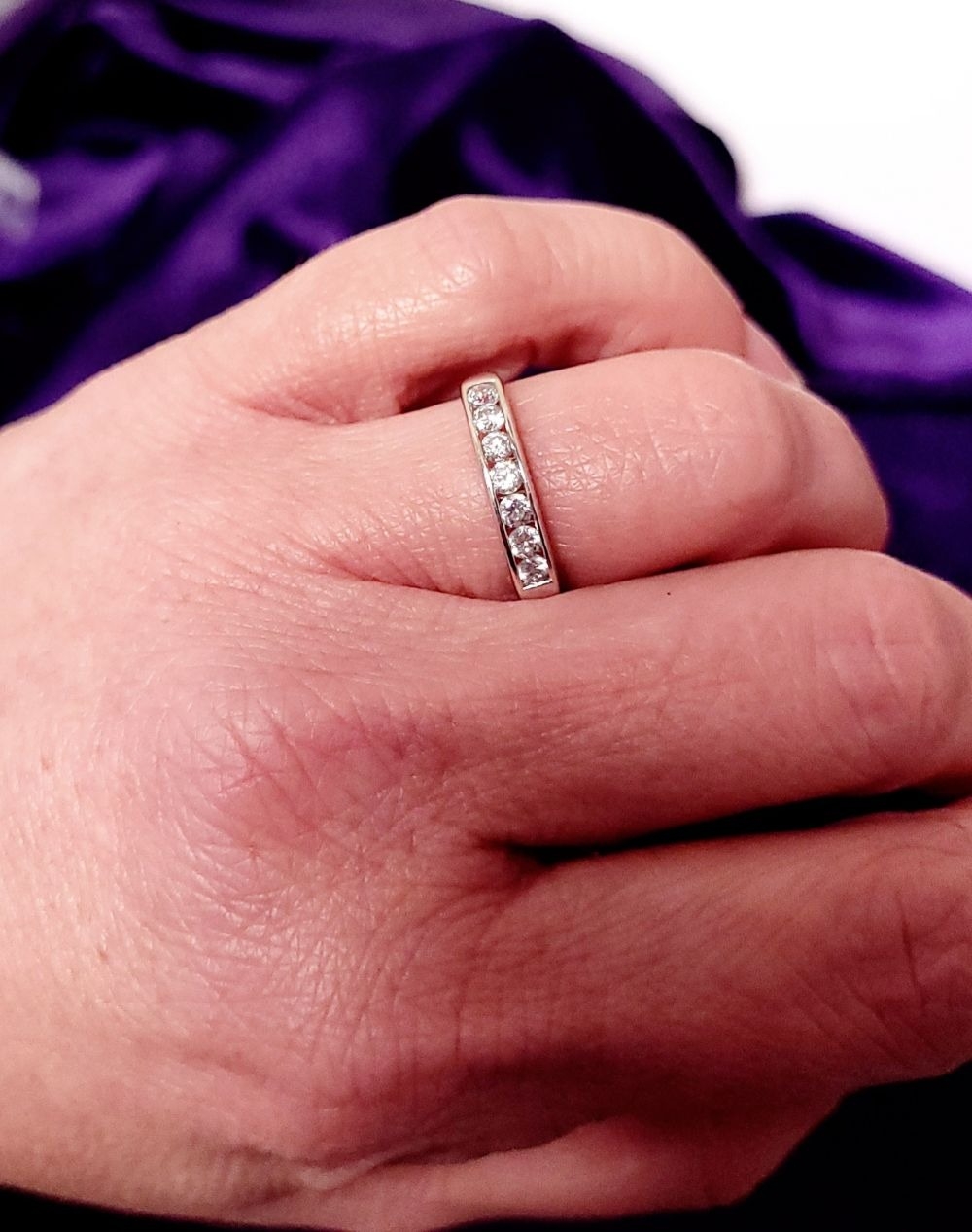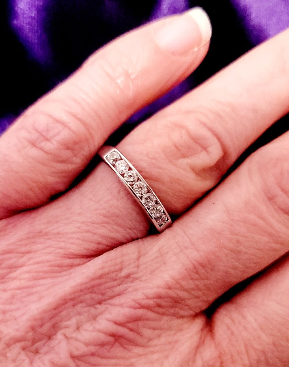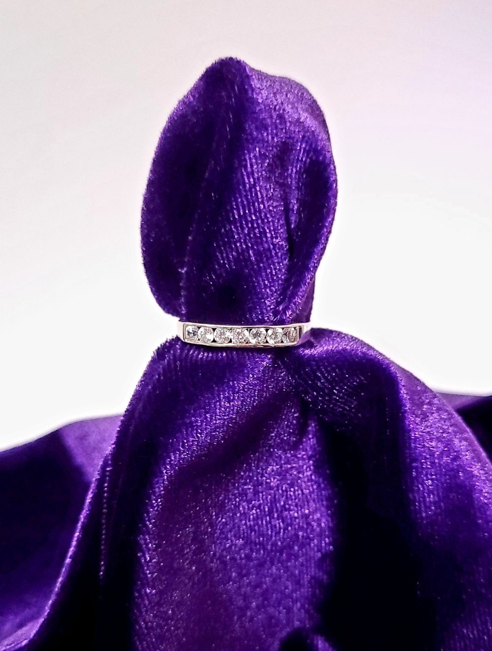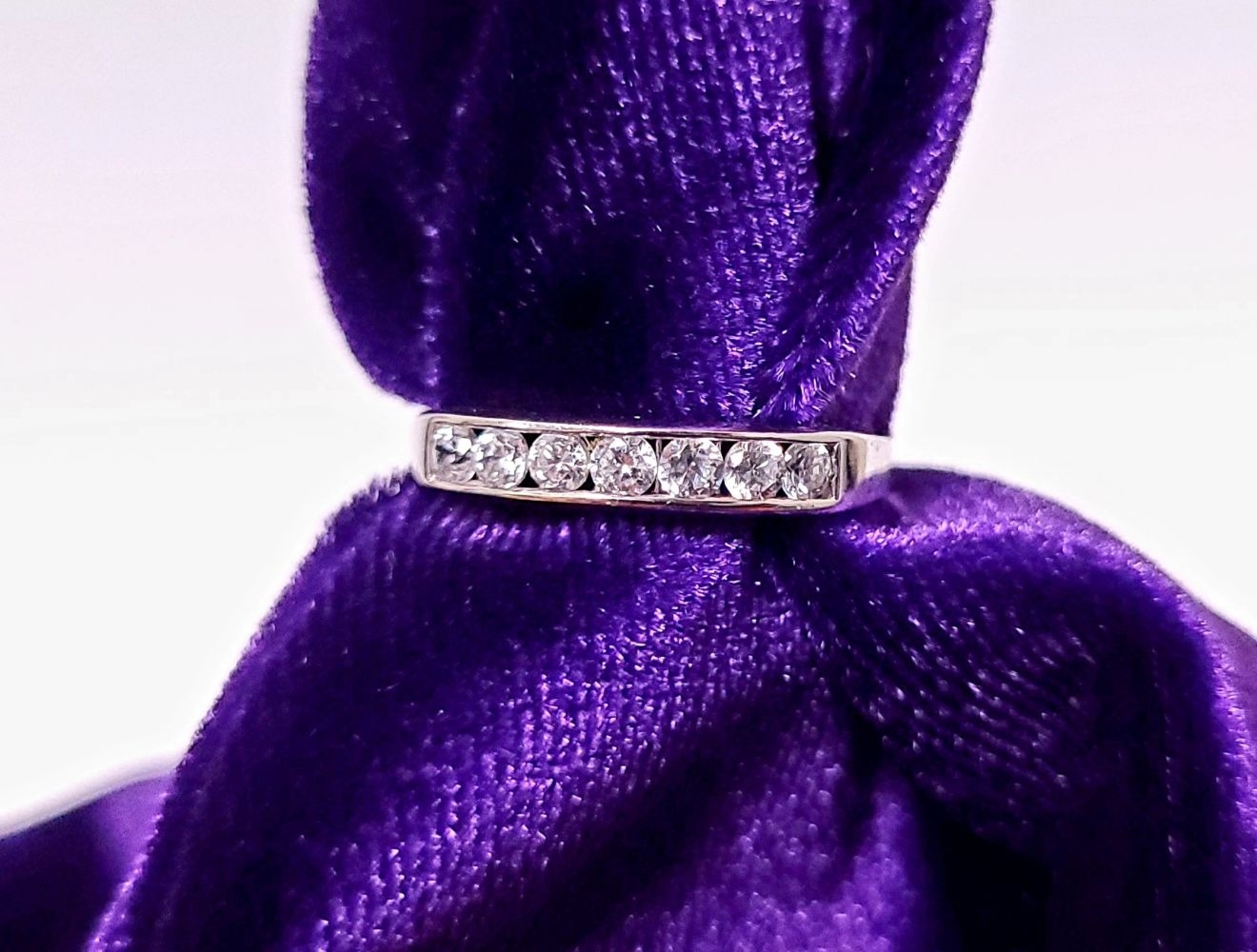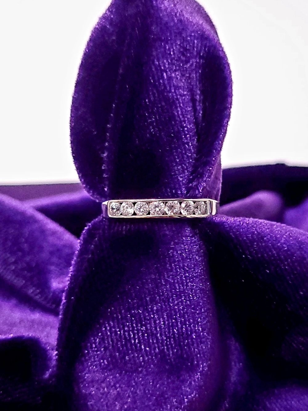 A LOVELY SEVEN STONE 9CT WHITE GOLD DIAMOND RING / HALF ETERNITY, 375 marked. Ring size Q.