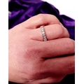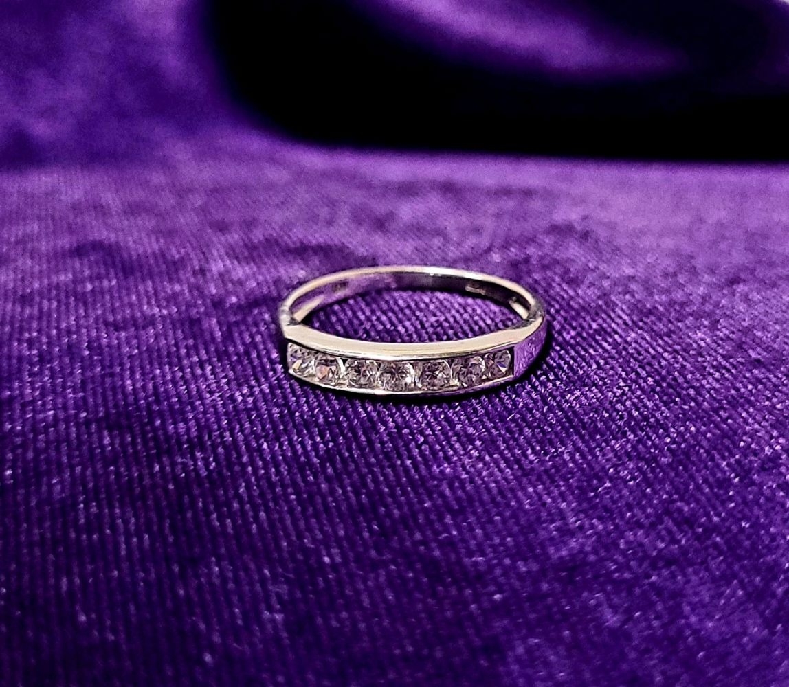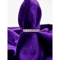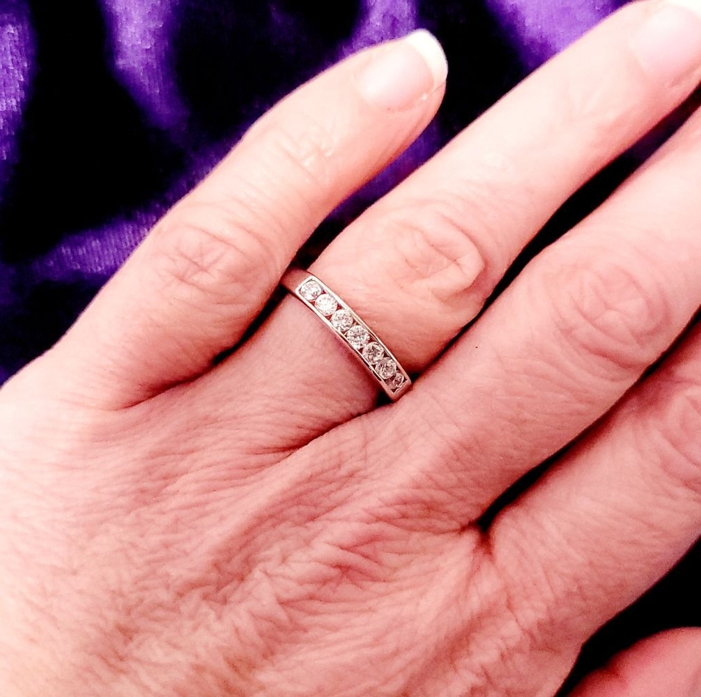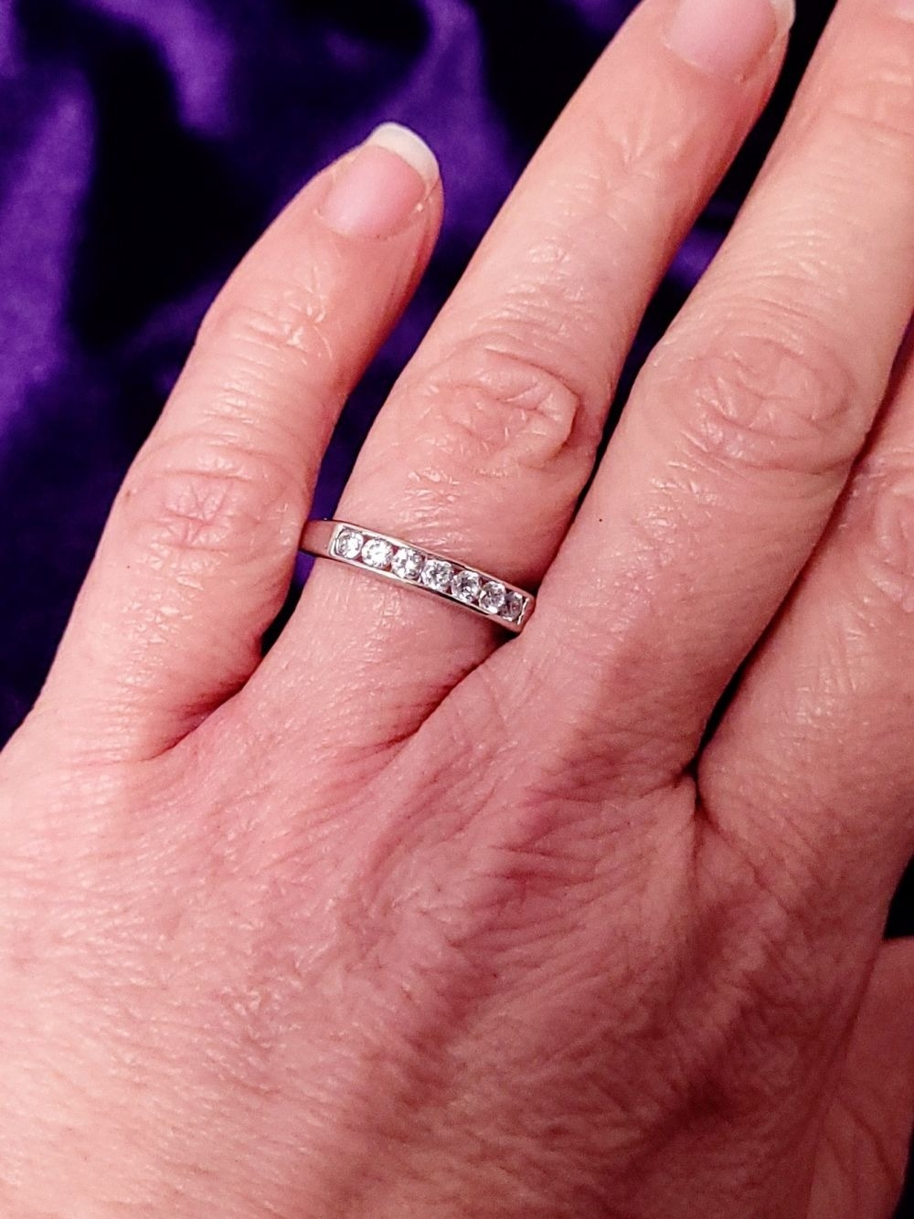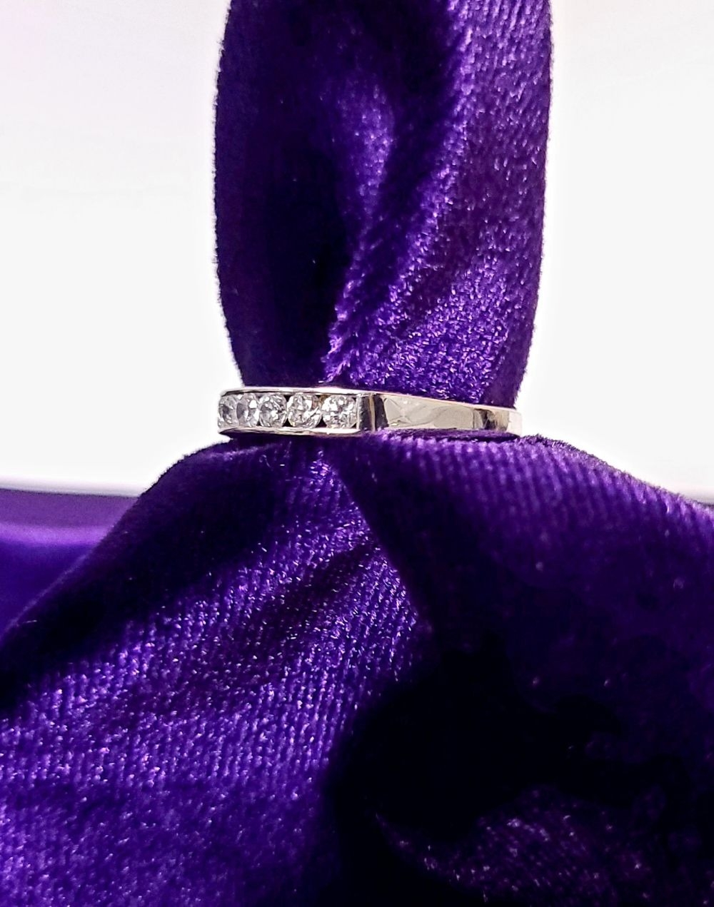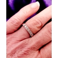 A LOVELY SEVEN STONE 9CT WHITE GOLD DIAMOND RING / HALF ETERNITY, 375 marked. Ring size Q.