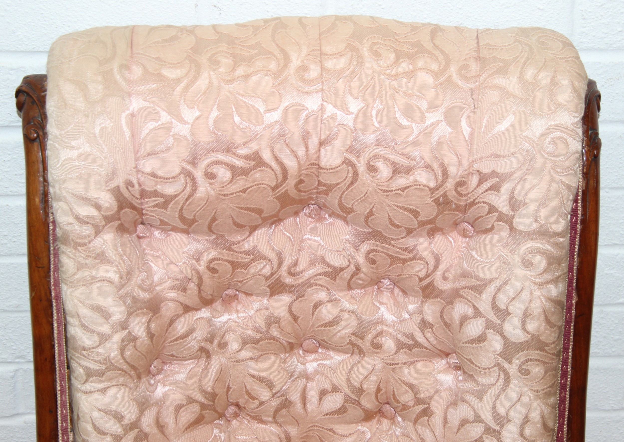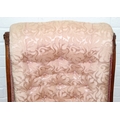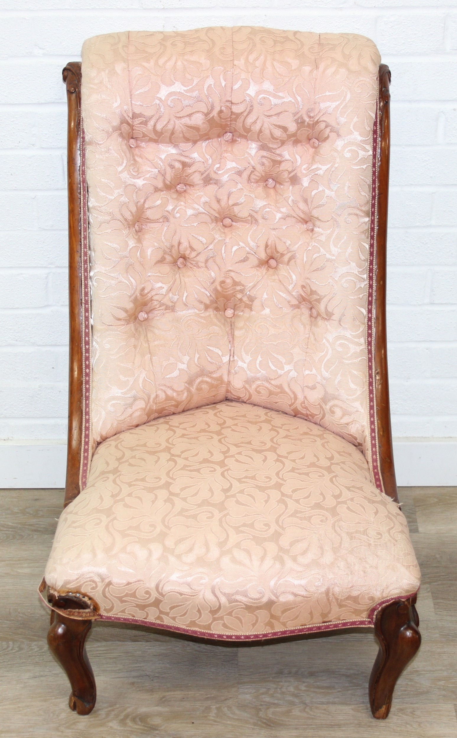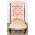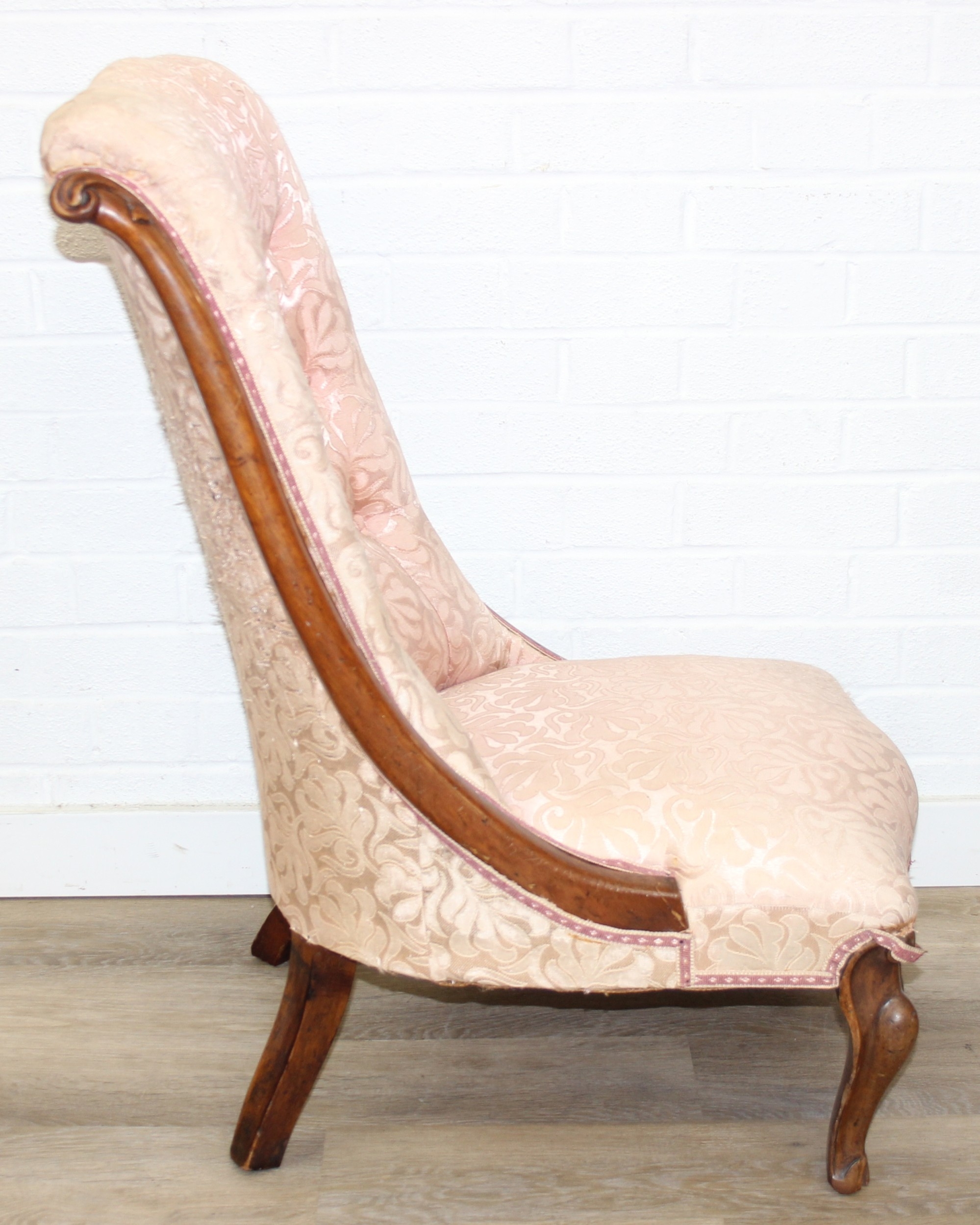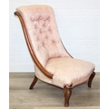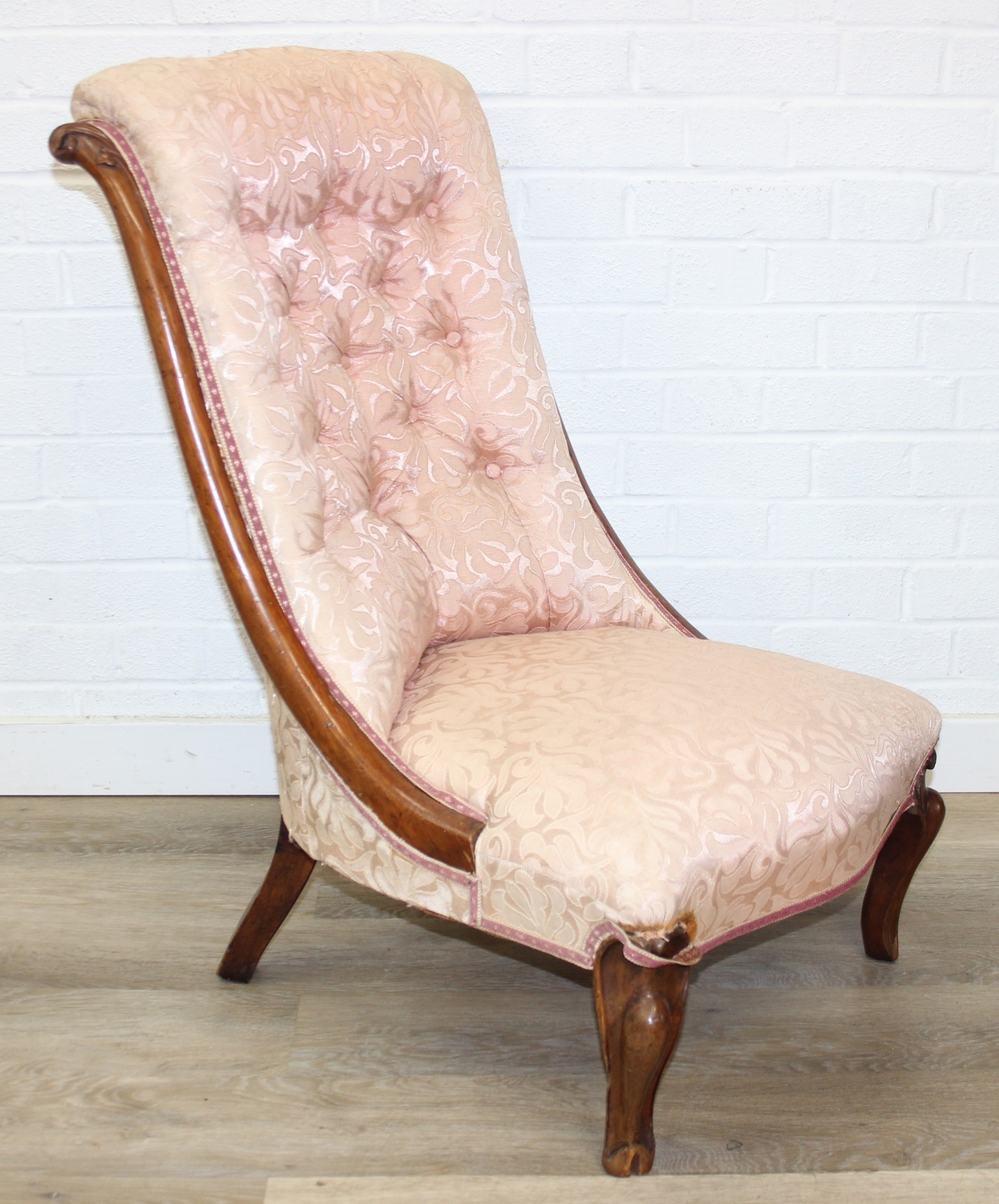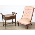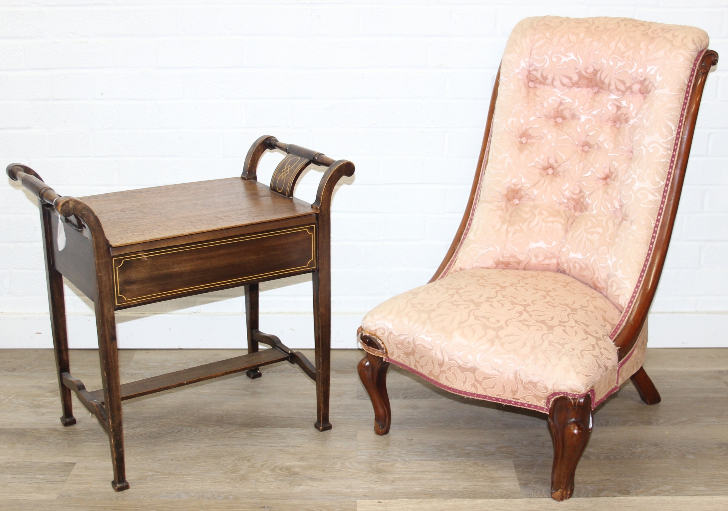 An antique piano stool with lift up lid and boxwood inlay, later top and a Victorian low chair with shaped button back, pink patterned upholstery and exposed carved mahogany frame [2]