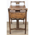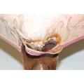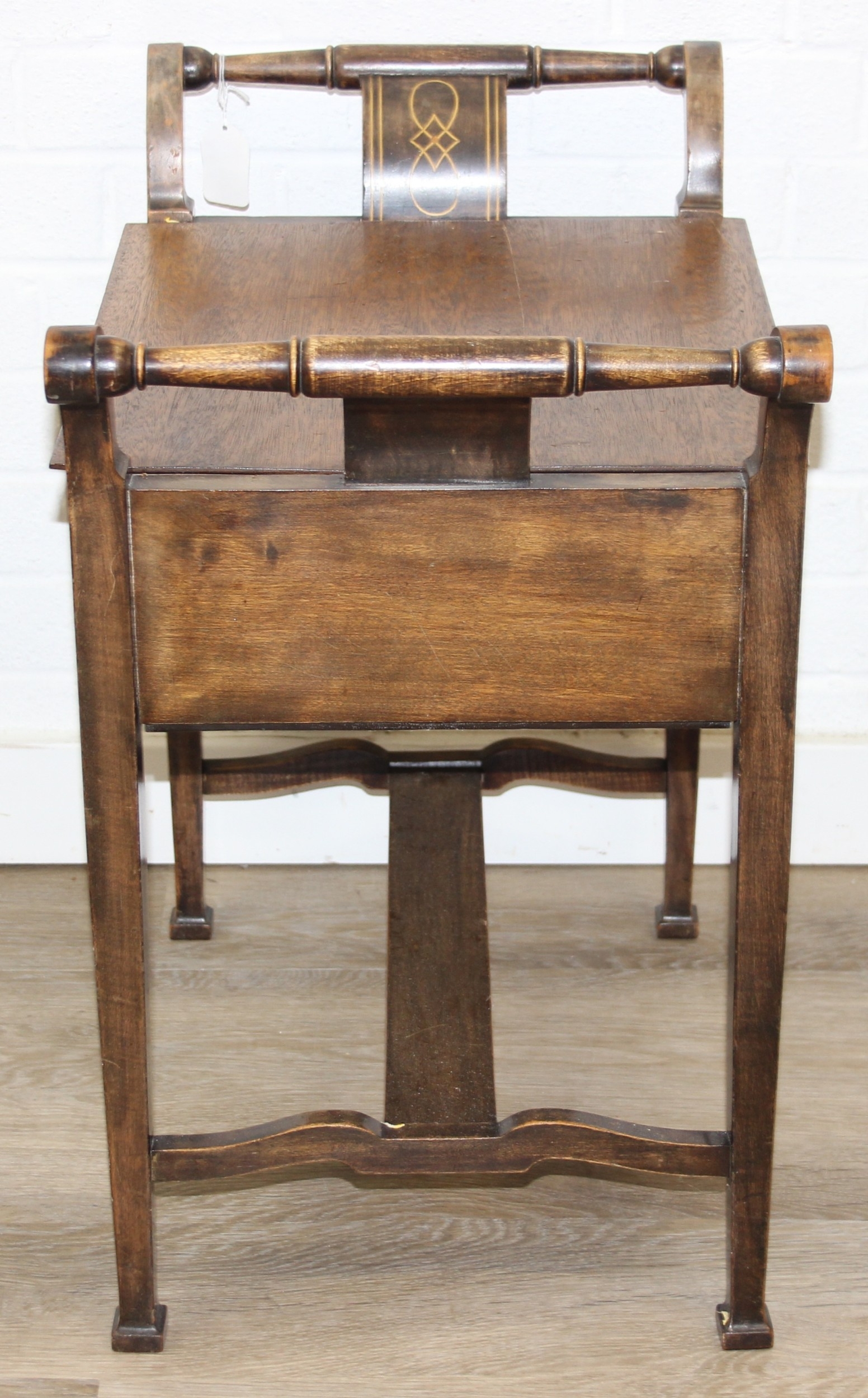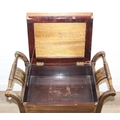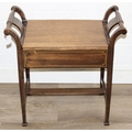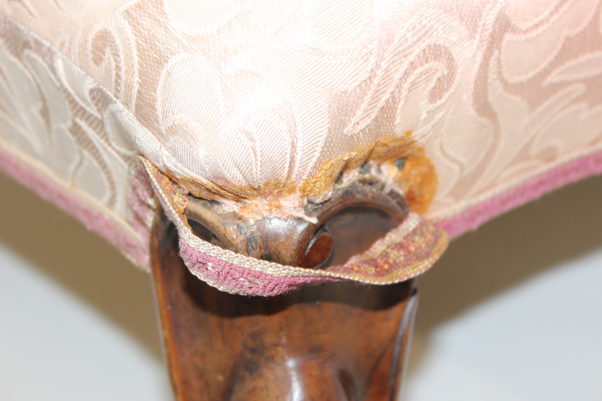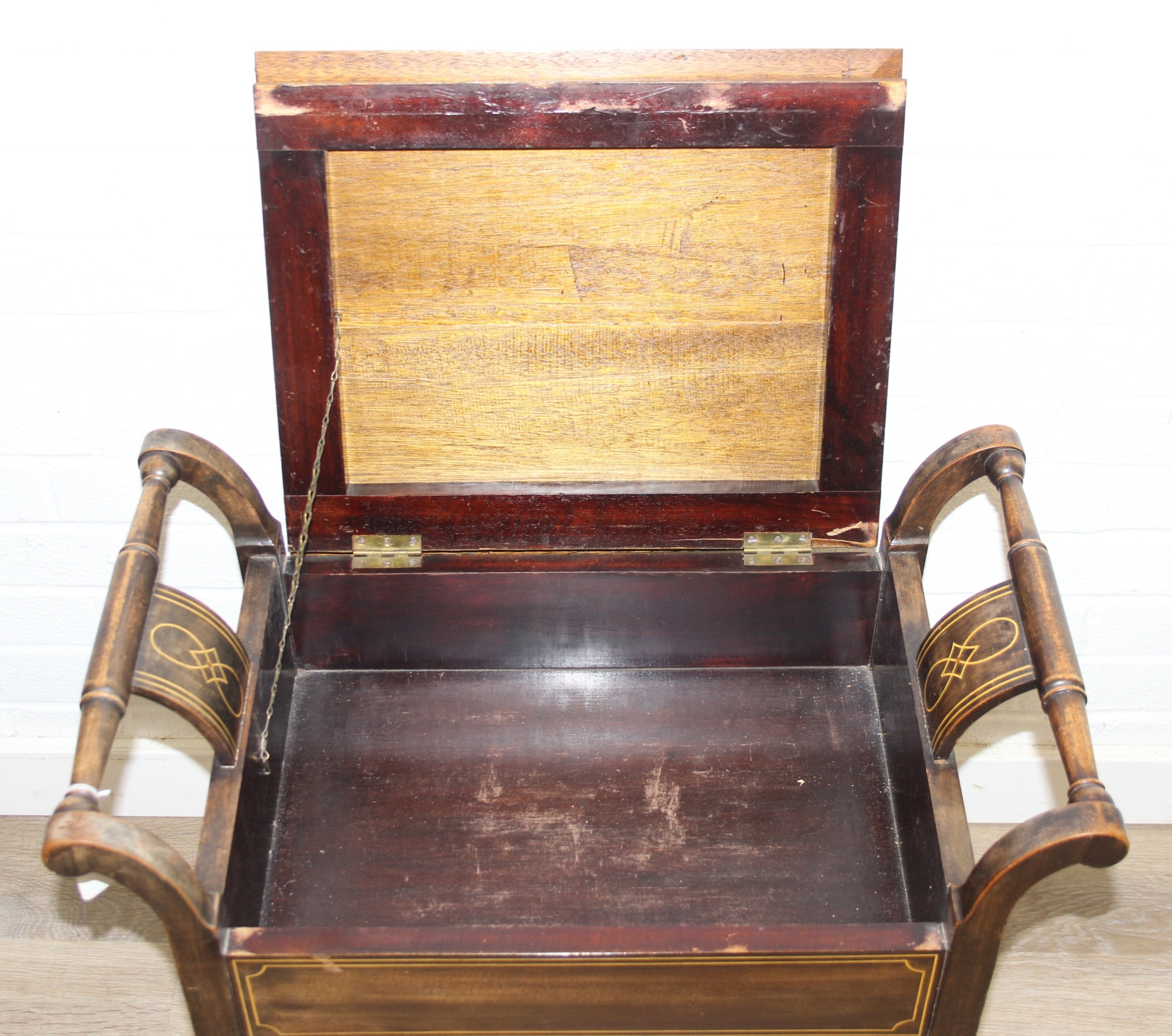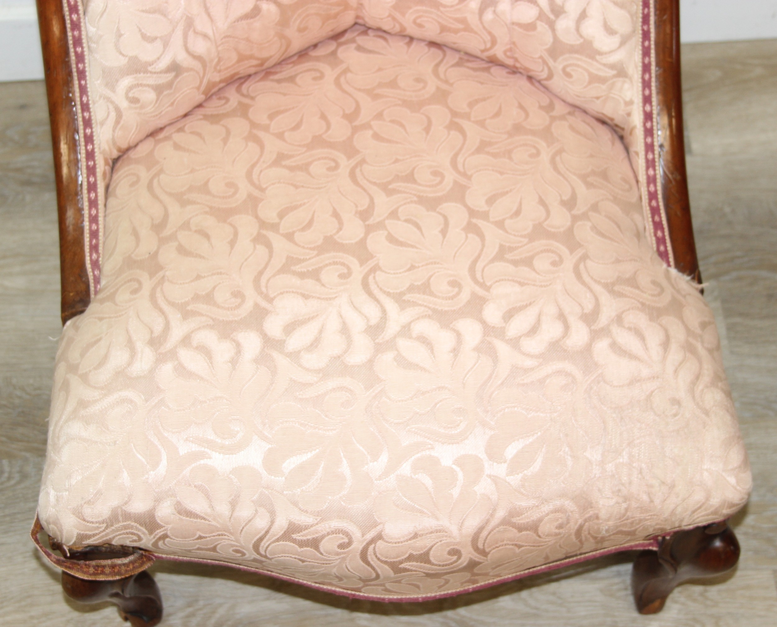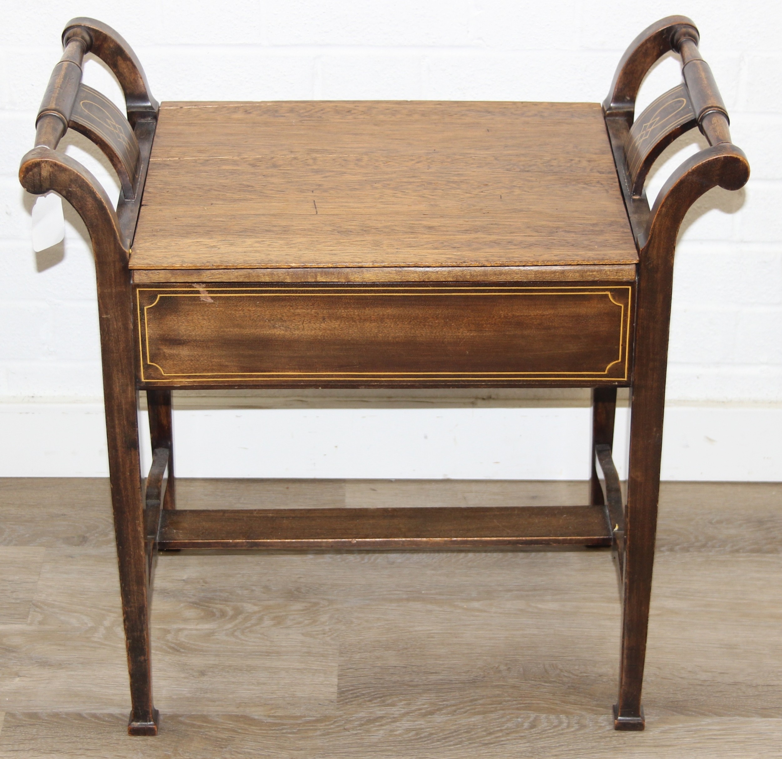 An antique piano stool with lift up lid and boxwood inlay, later top and a Victorian low chair with shaped button back, pink patterned upholstery and exposed carved mahogany frame [2]
