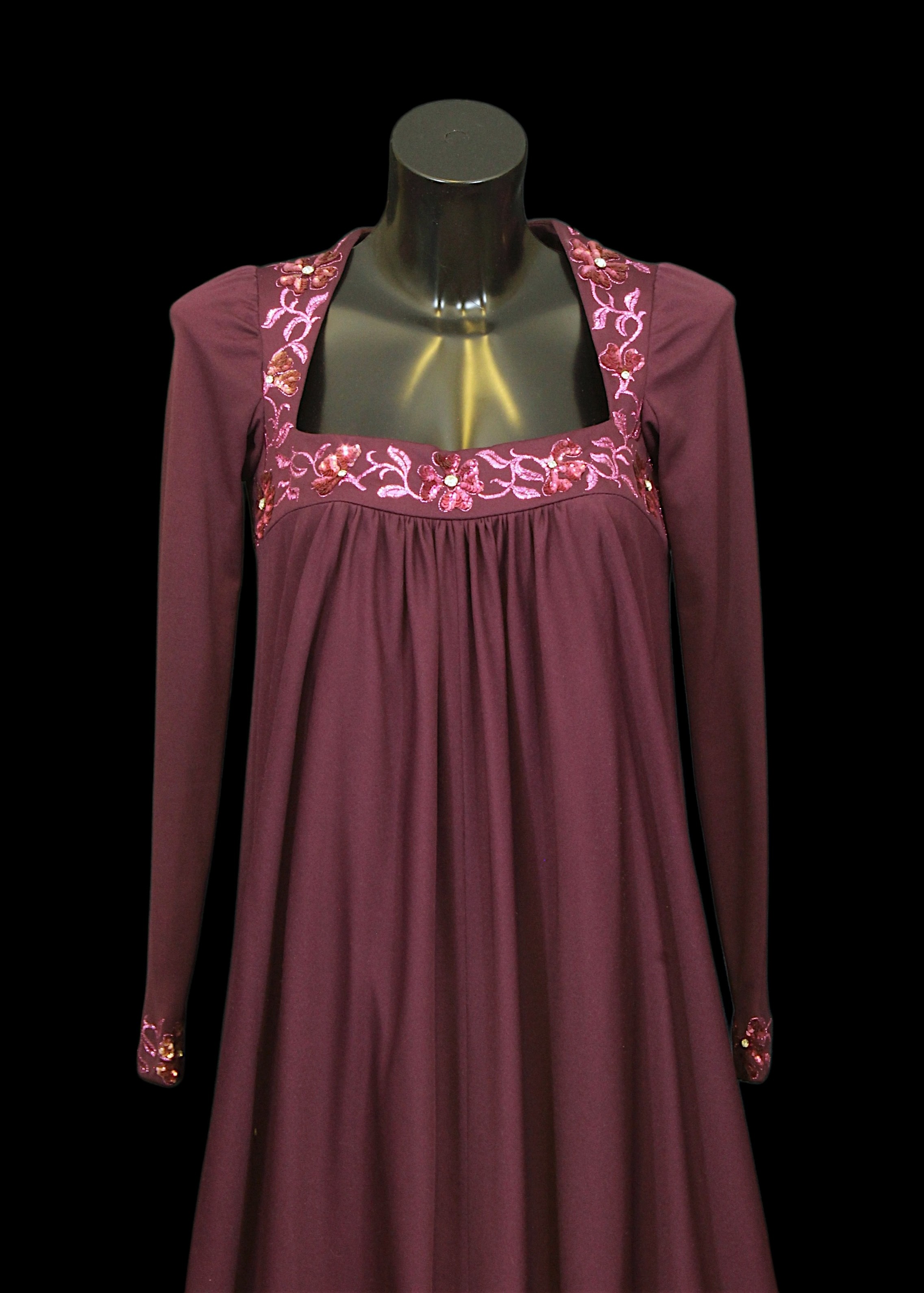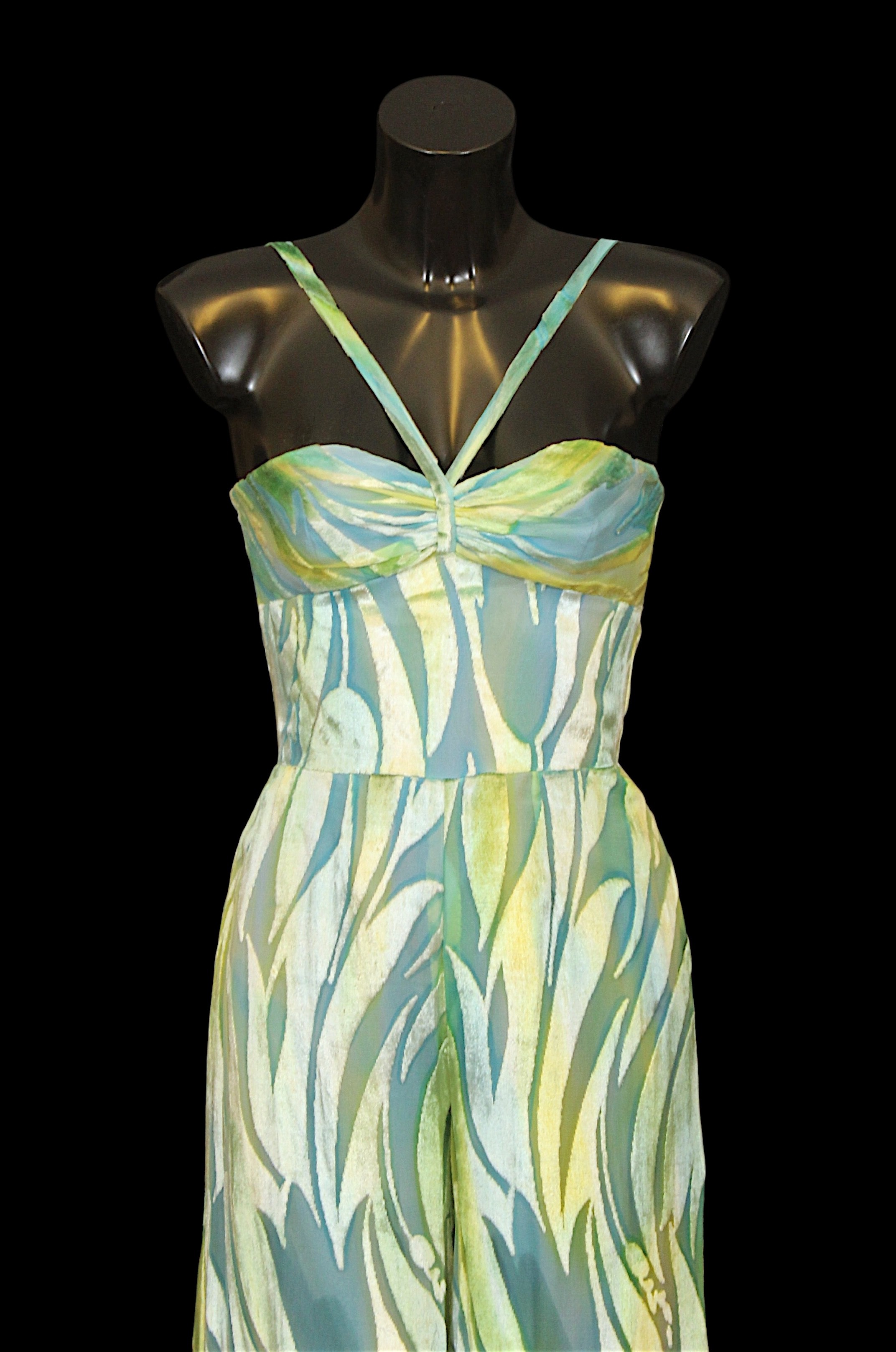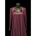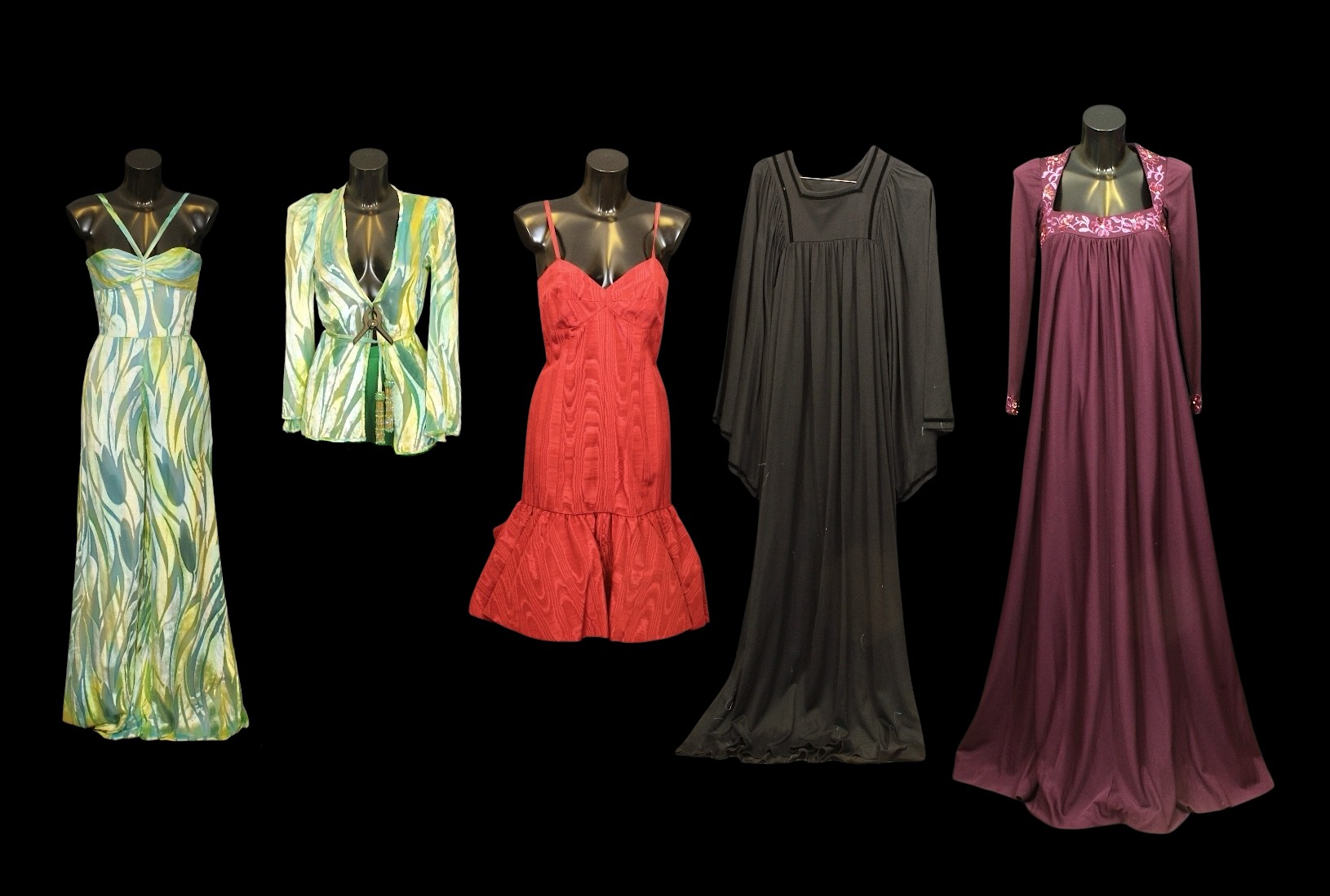 including: a blue / green / yellow jumpsuit, with velour type flame motif, wide trouser leg with matching beaded belt, waist flat 31cm with a matching jacket; a red watered silk effect dress, with spaghetti straps, and crinoline type underskirts, waist flat 38cm, an Elle Trevari Fibre black maxi dress, long sleeves, velvet trimmed, size 10; a plum coloured maxi dress, with metallic thread and sequin embellishments to bodice and cuffs (5)