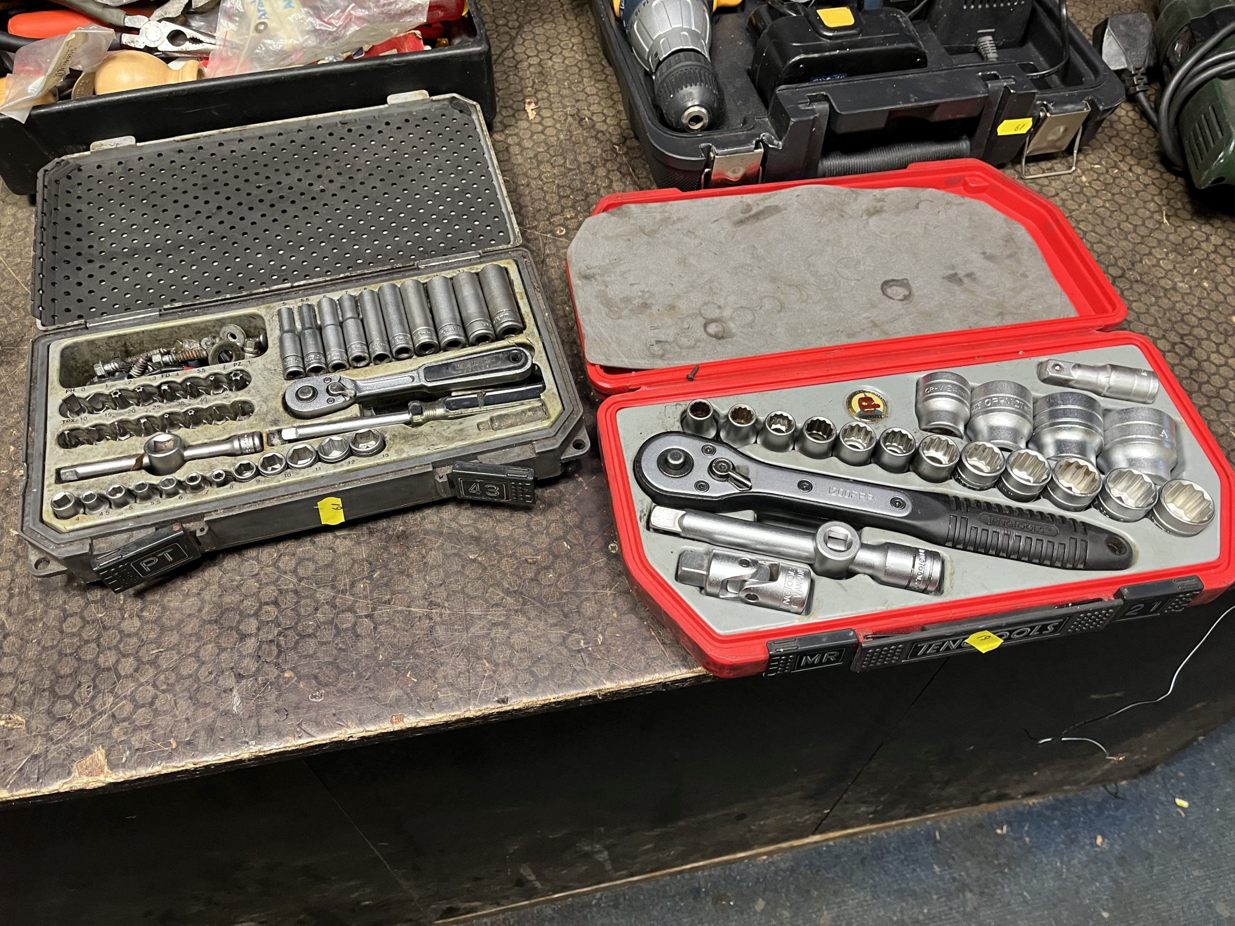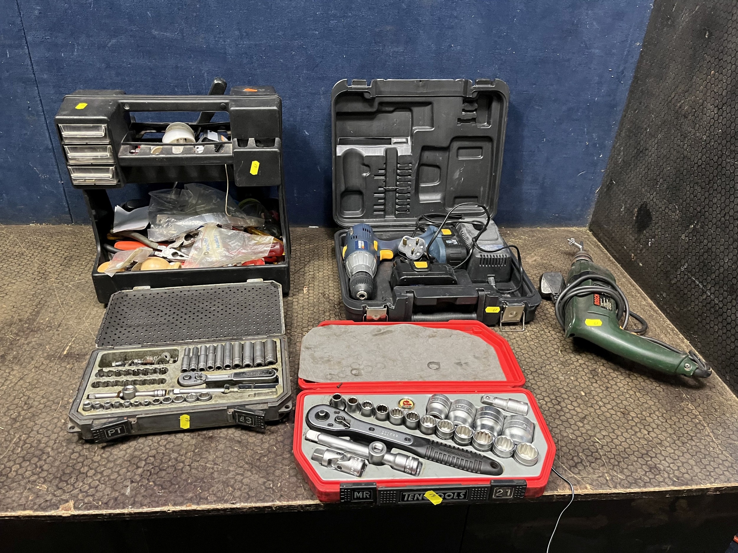 A COLLECTION OF TOOLS, including two Teng tools socket sets, a Bosch drill and a Power Craft cordless drill (both PAT pass and working), etc