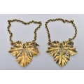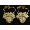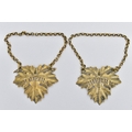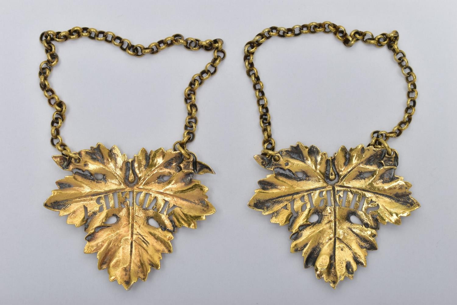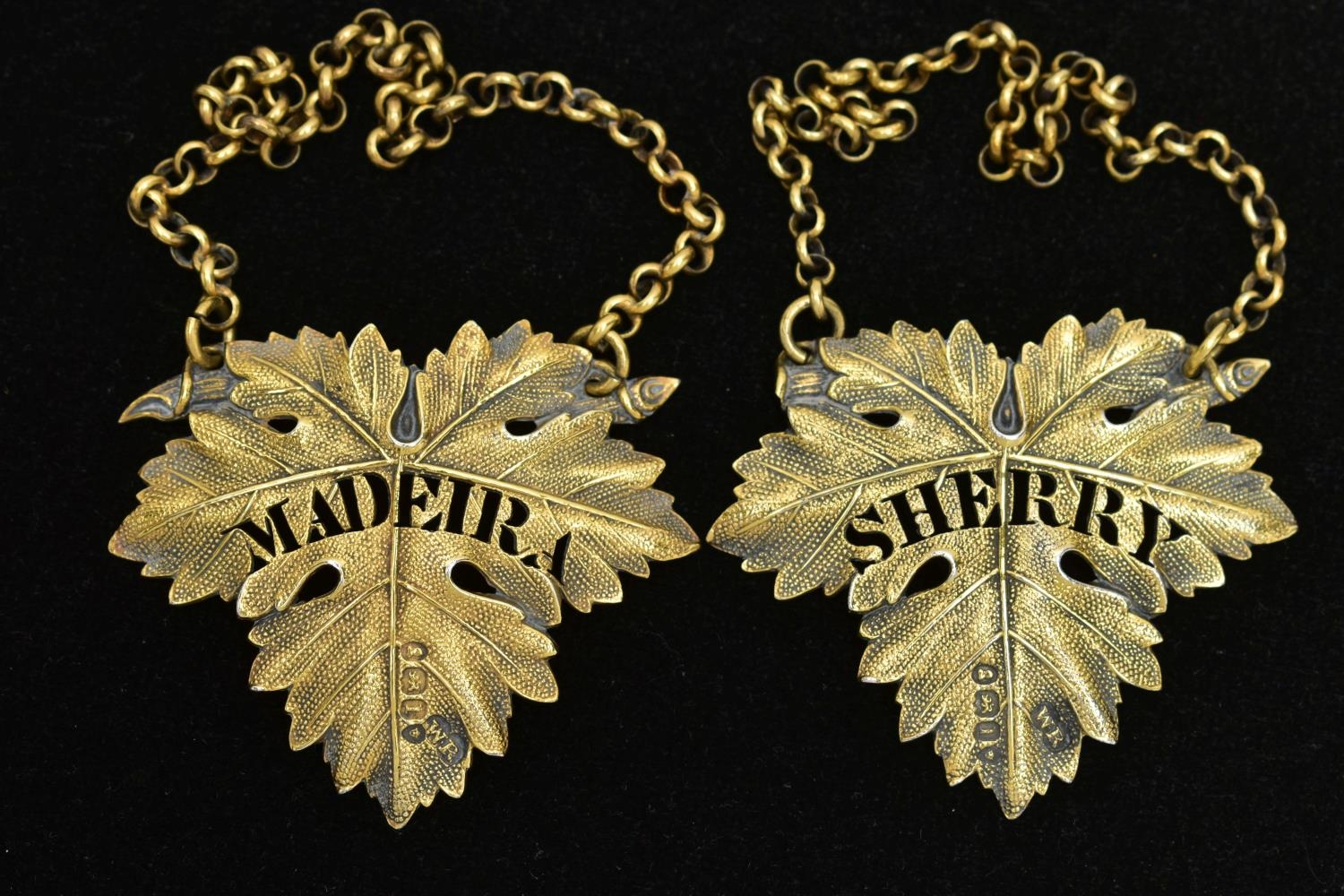 A PAIR OF GEORGE IV SILVER GILT DECANTER LABELS, cast as vine leaves, named for 'SHERRY' and 'MADEIRA', maker William Ker Reid, London 1826, gross weight 0.91ozt, 28.2 grams (2) (Condition report: the Sherry label is missing a point of a twig to the left hand side chain, otherwise other than collections of polish they are in good condition)