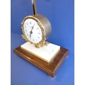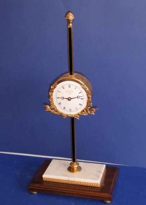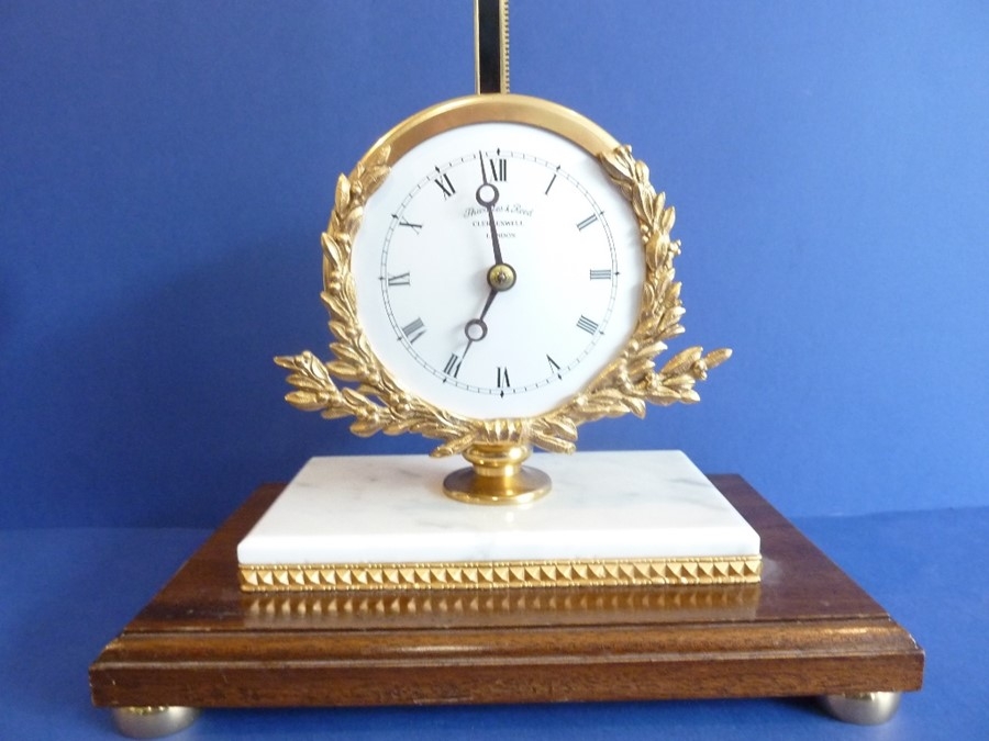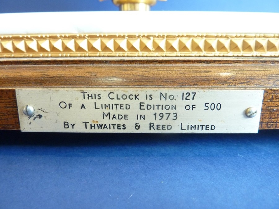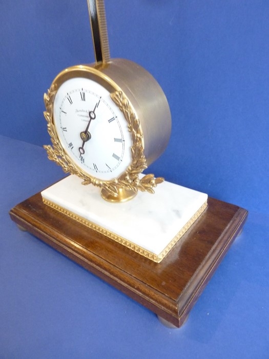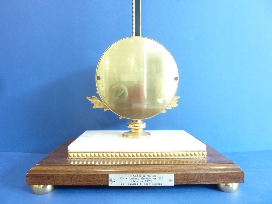 A gravity timepiece 'rise & fall' clock by Thwaites & Reed Ltd, Clerkenwell, London, limited edition no. 127/500, made in 1973, white-enamel dial with Roman numerals surrounded with a gilded laurel-leaf garland, raised on gilt-metal mounted white marble and mahogany plinth base with squat, gilded bun feet (54cm high)