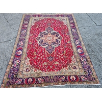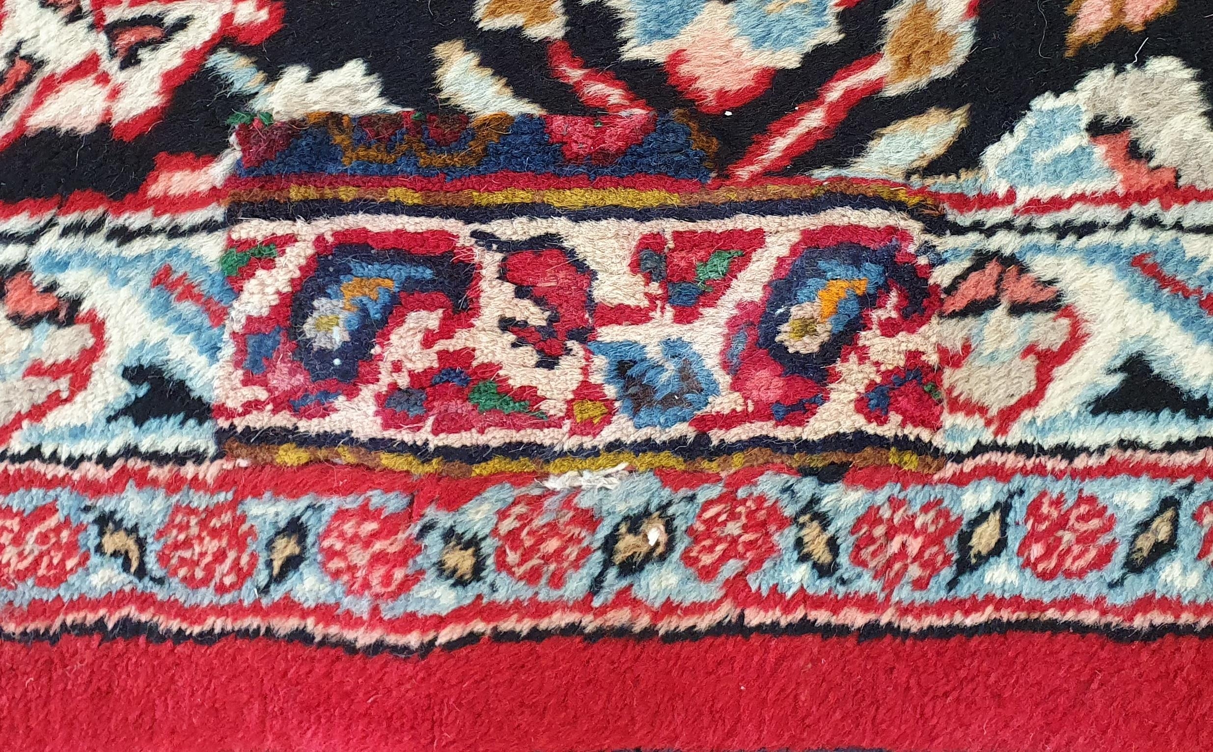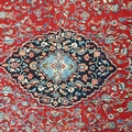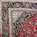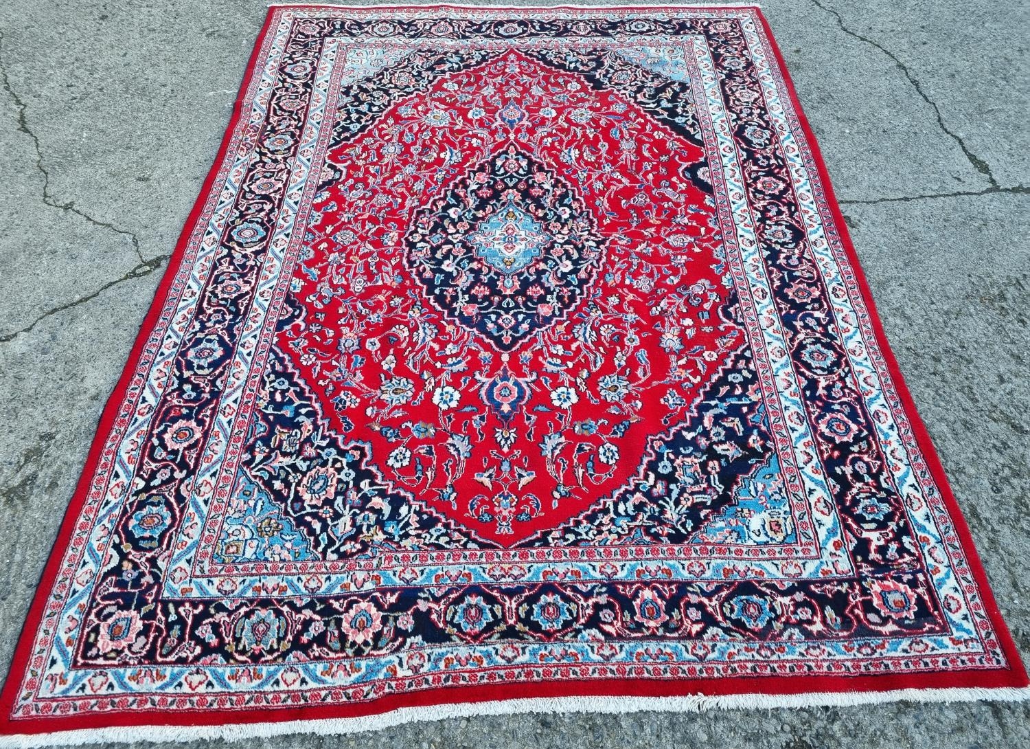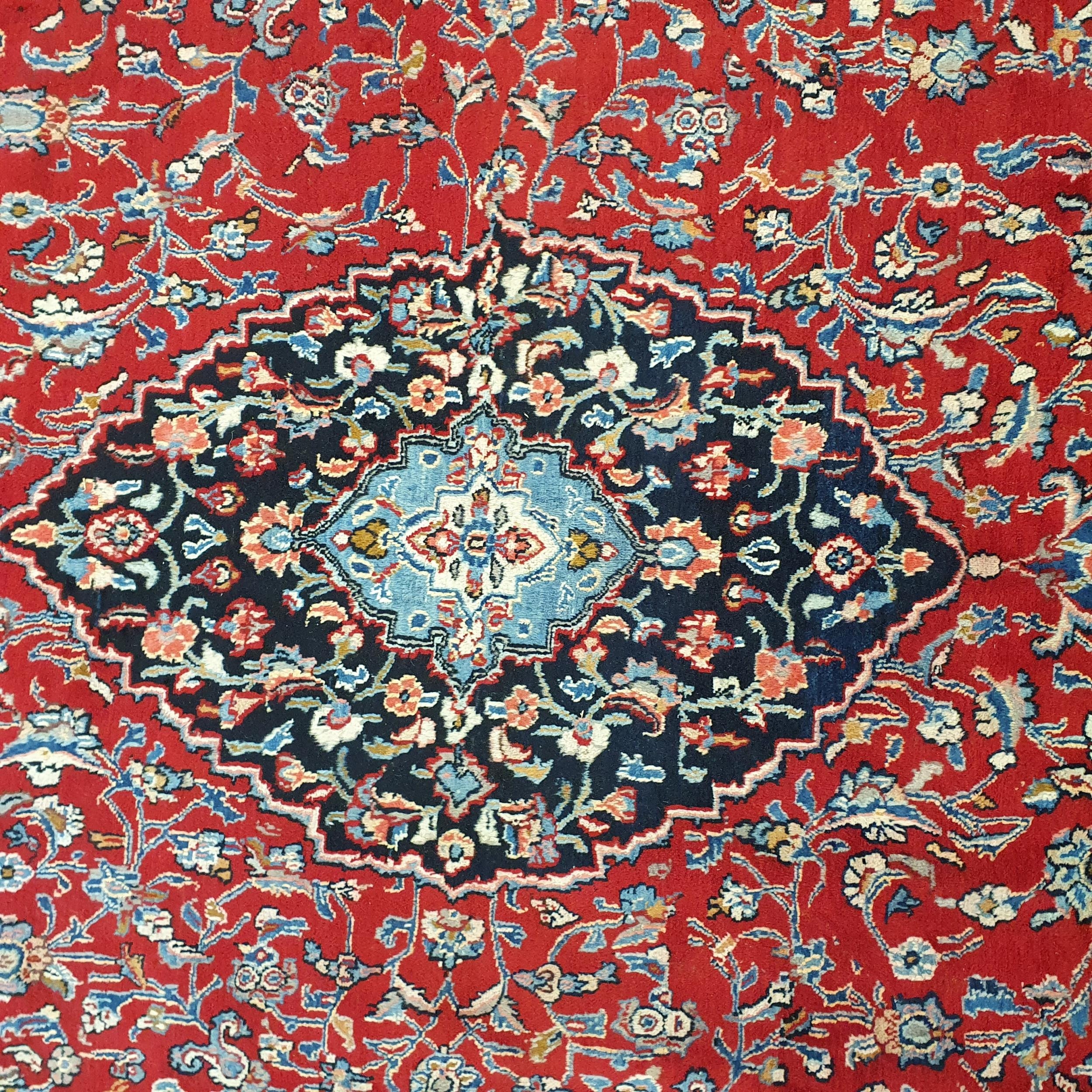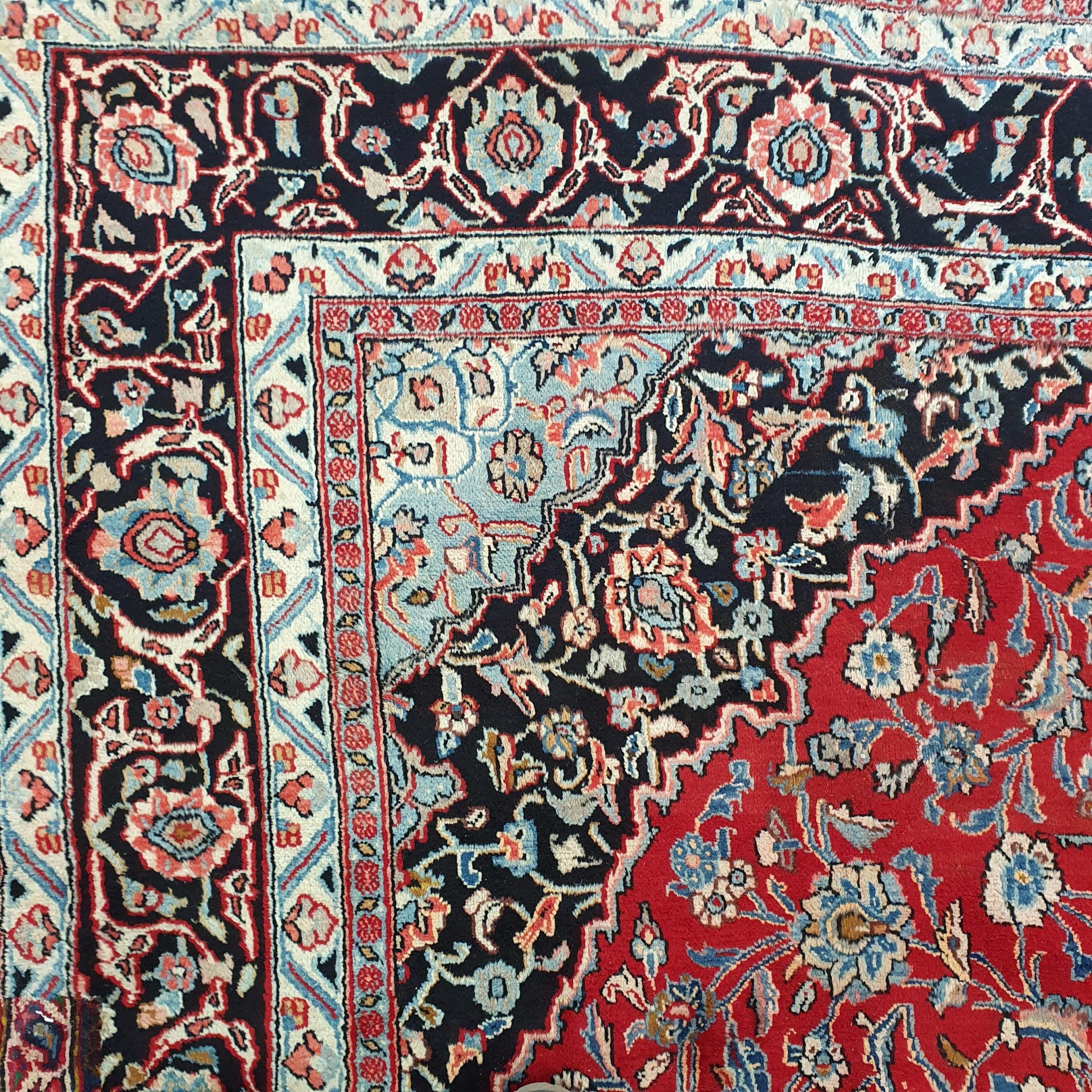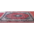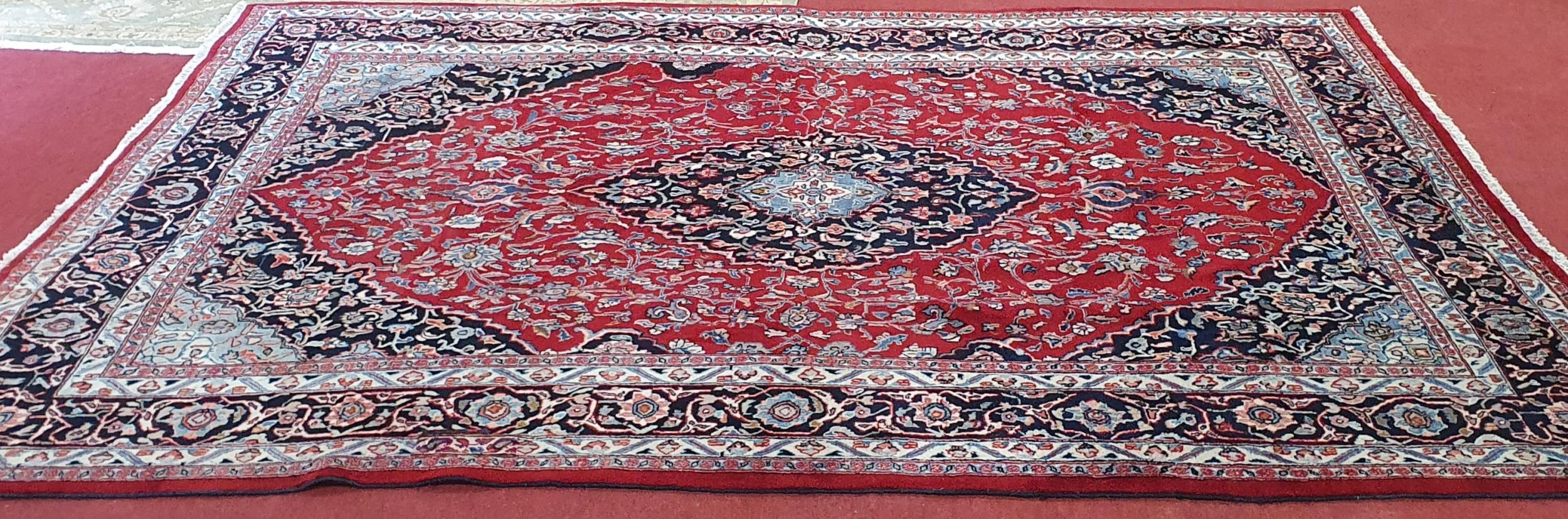 A really good quality Red ground Persian Kashan Carpet with a traditional Kashan design with blue borders. 333 x 245 cm approx.