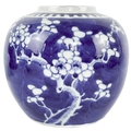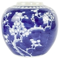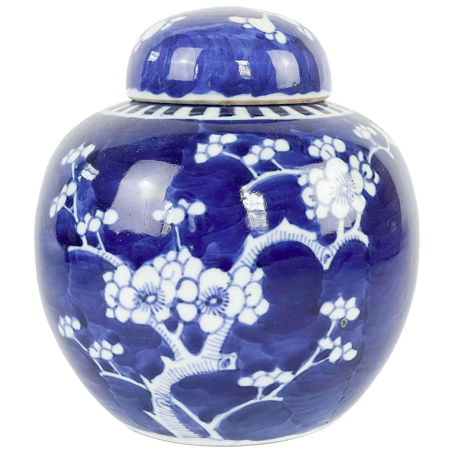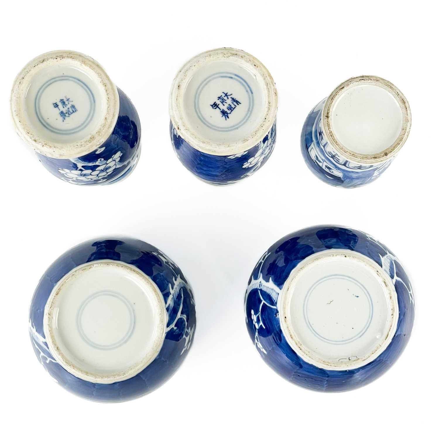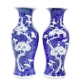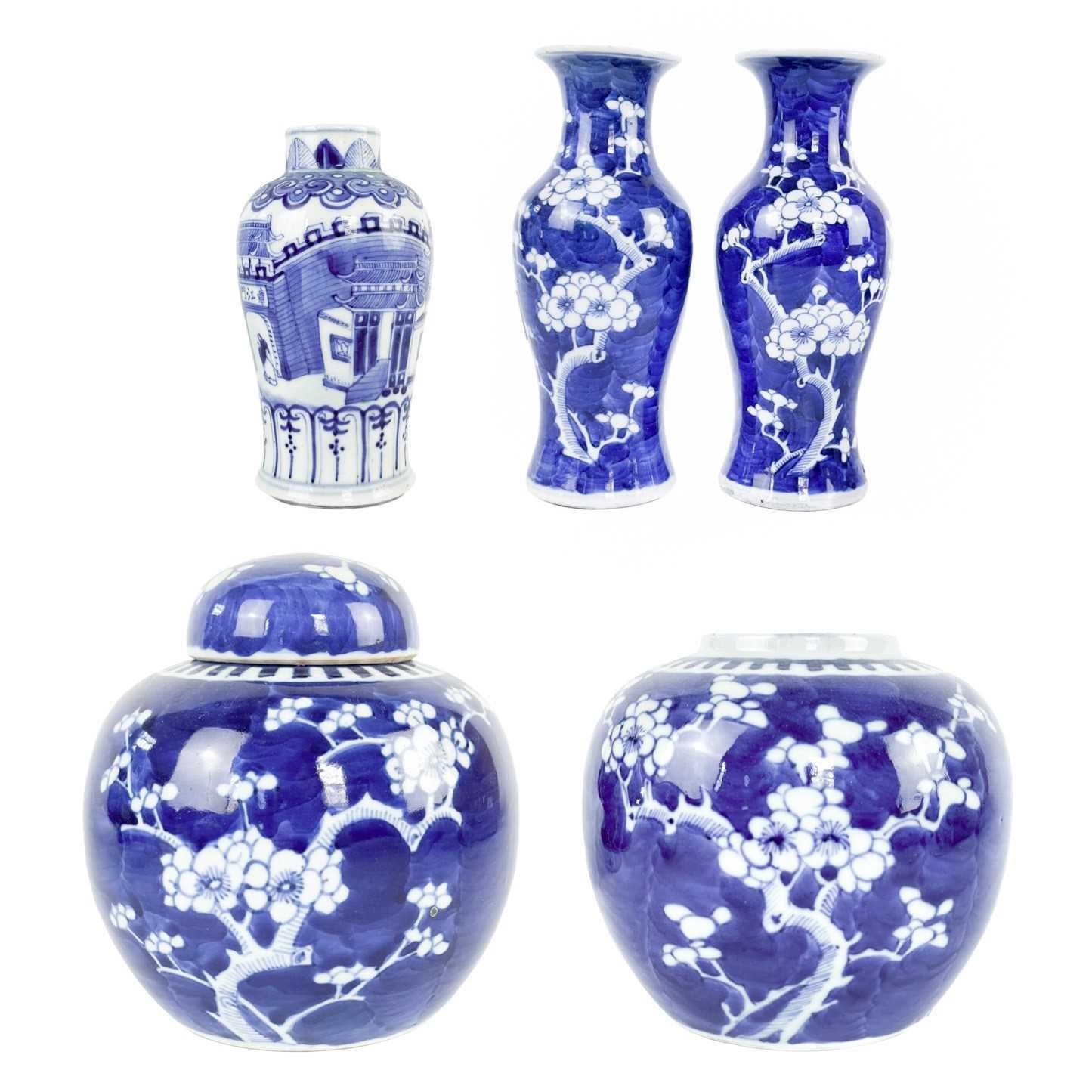 Two Chinese porcelain prunus pattern vases, late 19th century. Height 20.5cm, width 7.5cm, two Chinese prunus pattern ginger jars, (one cover lacking) height 14.5cm, diameter 12cm and a Chinese blue and white porcelain baluster vase, height 15cm, width 7.5cm. (5) The ginger jars show sign of restoration to the lip and age-related marks to the base. One of the prunus vases has a 1cm chip to the lip and nibbles to the base are evident on both. The baluster vase also has a 1cm chip to the lip.