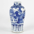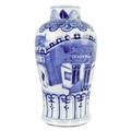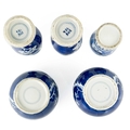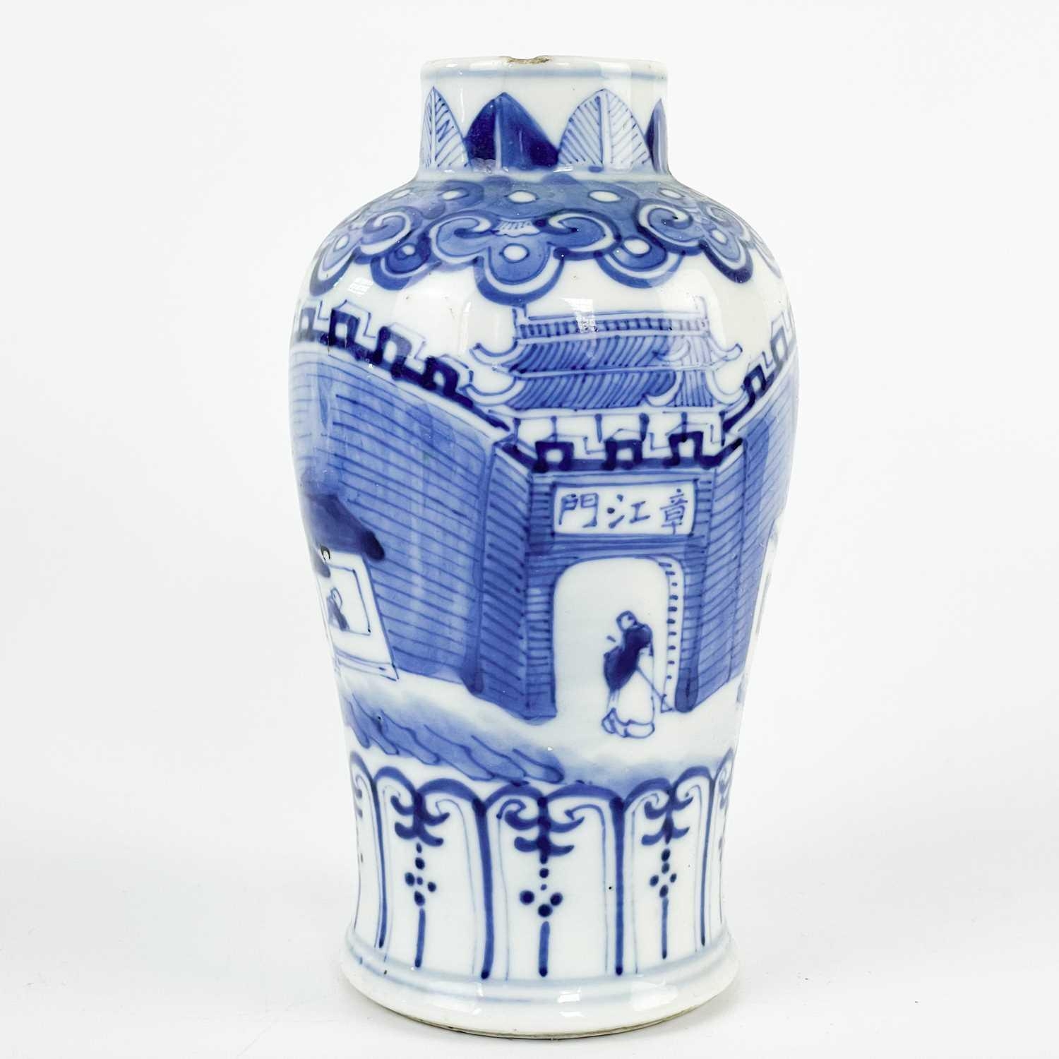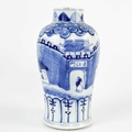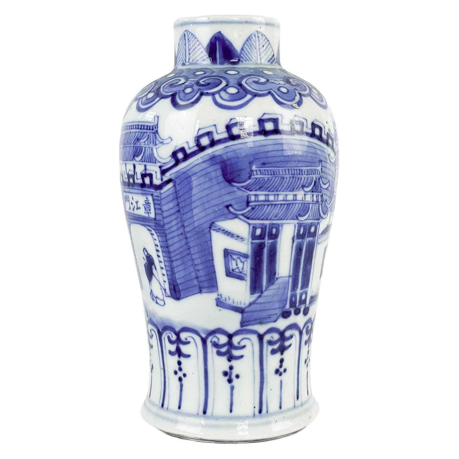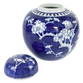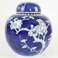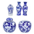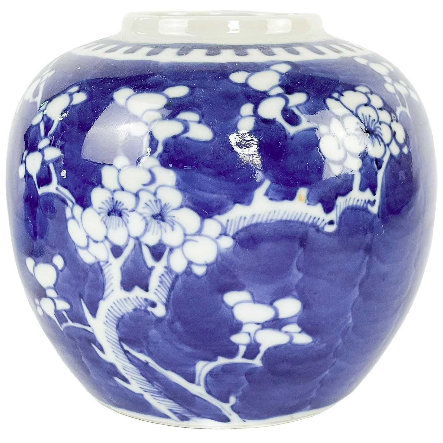 Two Chinese porcelain prunus pattern vases, late 19th century. Height 20.5cm, width 7.5cm, two Chinese prunus pattern ginger jars, (one cover lacking) height 14.5cm, diameter 12cm and a Chinese blue and white porcelain baluster vase, height 15cm, width 7.5cm. (5) The ginger jars show sign of restoration to the lip and age-related marks to the base. One of the prunus vases has a 1cm chip to the lip and nibbles to the base are evident on both. The baluster vase also has a 1cm chip to the lip.
