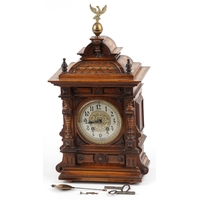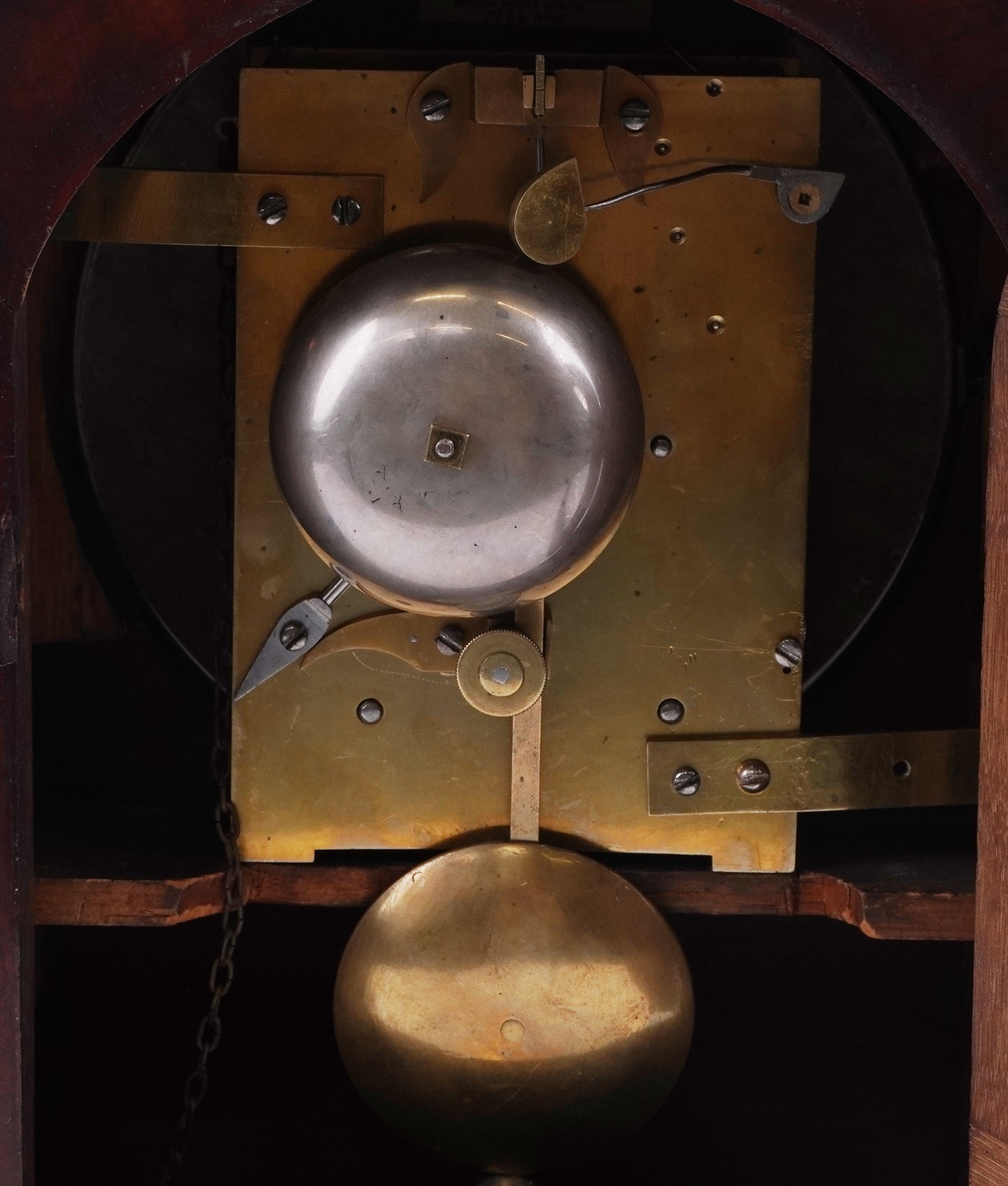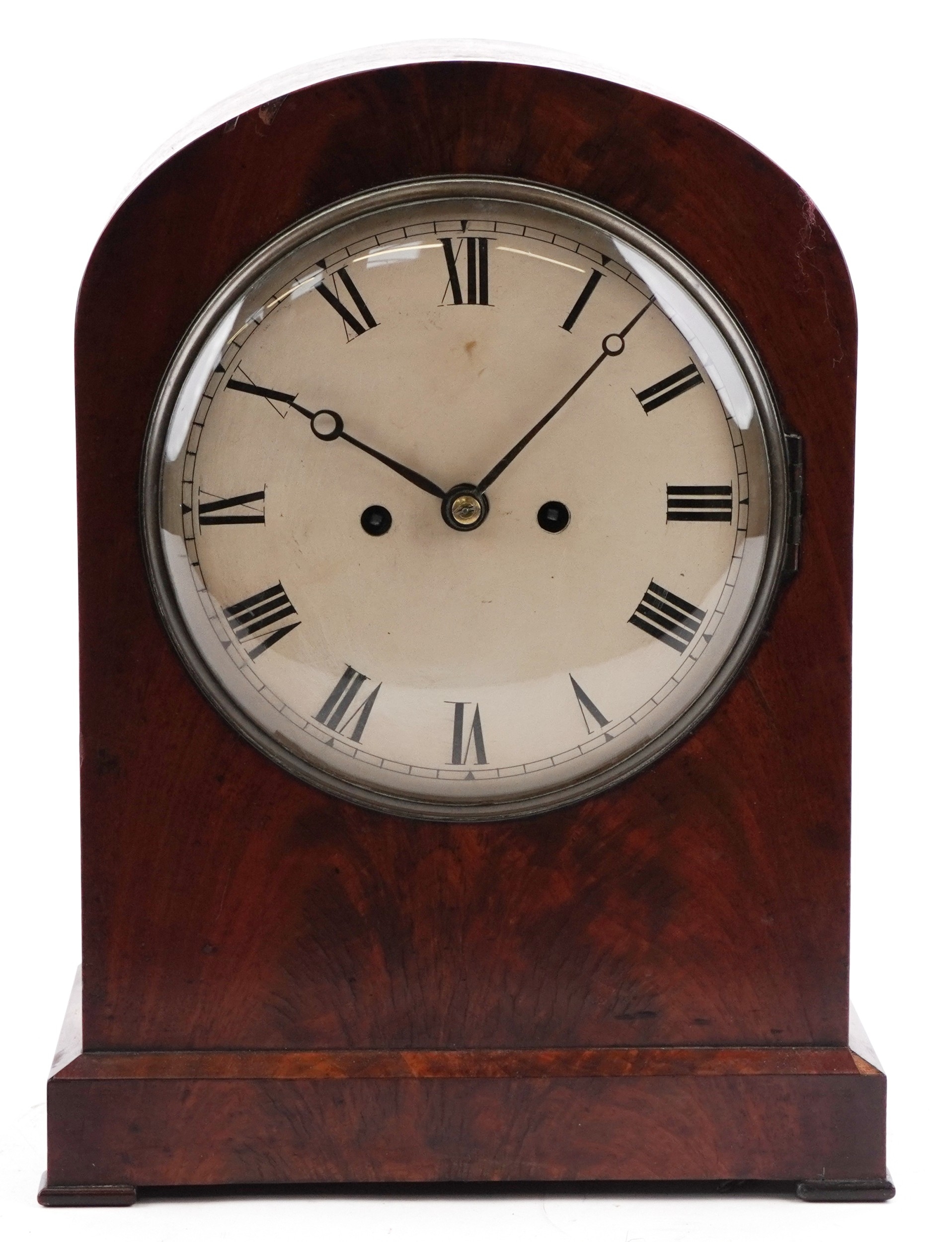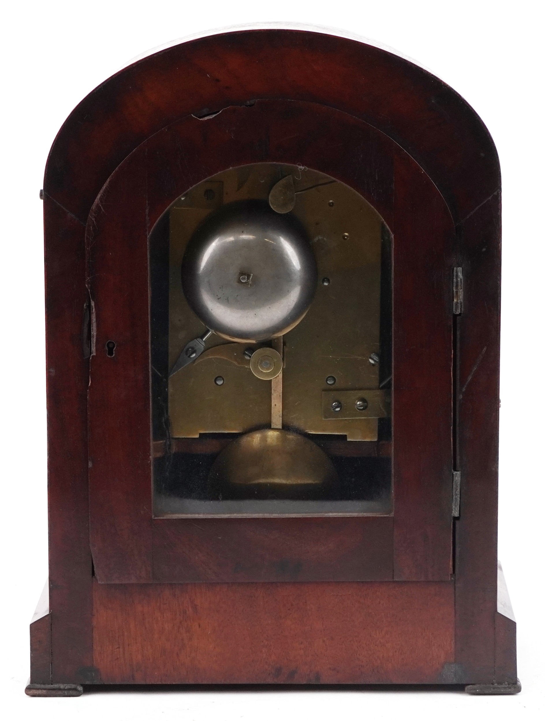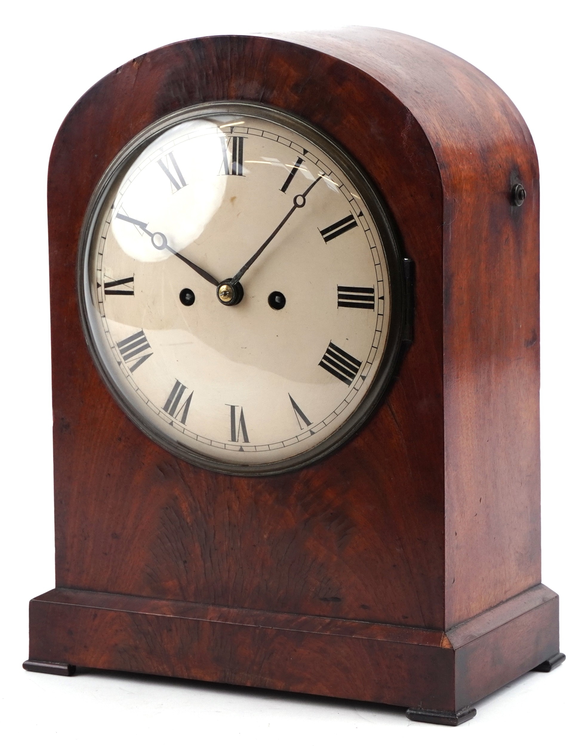An antique mahogany twin fusée repeating bracket clock striking on a bell, the painted dial having Roman numerals, 38cm high.