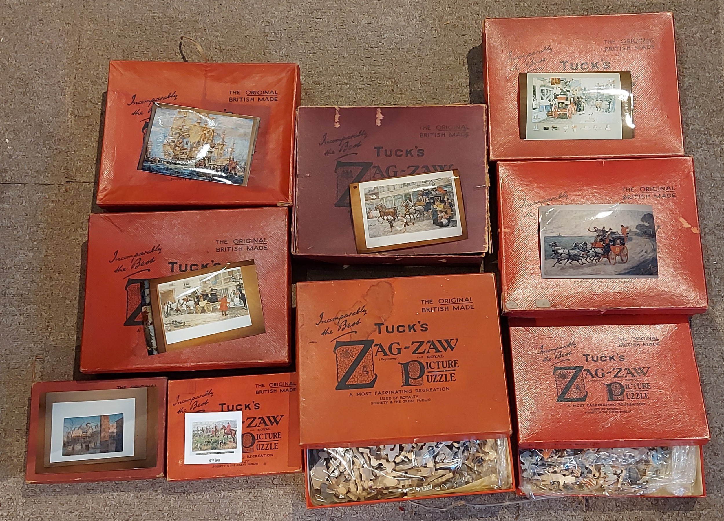 A Raphael Tuck and Sons Jigsaw puzzle David Copperfield On His Way To School together with another First Sight Of London and six other Zag-Zaw puzzles